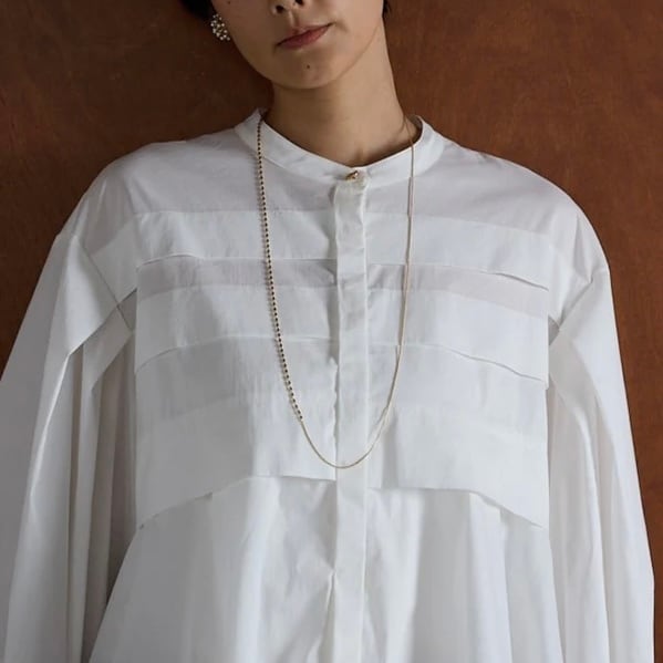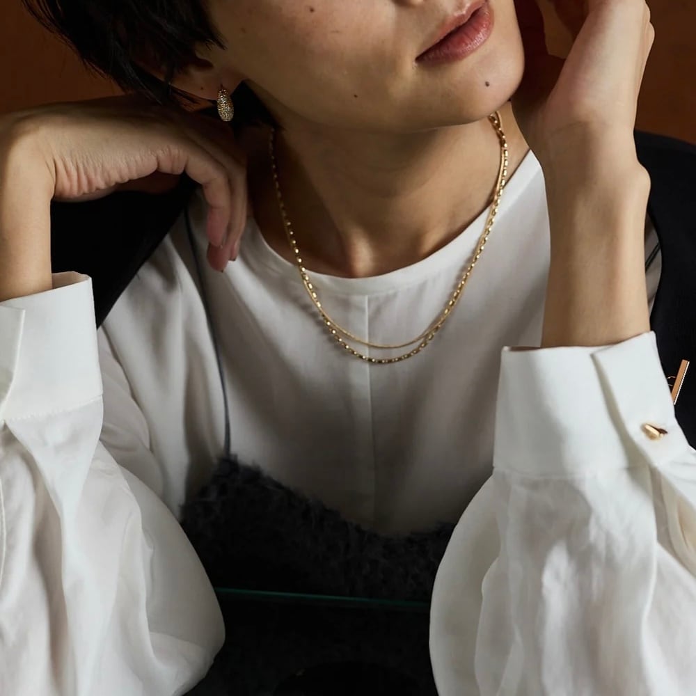 2種類のチェーンが繋がったロングチェーンネックレスは、1連や2連にしてつけたり、前で結んで垂らしたり、Y字にしたりと様々な付け方を愉しめます。オリジナルのマンテル金具はチェーンの華奢さを邪魔しないよう極小サイズで製作しています。0056-521SHの淡水パールネックレスにも同じマンテル金具を使用していますので、それぞれ2本を繋げてぐるぐるとミックス巻きすると首元が一気に華やかに◎