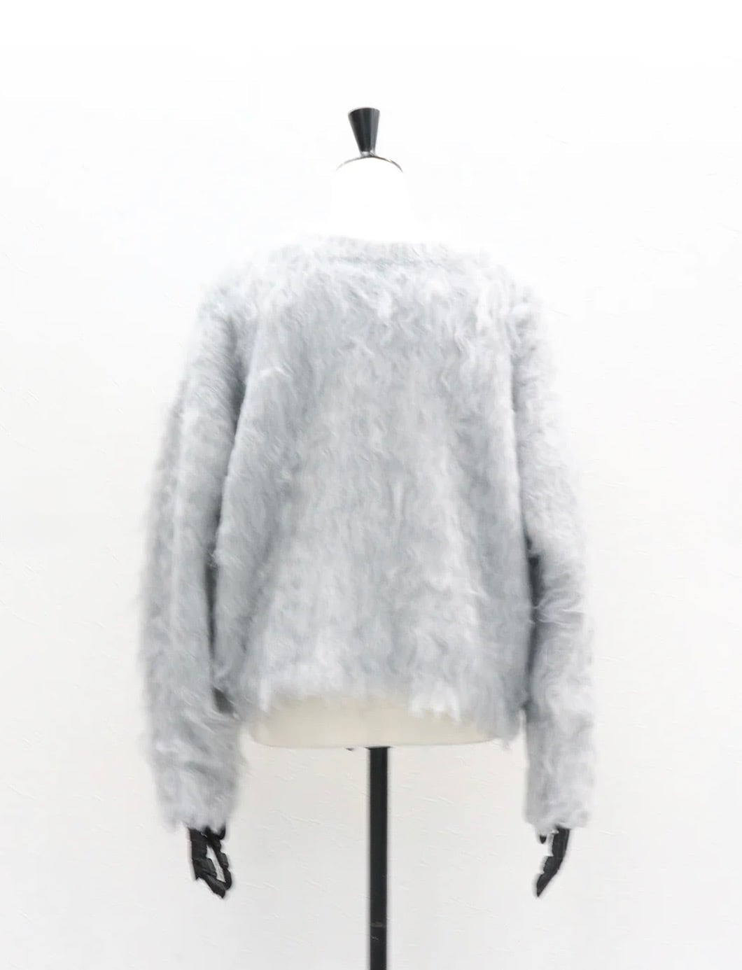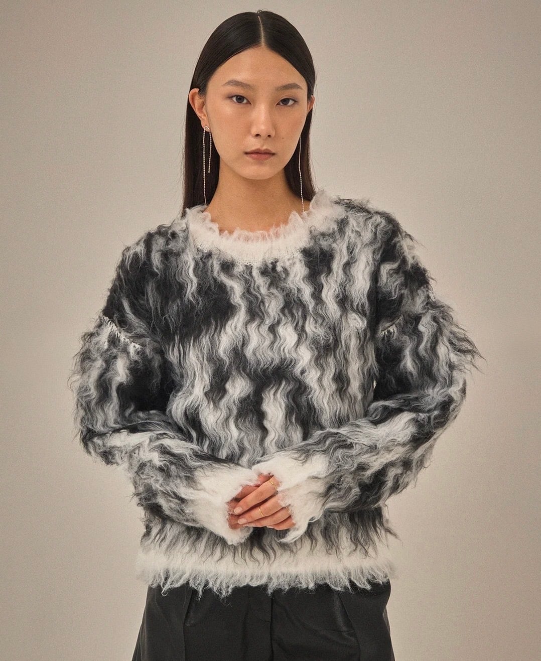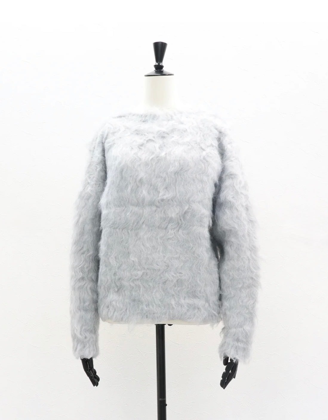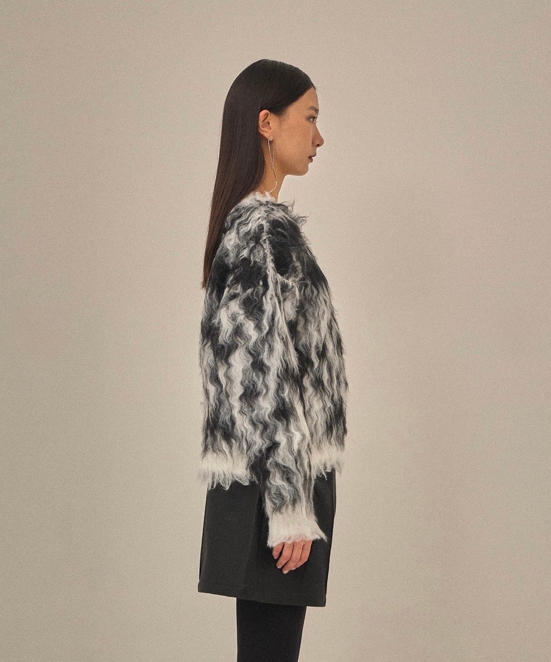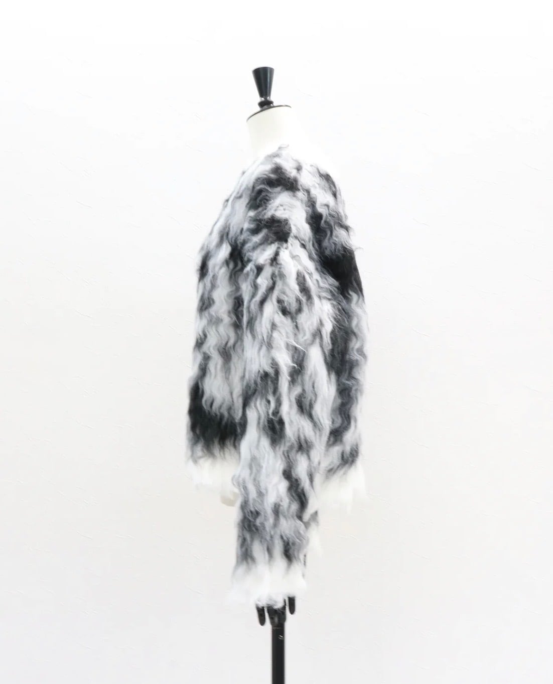 毛足の長い犬の柔らかな被毛をイメージした、ふんわりとしたファジーニット。波打つようにランダムに流れる編み地が、どの角度から見ても動きと立体感を生み出し、見る人の視線を惹きつけます。ウールを含んだふっくらとした肌触りは、軽やかなのにしっかりと暖かく、寒さから優しく身体を包み込みます。纏うだけでスタイルに奥行きをもたらす、アニマルスピリットを秘めた個性的な一着です。