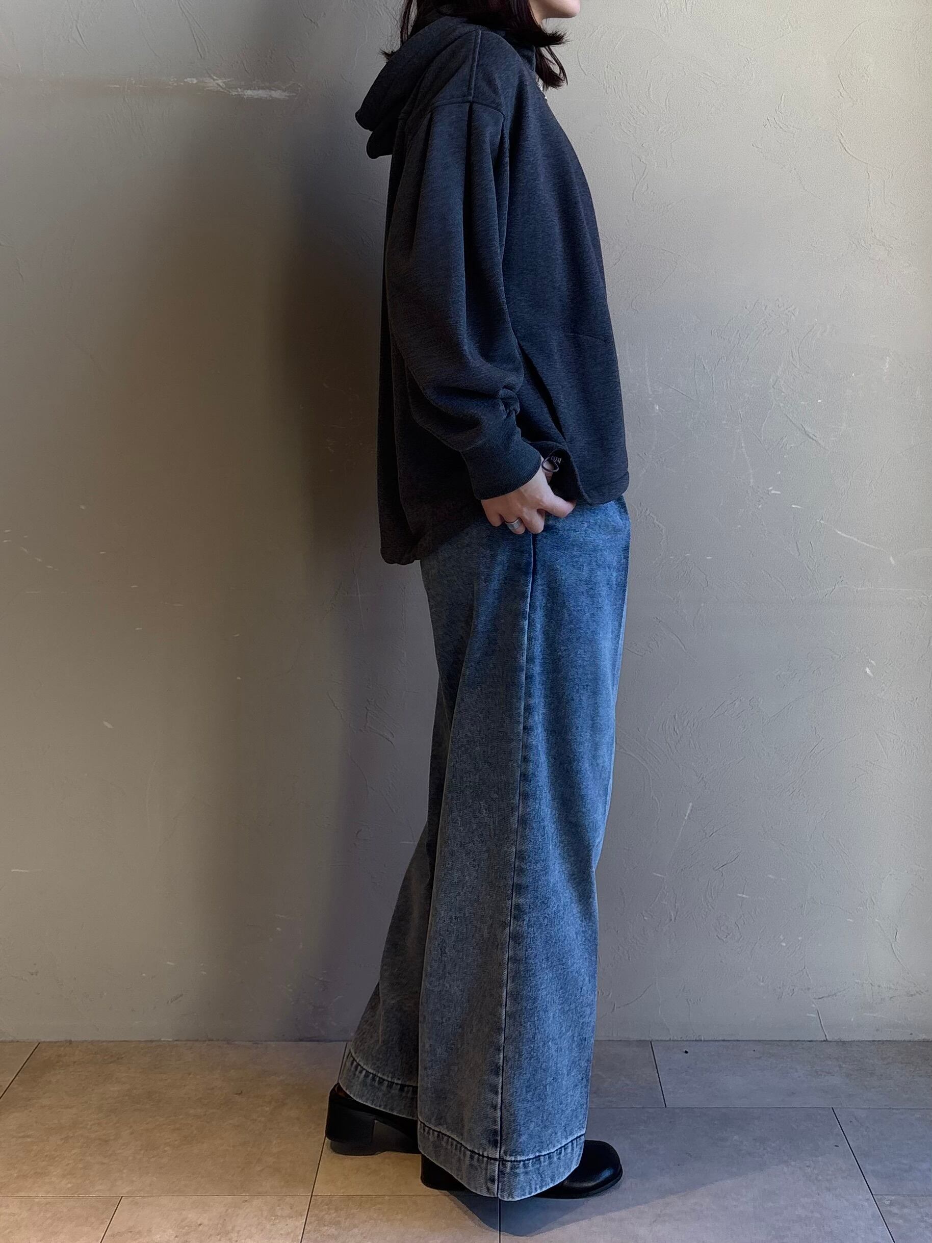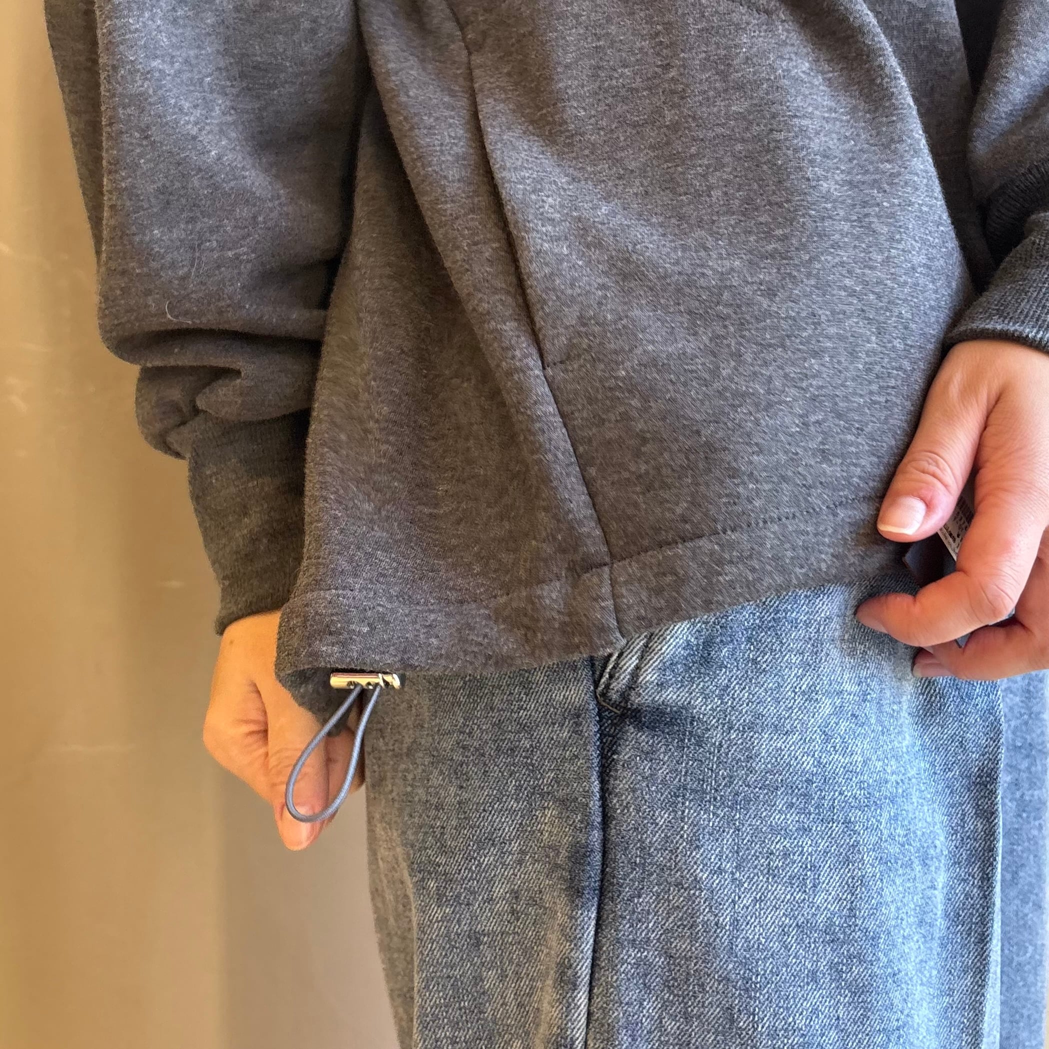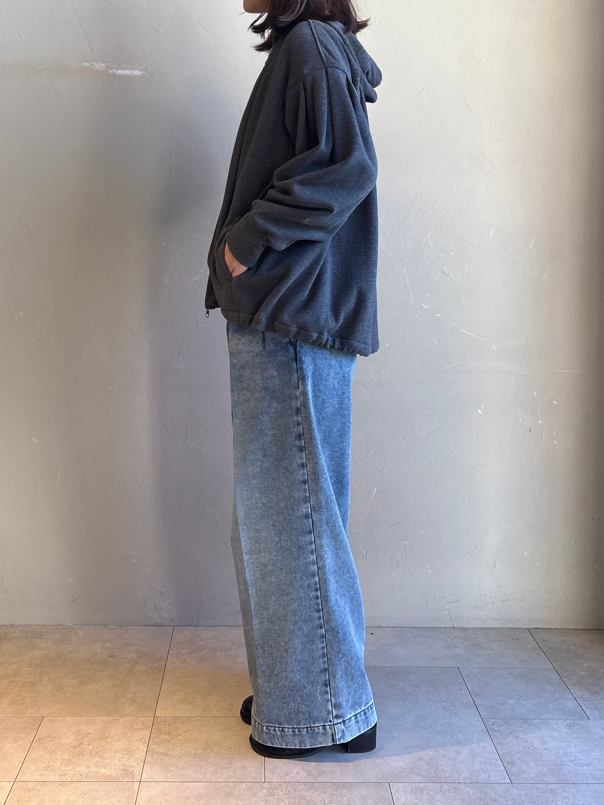 裾のドロストで丈感を調整でき、ワイドパンツにも好相性。フードの立ち上がりも上品で、小顔見えをさりげなくサポート。