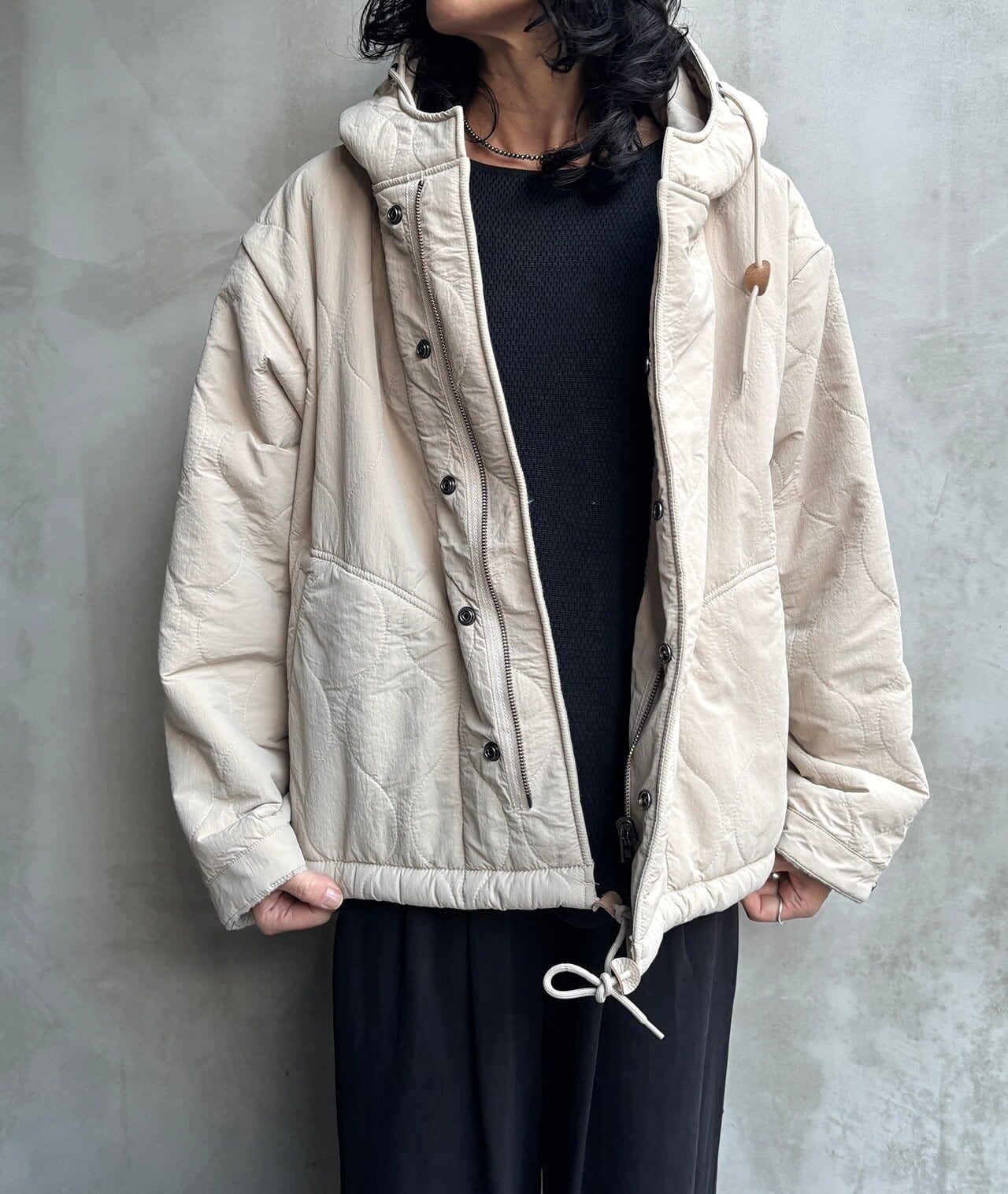 キルティングナイロン×ボアのリバーシブルジャケット。ヒップが隠れるくらいの丈感で少しAラインよりの形になっておりますが裾にドローコードが入っていますので絞って丸いシルエットにしても可愛く着ていただけます。ボア側にはバックプリントのロゴが入りシンプルになりがちな冬のコーディネートのポイントになってくれます。オフ、モカ、ブラックの3色になります。