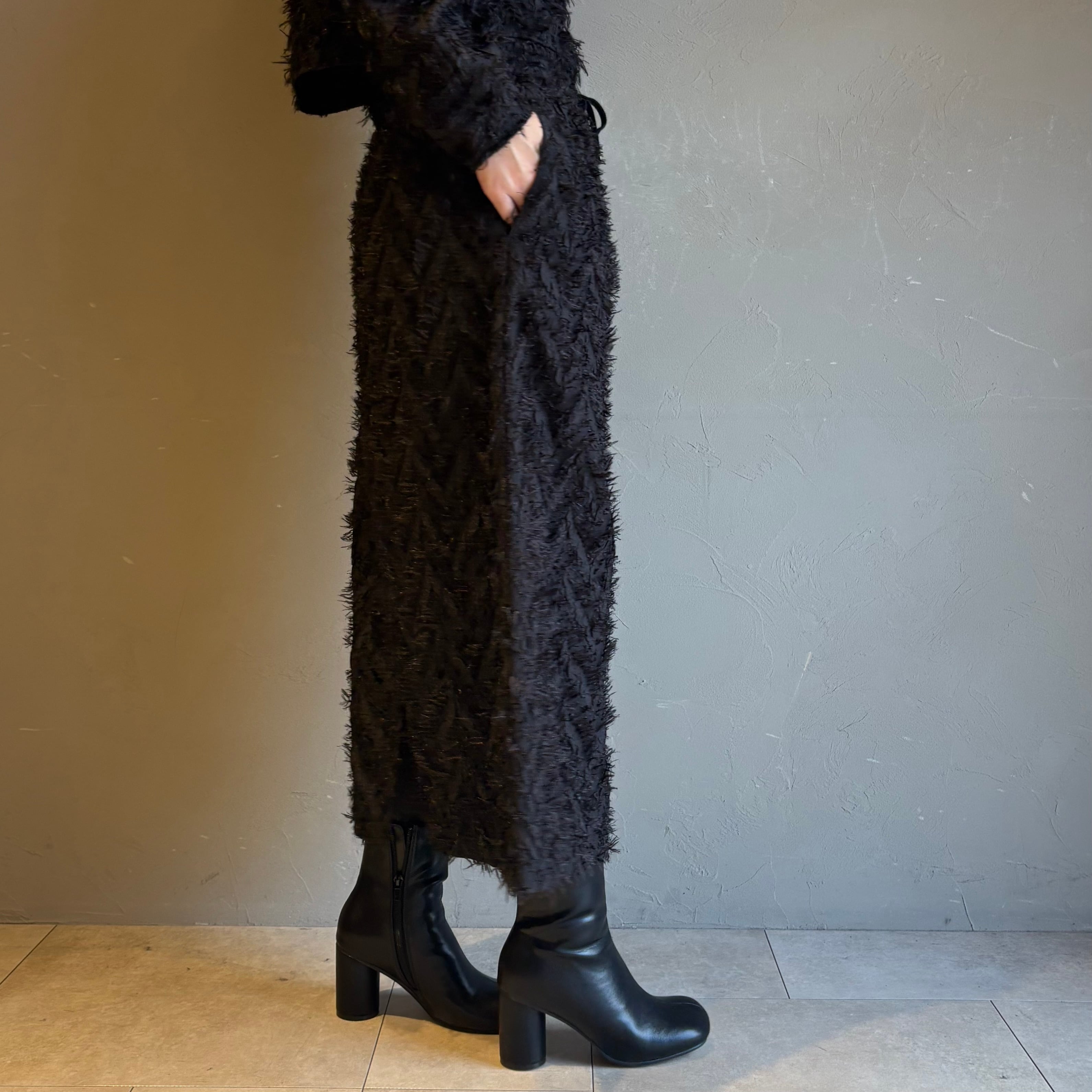 ストレートのシルエット、上品で存在感のあるデザインです。足さばきのしやすいスリットが後ろに入っているのも嬉しいポイント◎