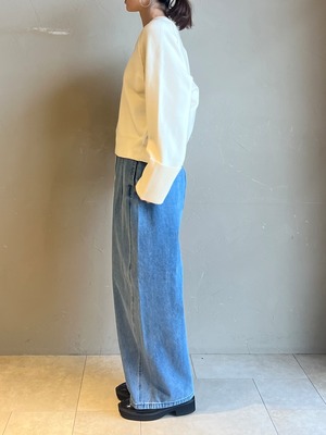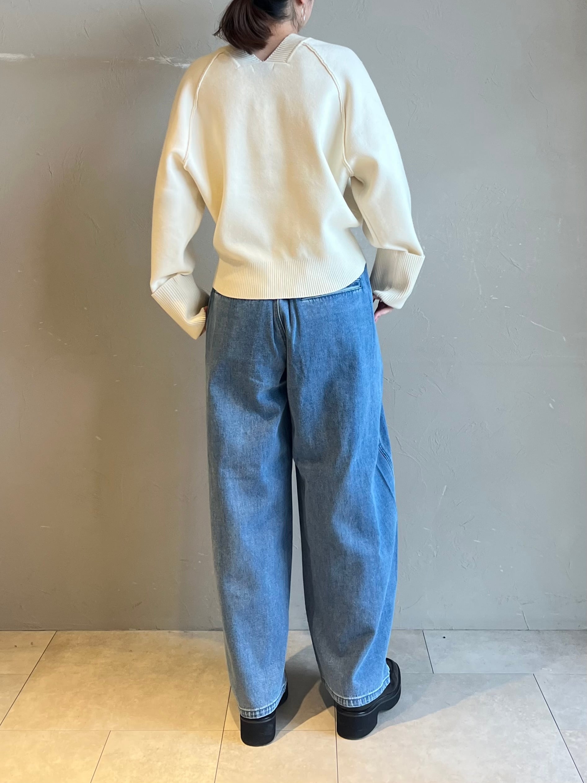 ほどよい深さのVネックで首元がすっきり、クロップド丈が腰位置を高く見せて脚長バランスに。