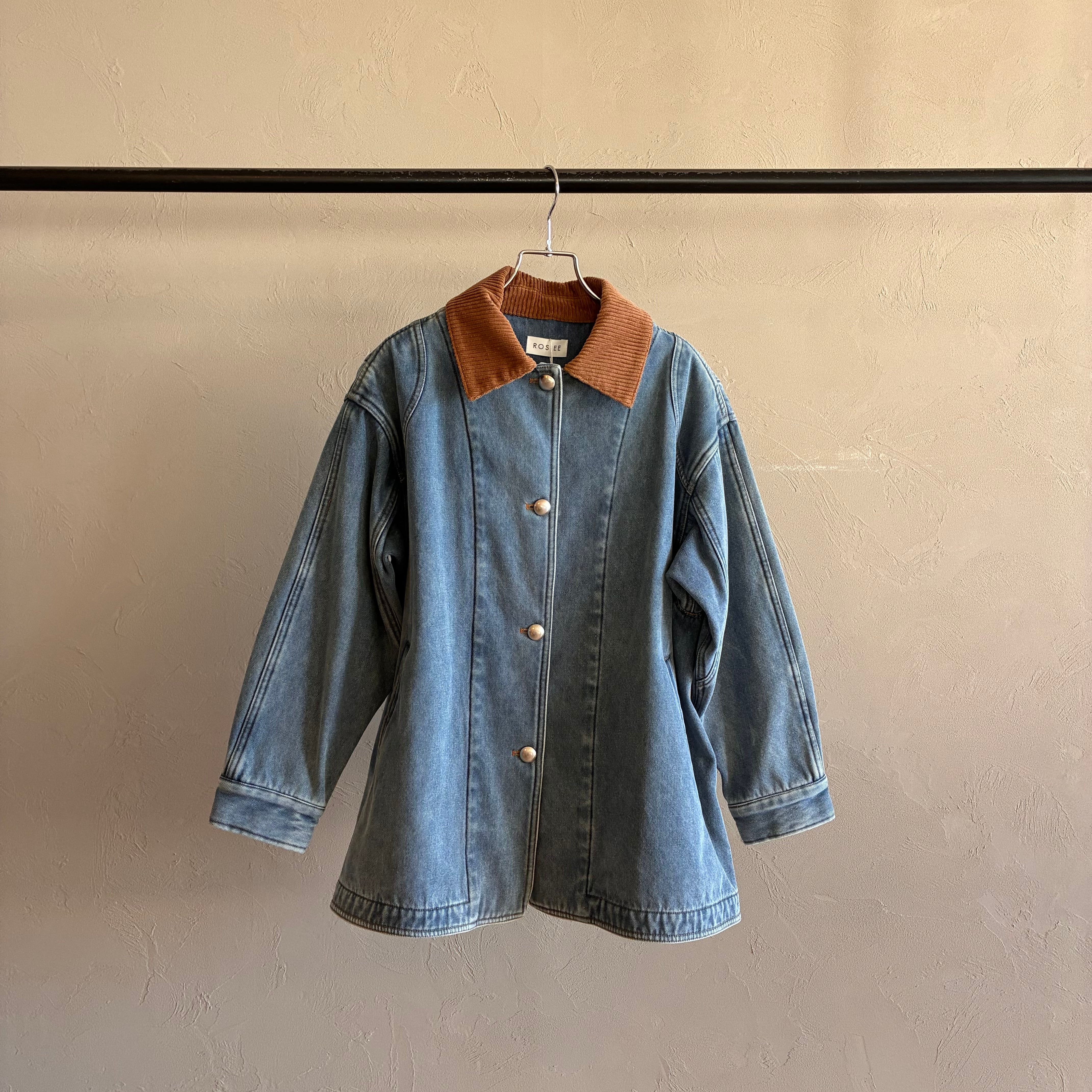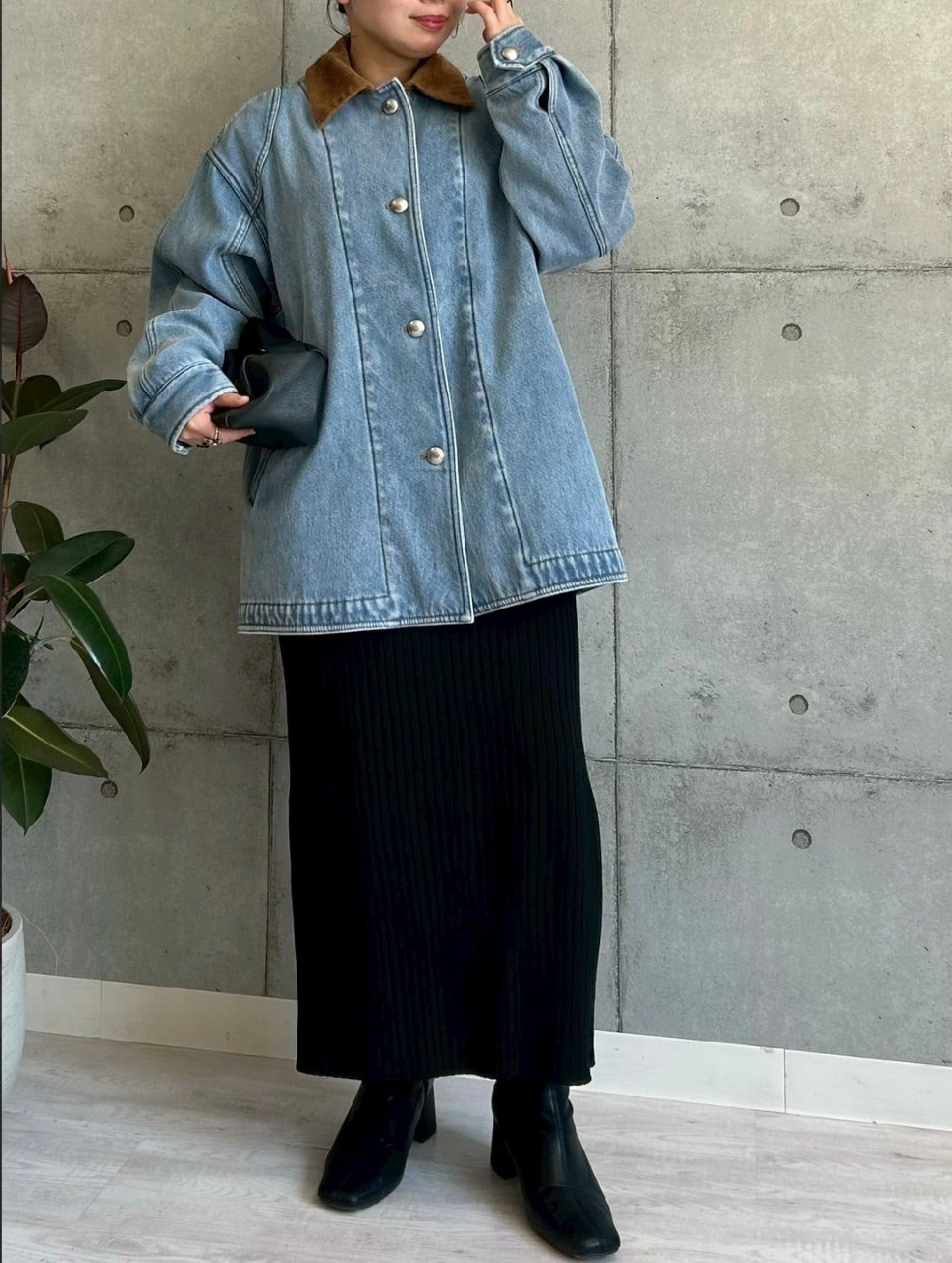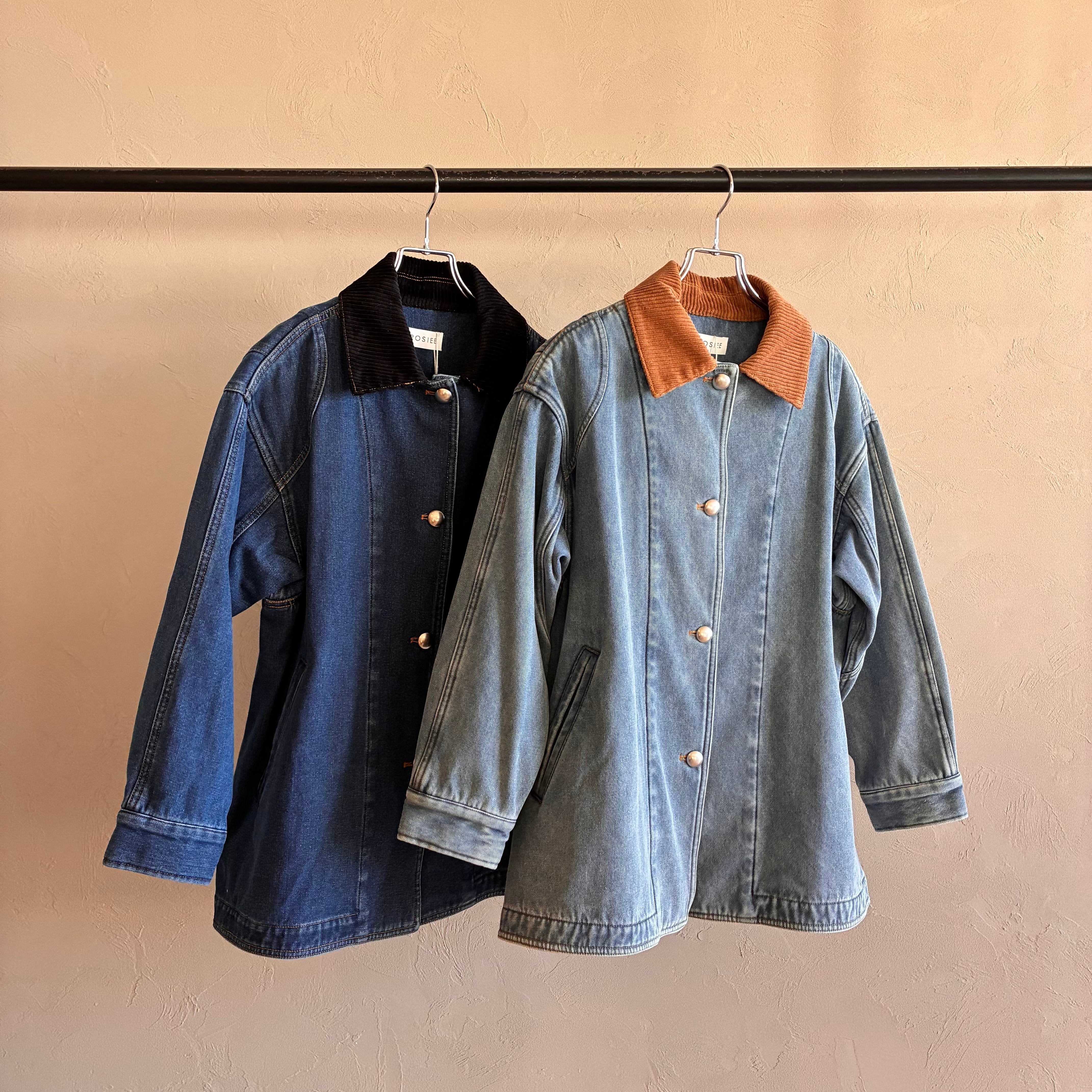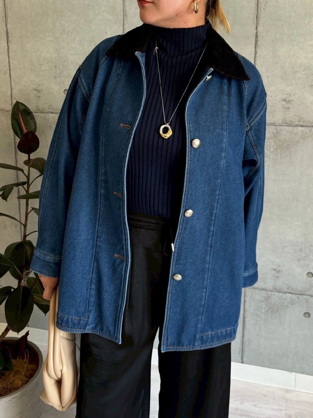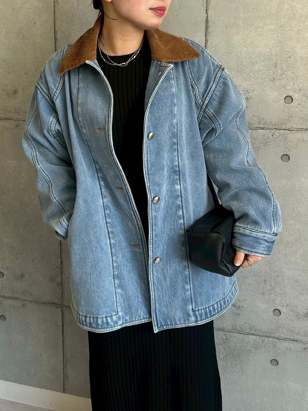 今年トレンドのデニム素材に加え、衿部分には秋らしいコーデュロイ素材をあしらった異素材切り替えがポイントです。