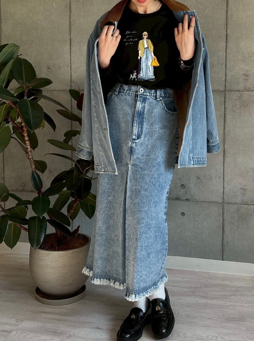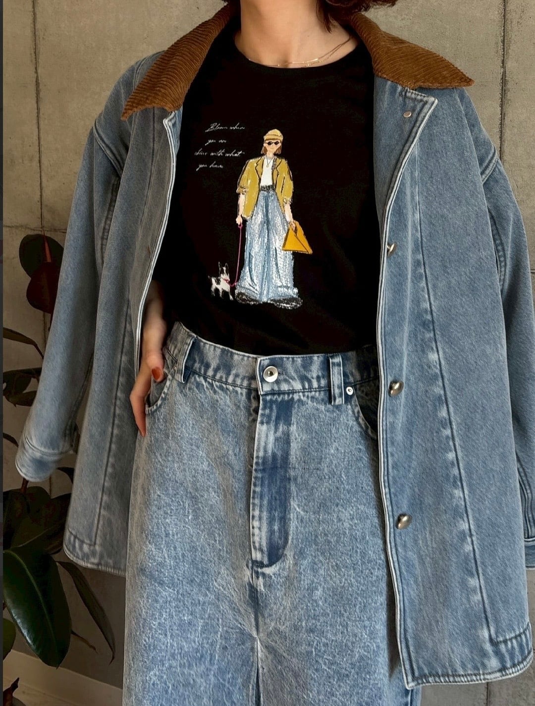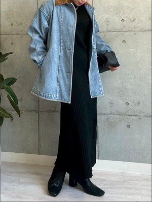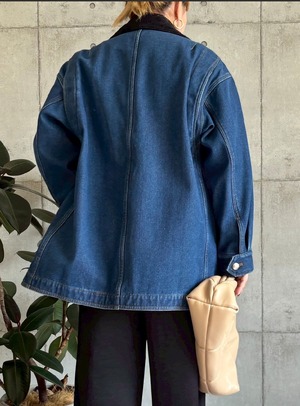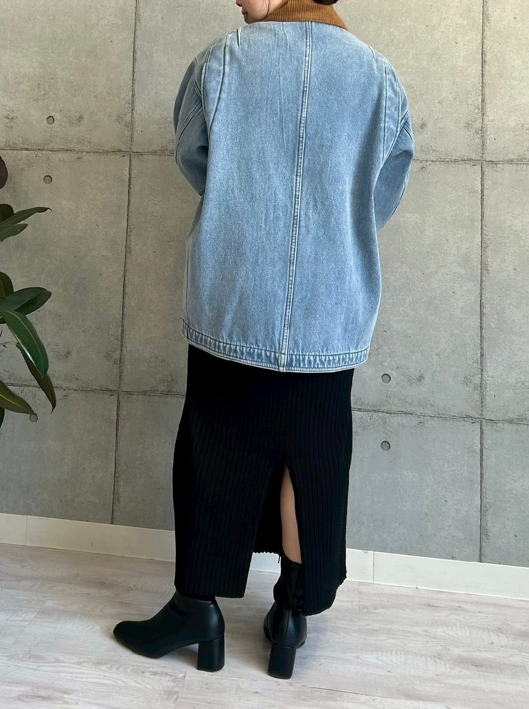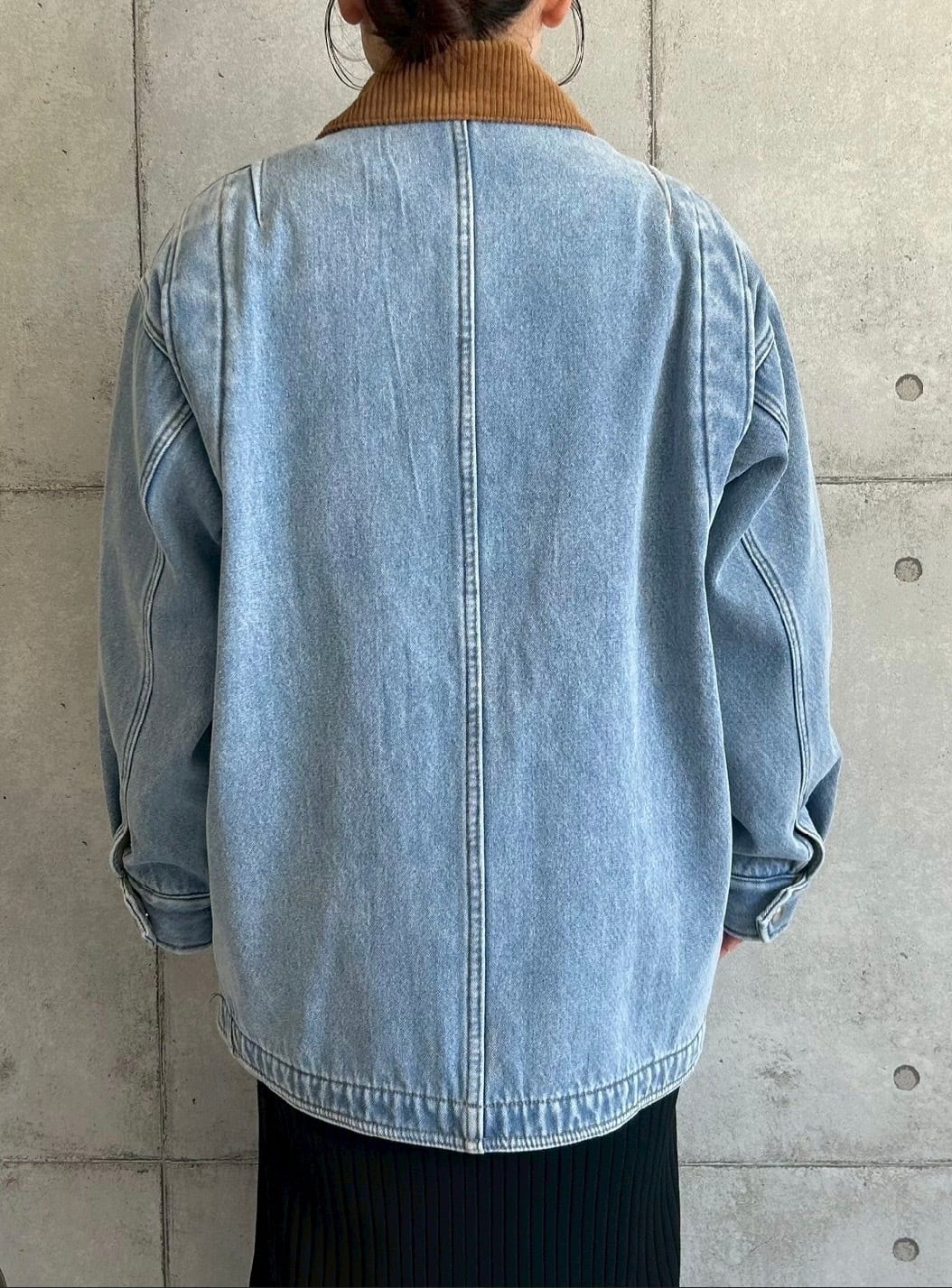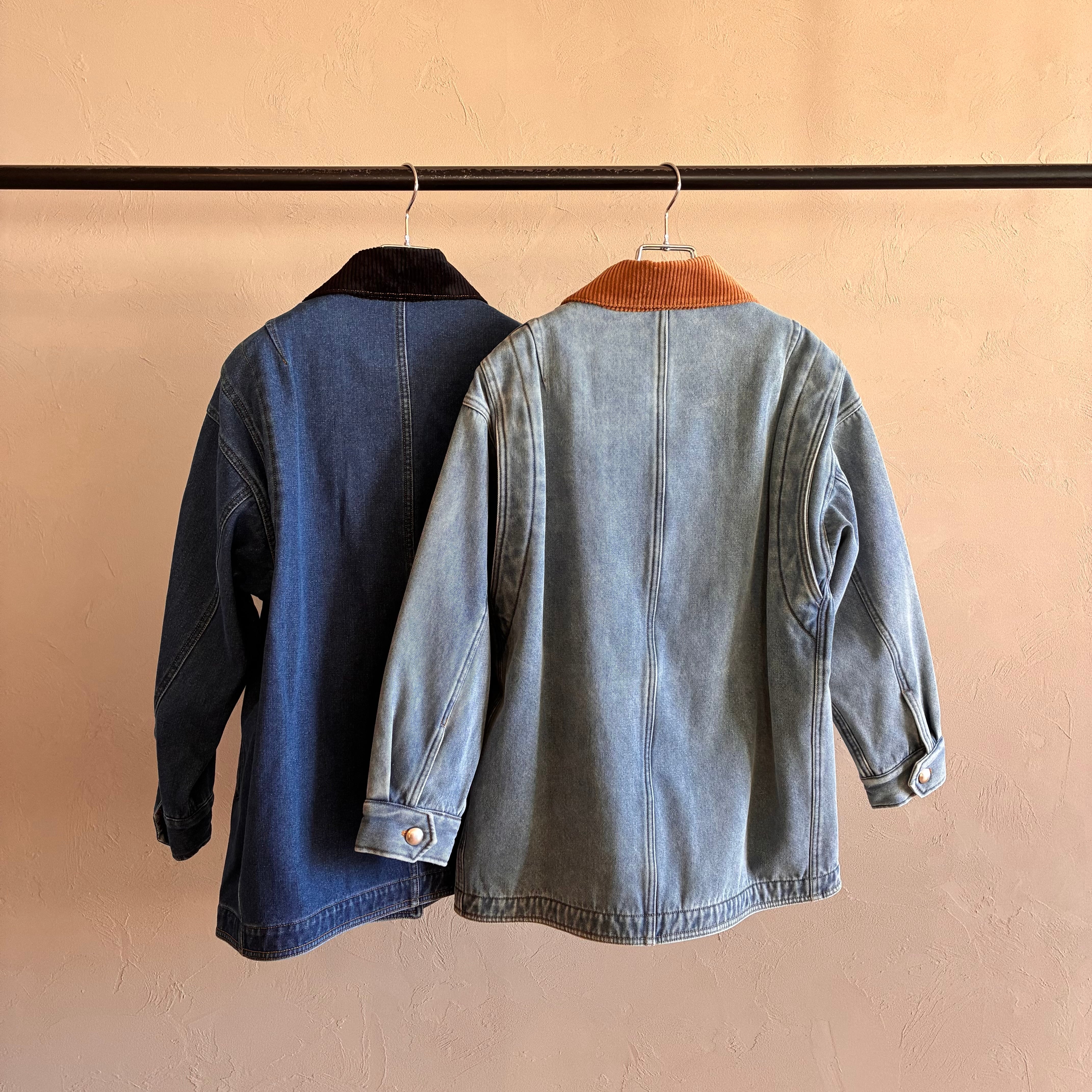今年トレンドのデニム素材に加え、衿部分には秋らしいコーデュロイ素材をあしらった異素材切り替えがポイントです。