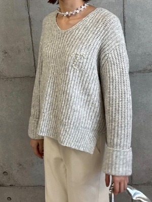 まるでブローチを付けているかのような、パールビジュー付きのロゴ刺繍が目を引く、大人可愛いVネックニット。