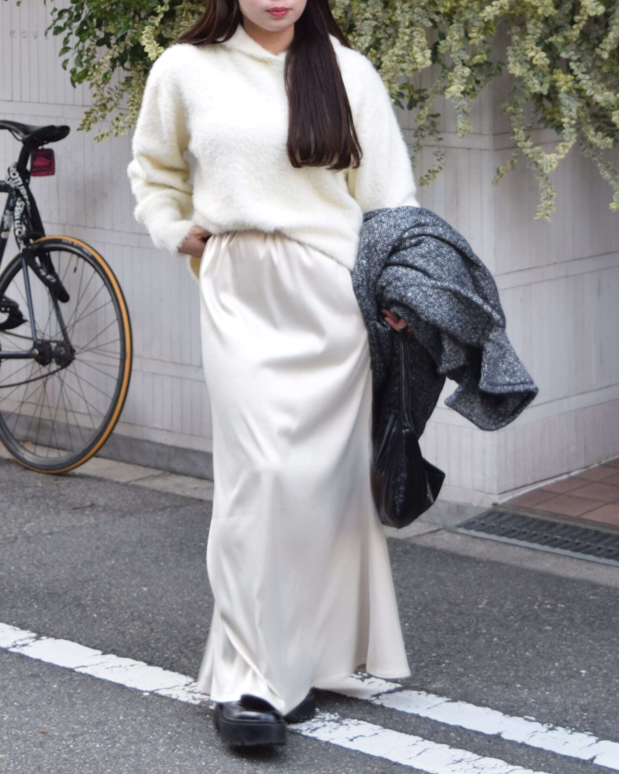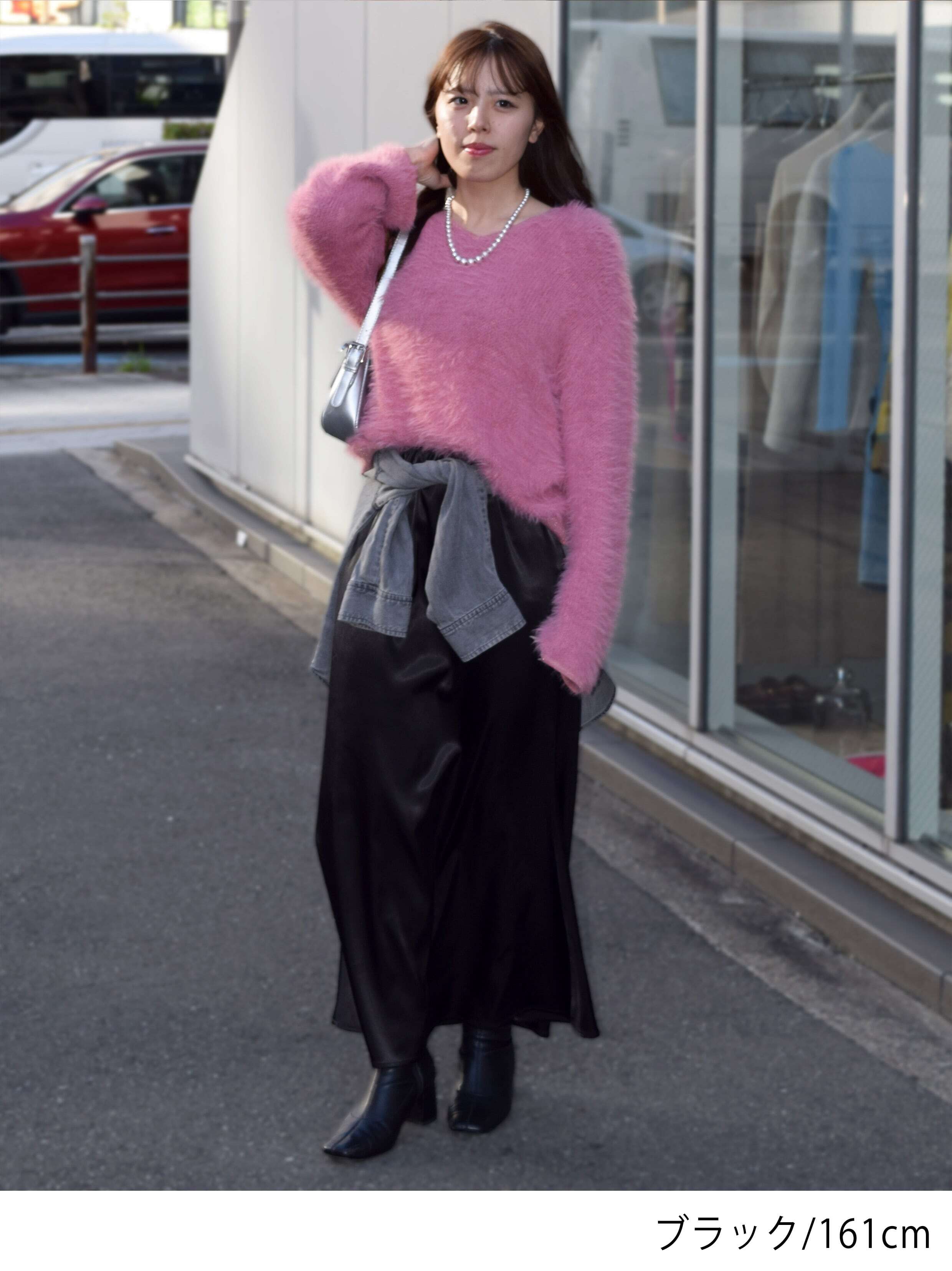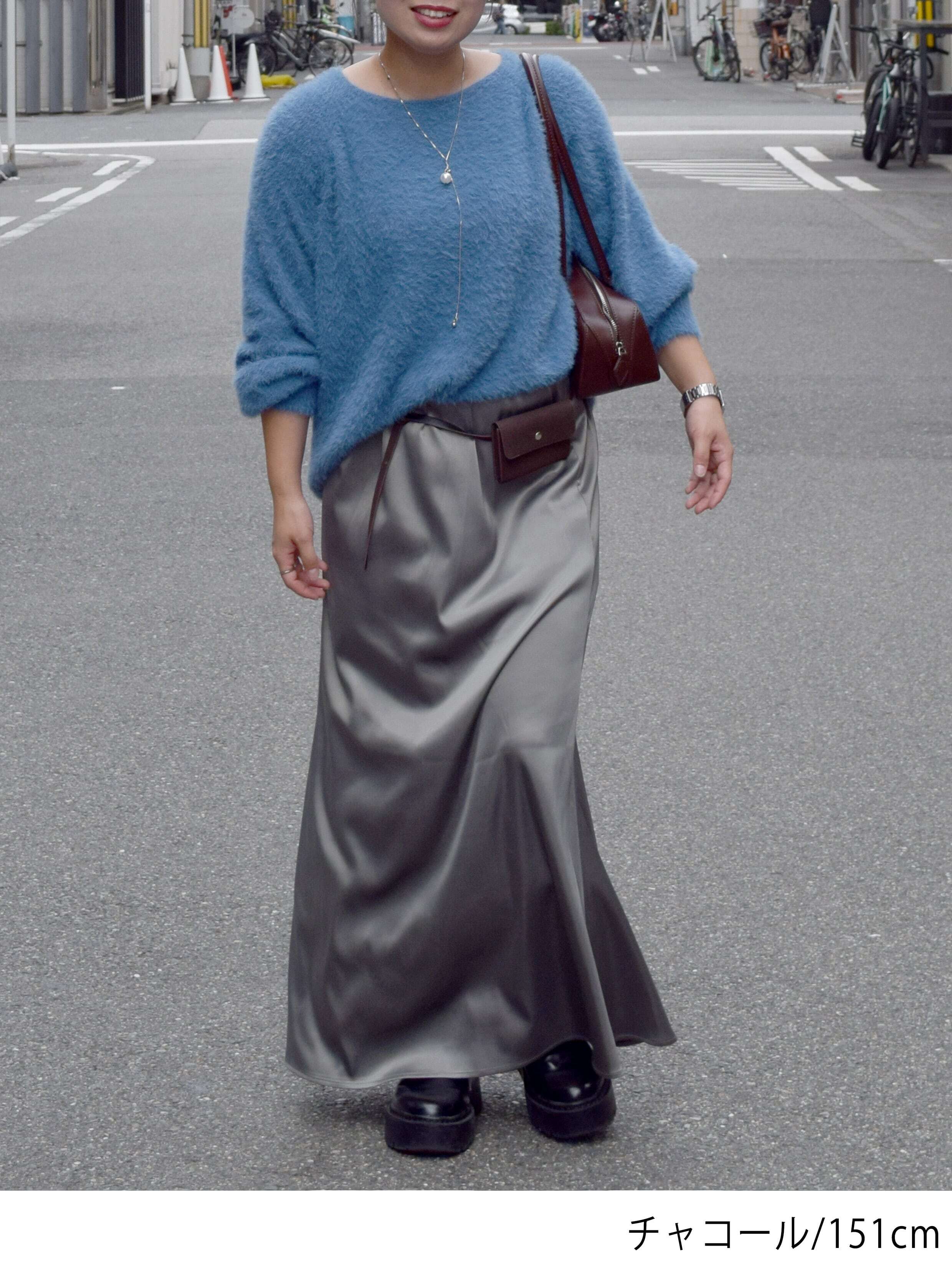光沢感がスタイリングに女性らしさをプラスしてくれるので、シンプルなニットやカットソーを合わせるだけで洗練された雰囲気に。