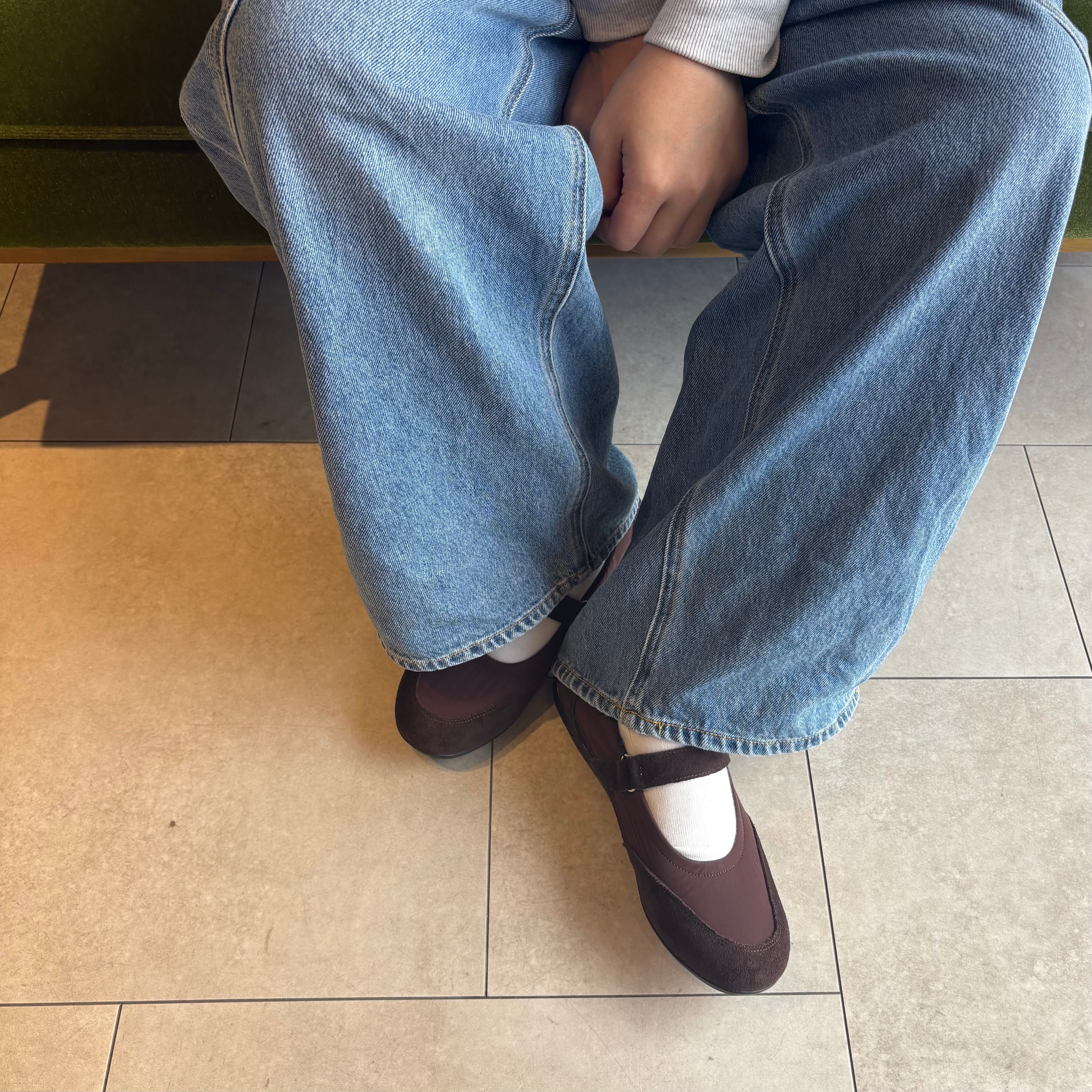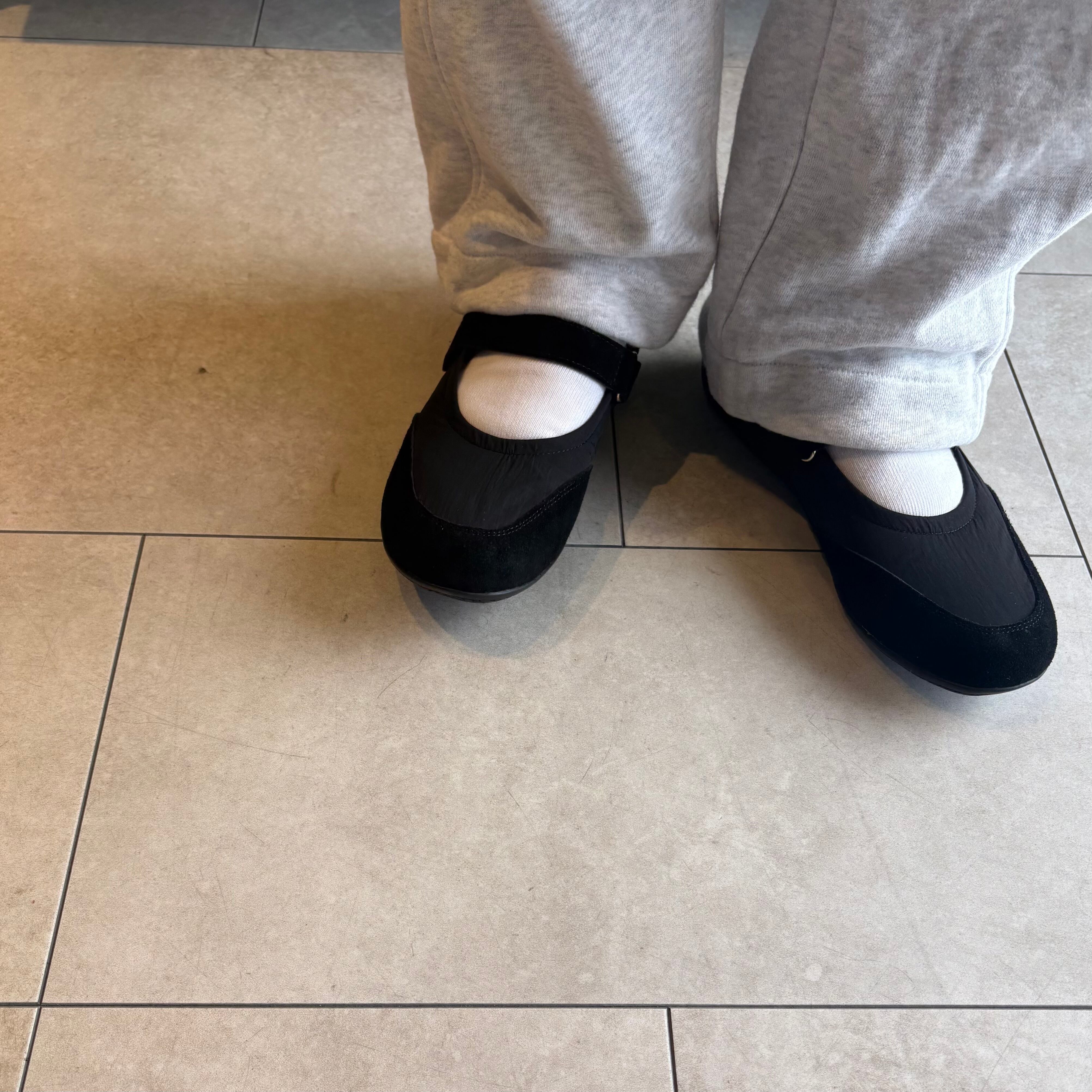 調整できるストラップで甲高さんも安心、脱ぎ履きも簡単で、デニムやフレアスカート、ソックス合わせも大人可愛い。
