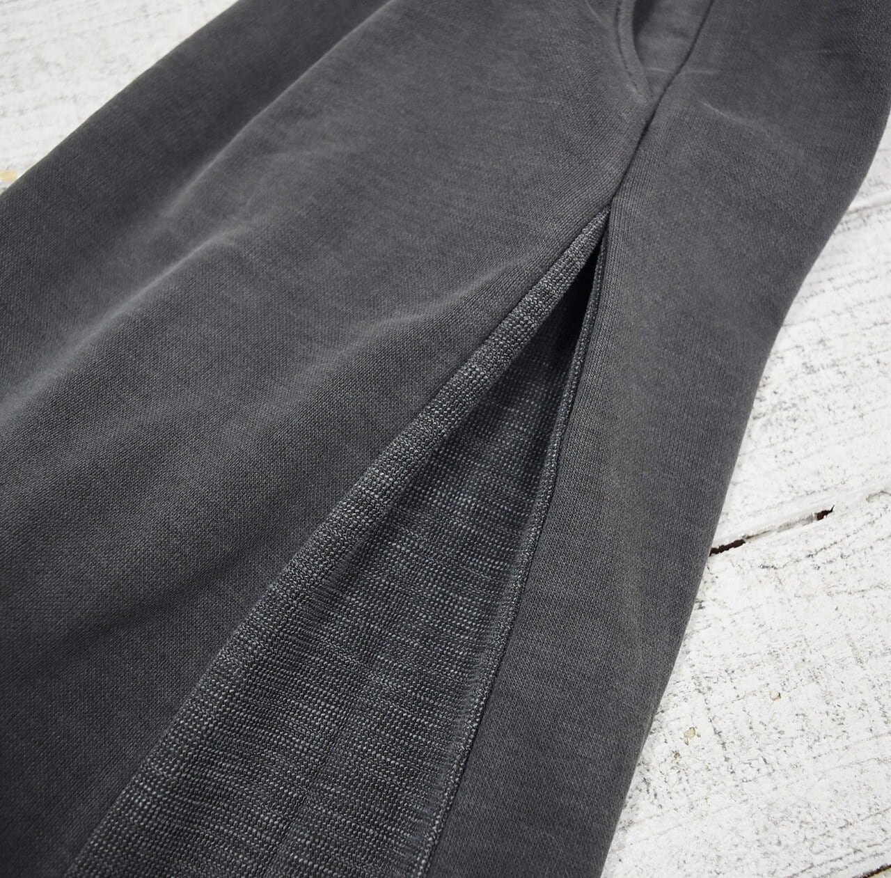 スラブ生地の裏表を使いサイドにタックデザイン(タック部分がスラブ生地)で動きのあるデザインに仕上げました。ウエストはゴム×コード仕様になっています。同素材のスラブロゴロンTとセットアップで着ていただけます。カラーはオフ、サンド、チャコールの3色になります。