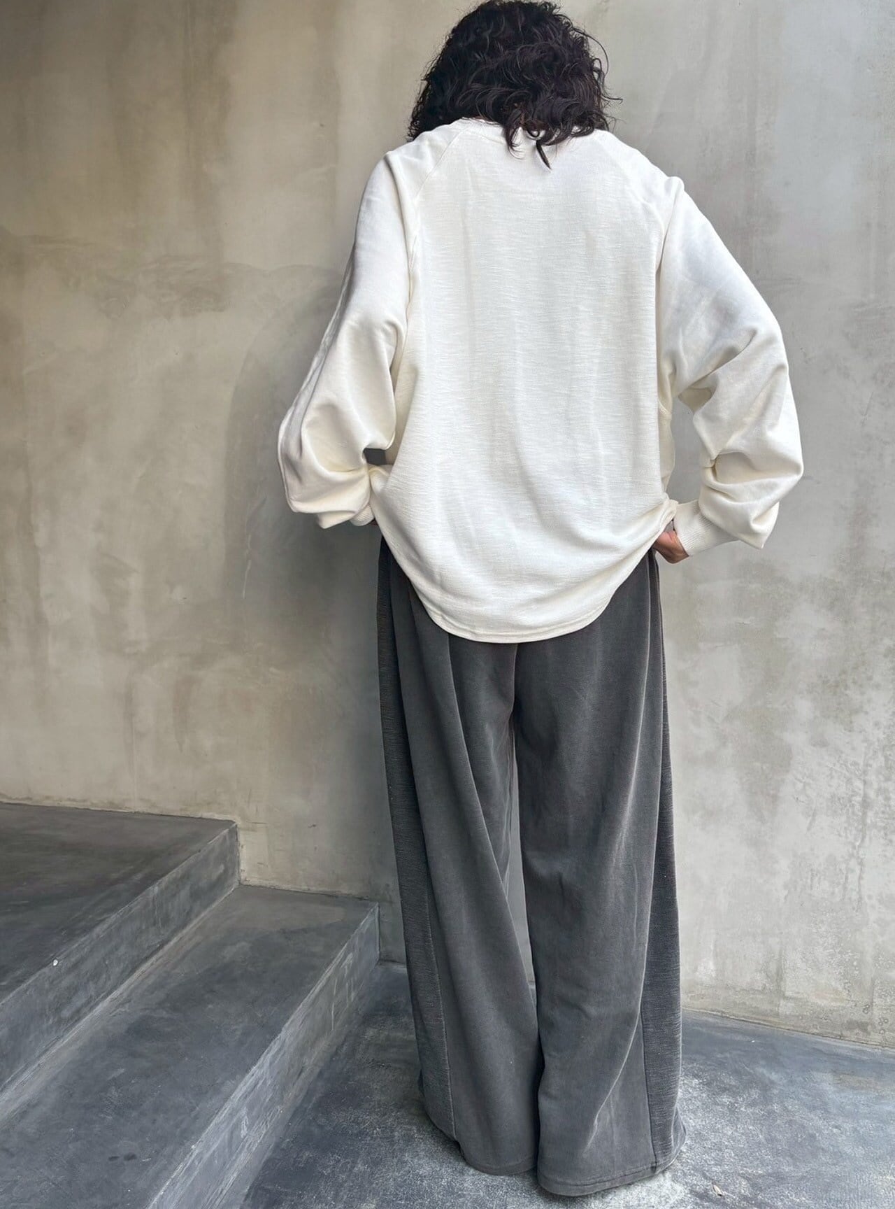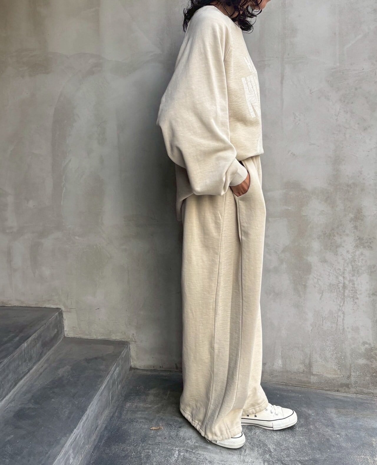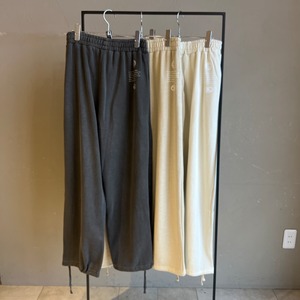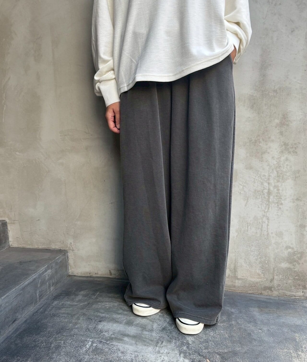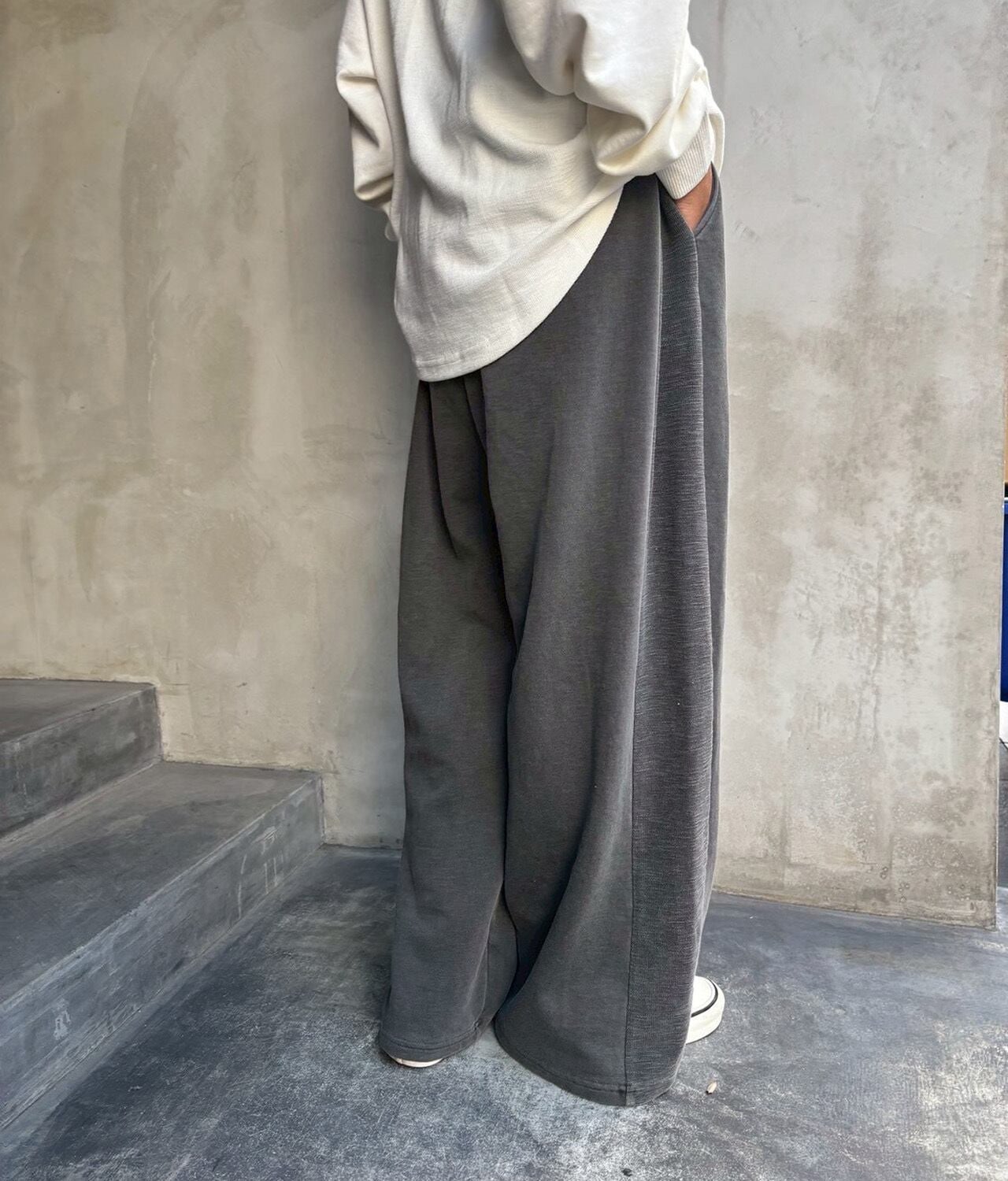 スラブ生地の裏表を使いサイドにタックデザイン(タック部分がスラブ生地)で動きのあるデザインに仕上げました。ウエストはゴム×コード仕様で裾にもコードが入っていますので絞っても履いていただけます。同素材のスラブロゴロンTとセットアップで着ていただけます。カラーはオフ、サンド、チャコールの3色になります。