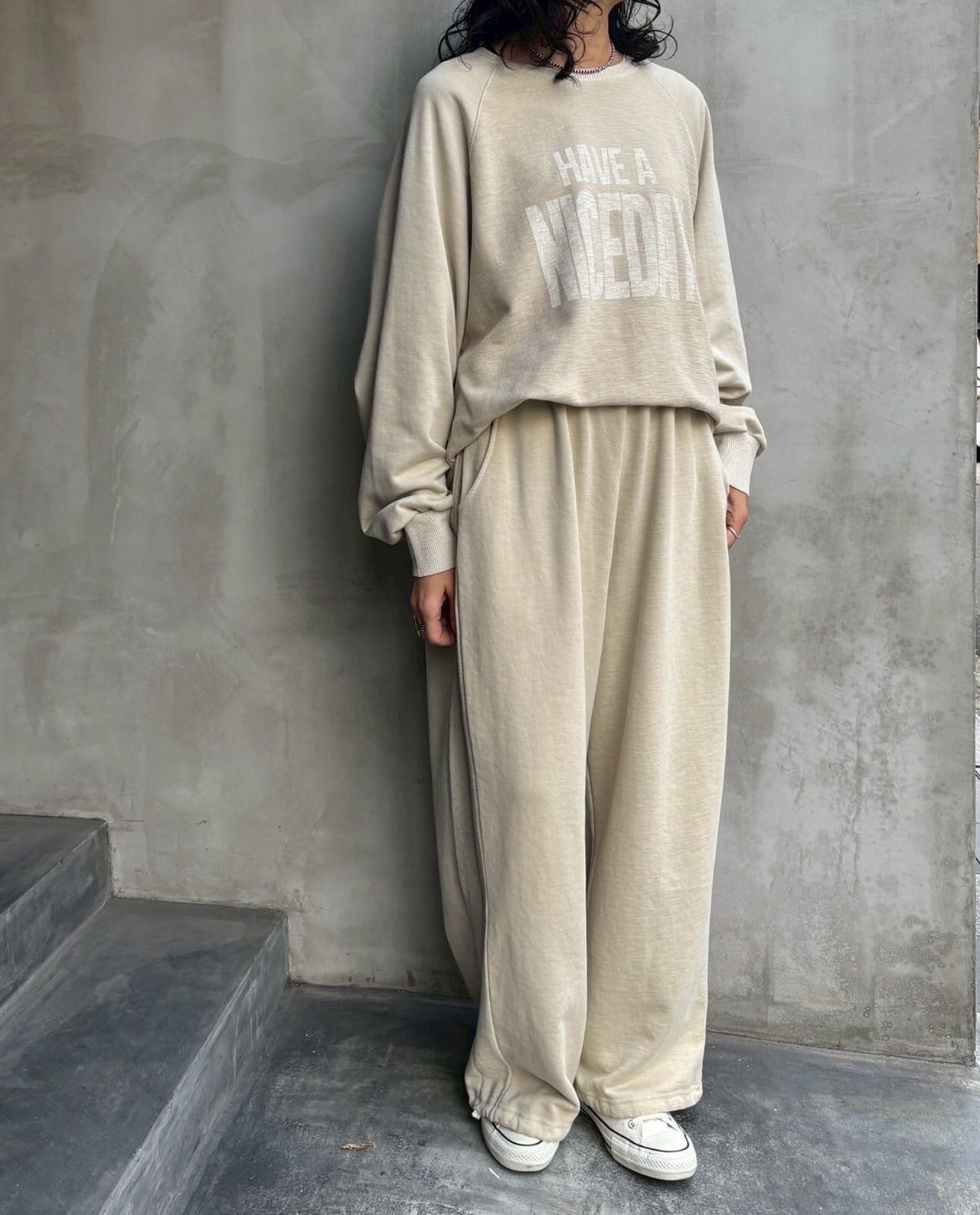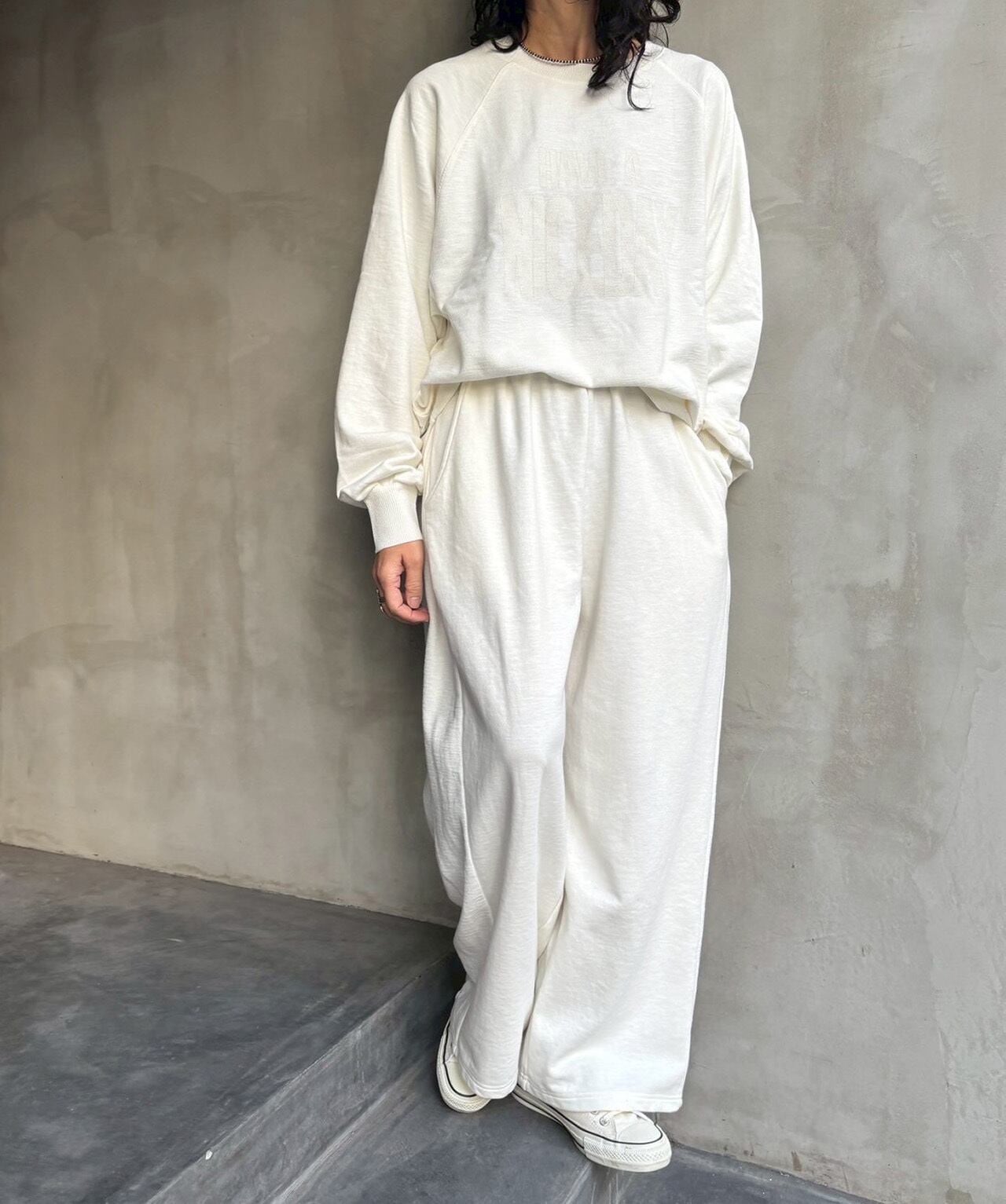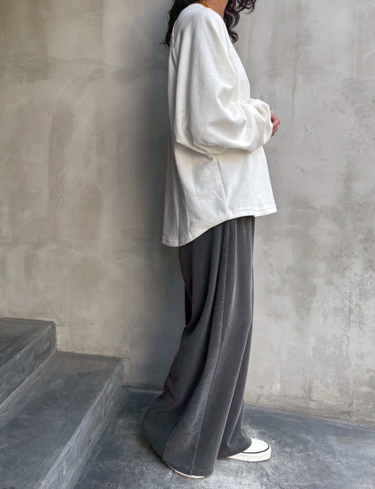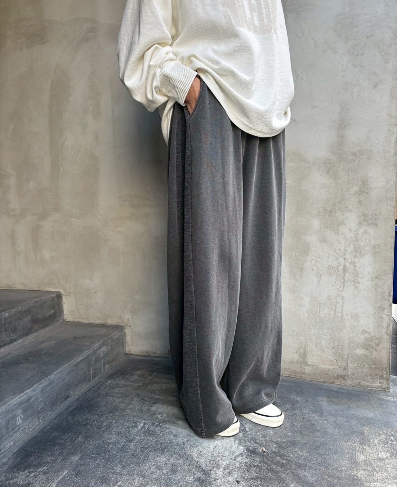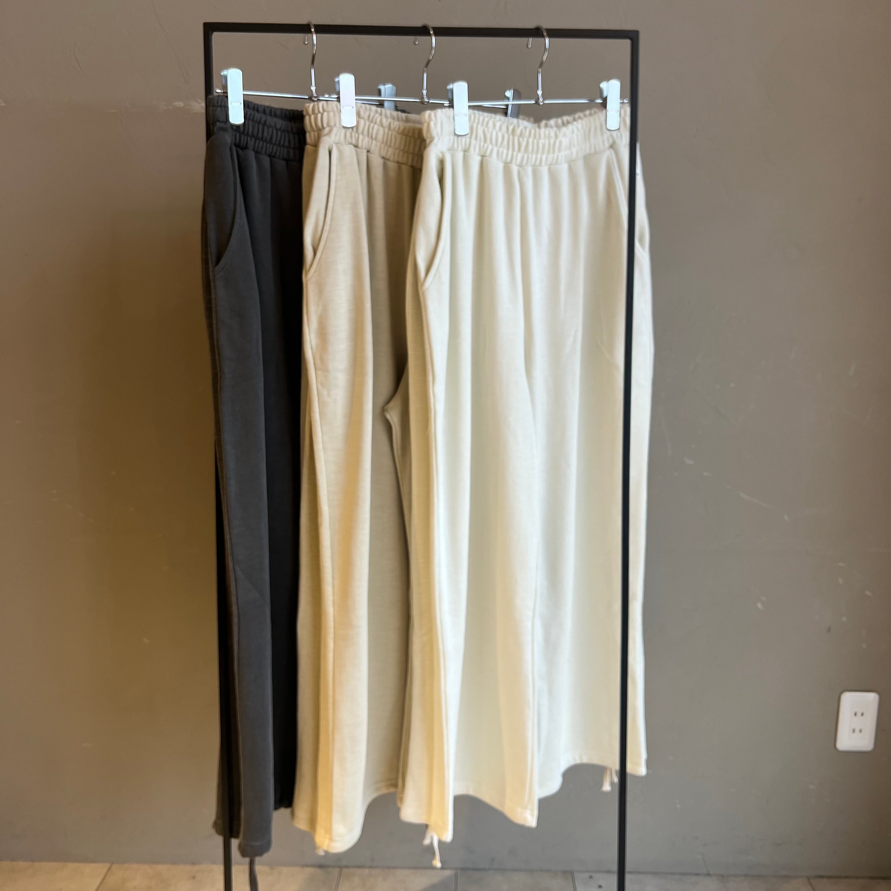 スラブ生地の裏表を使いサイドにタックデザイン(タック部分がスラブ生地)で動きのあるデザインに仕上げました。ウエストはゴム×コード仕様で裾にもコードが入っていますので絞っても履いていただけます。同素材のスラブロゴロンTとセットアップで着ていただけます。カラーはオフ、サンド、チャコールの3色になります。