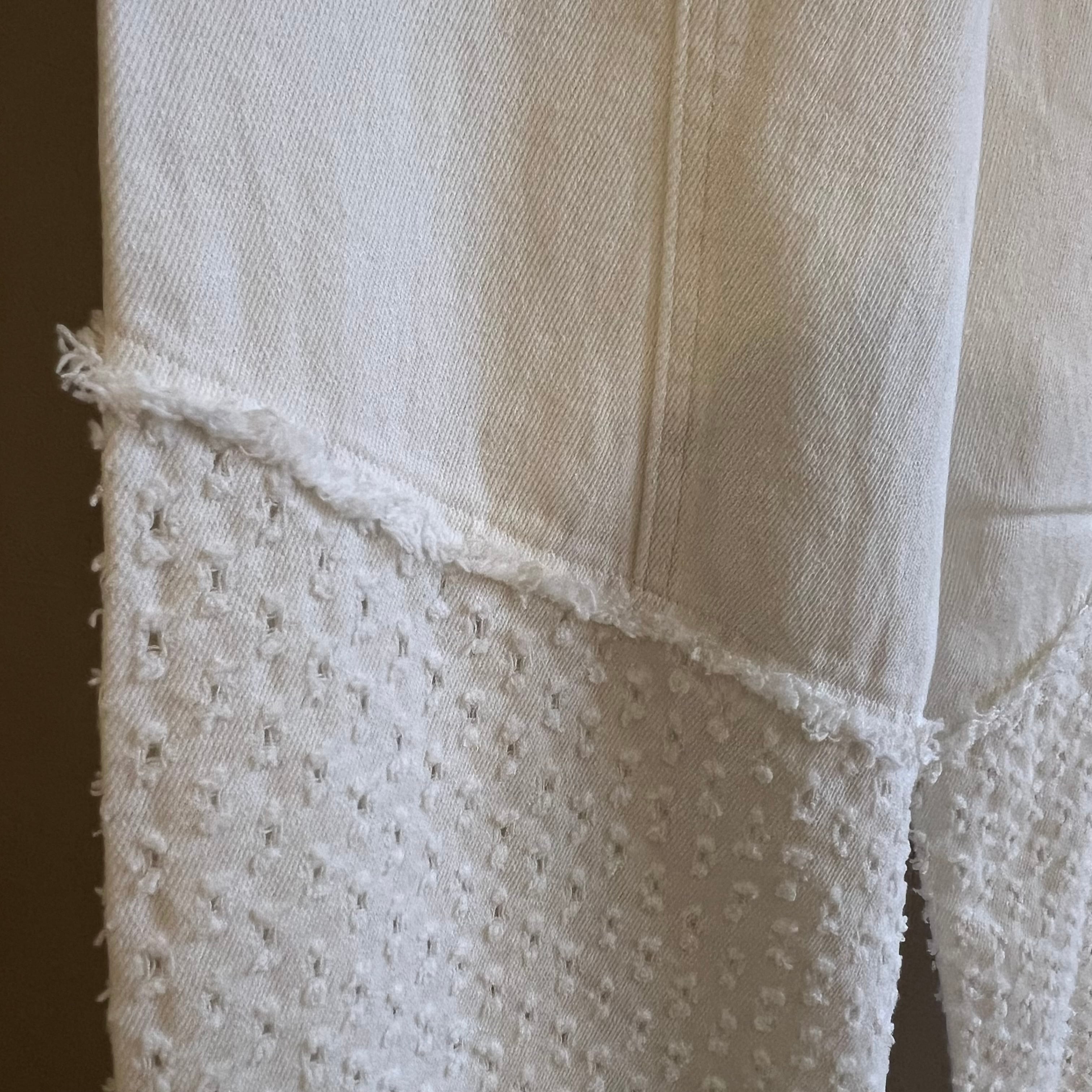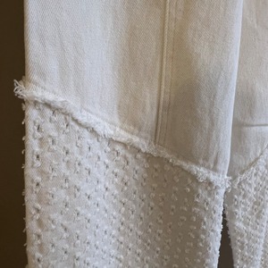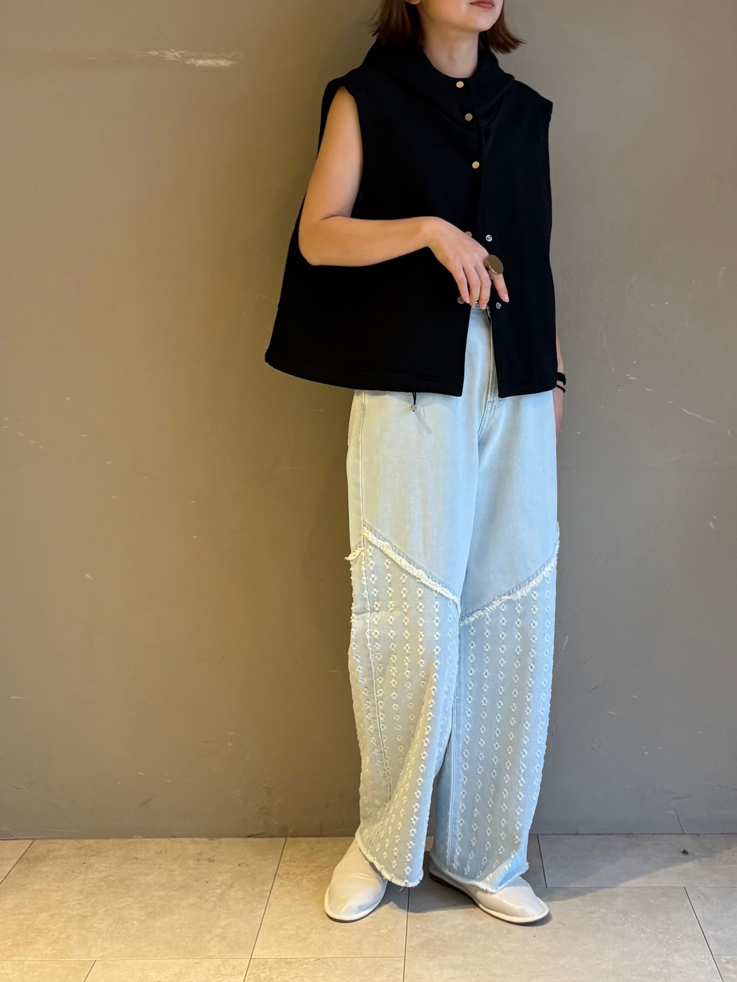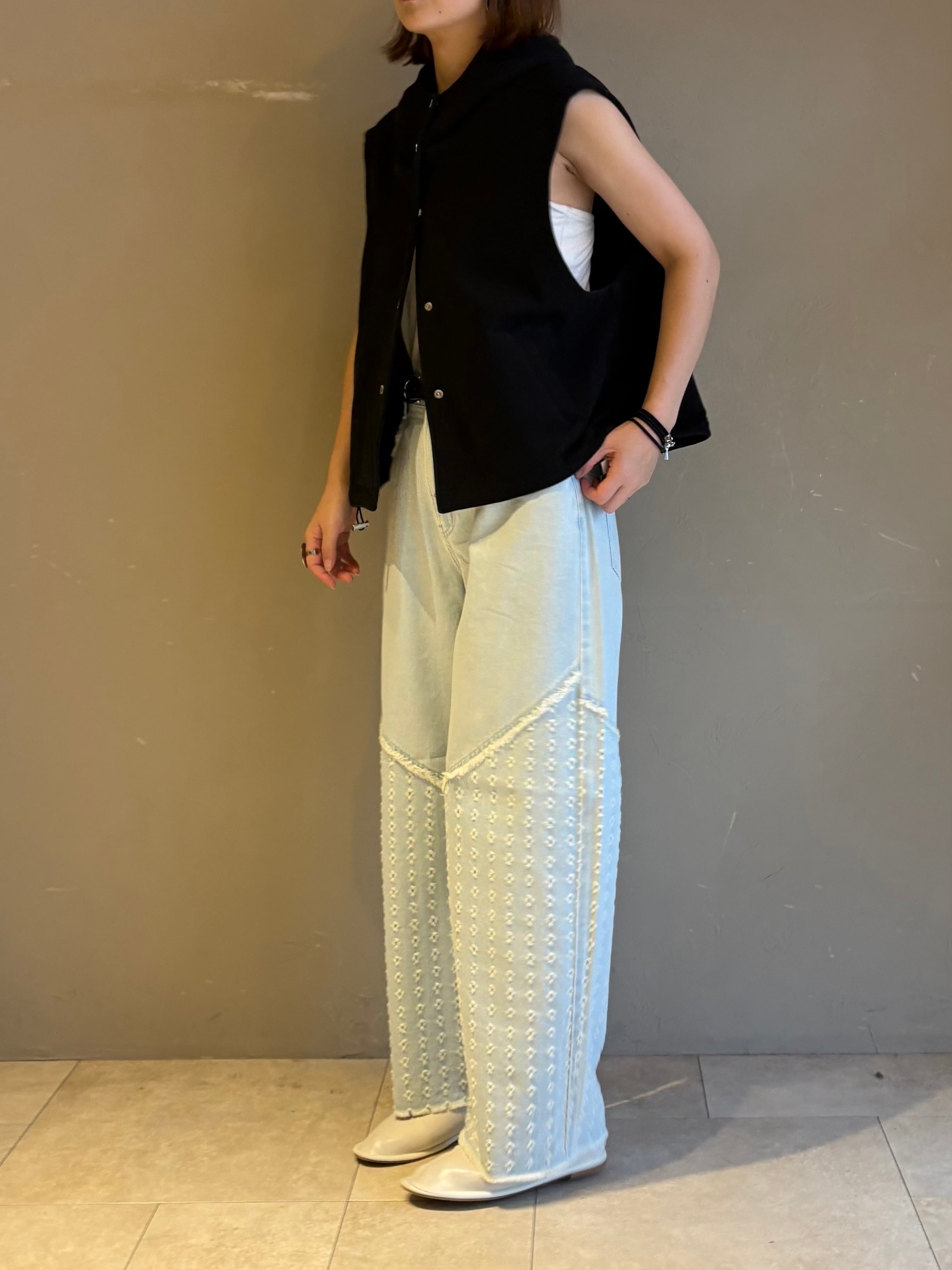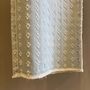 前後身の下半分には、デニムベースに0.5cmほどの穴あけダメージを等間隔に施した、他にないユニークなテキスタイルを使用。
