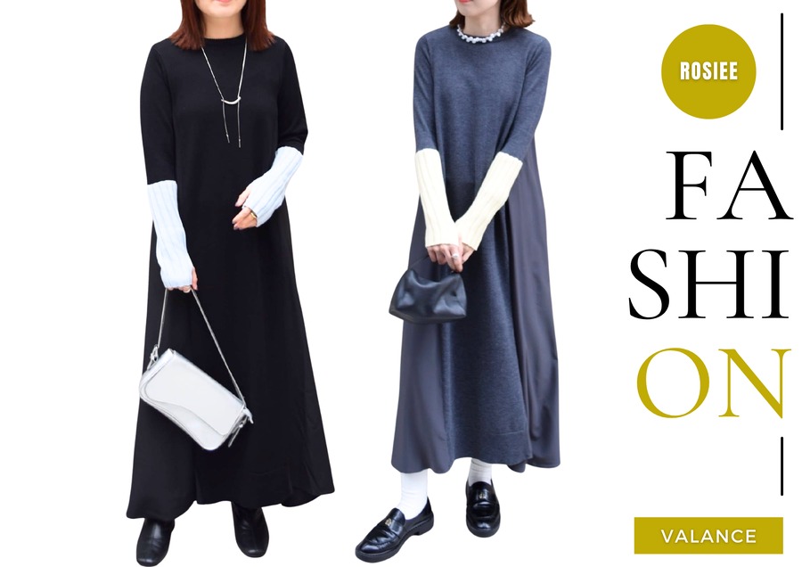 ROSIEE定番の布帛ドッキングワンピースと、指ぬきグローブ風の新しいアイテムです。