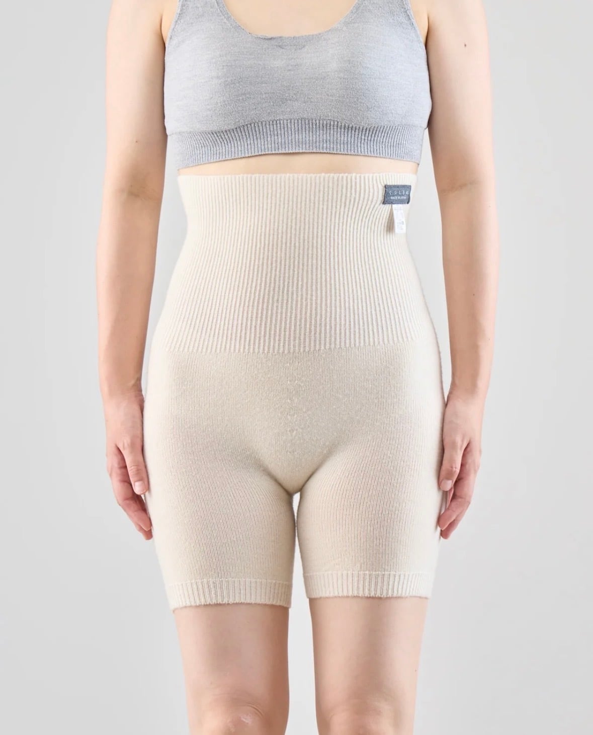 ホールガーメントの技術で編み立てているため、内側の股部分や骨盤部分で糸を少し残しています。糸は切らないようお願いいたします。