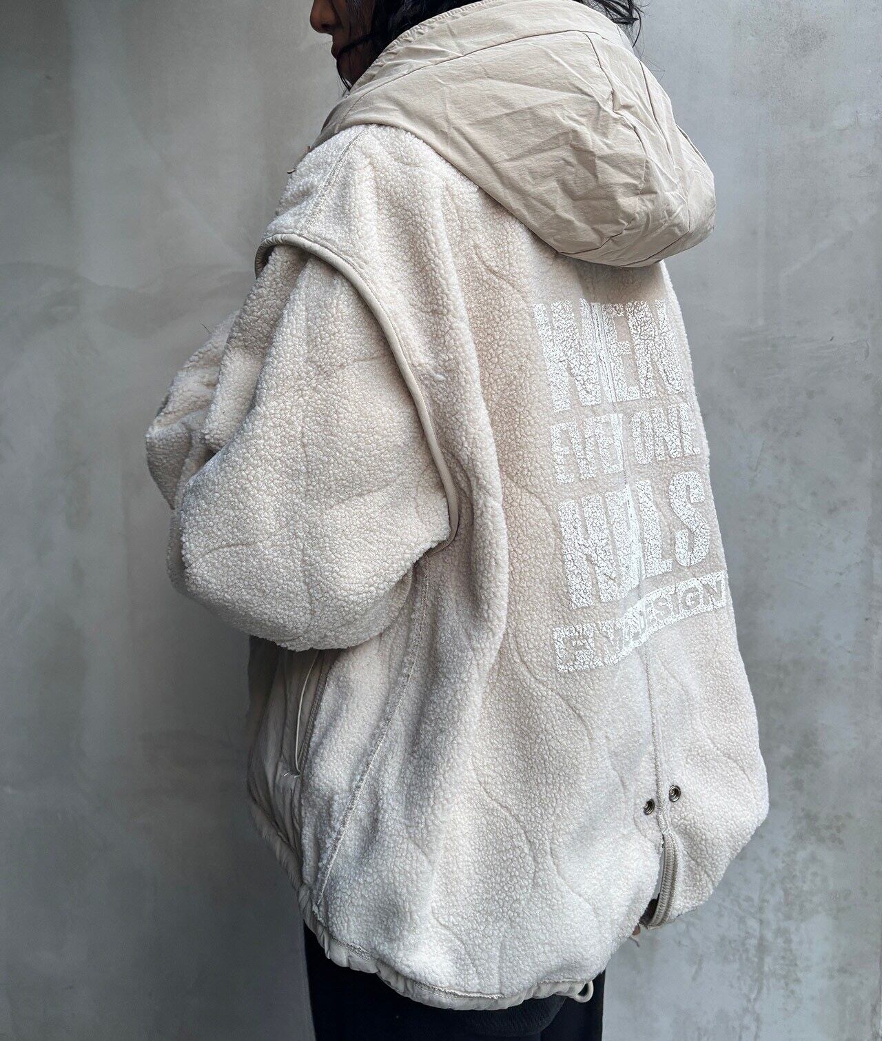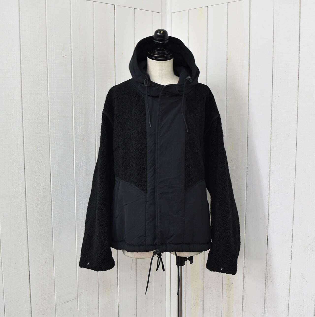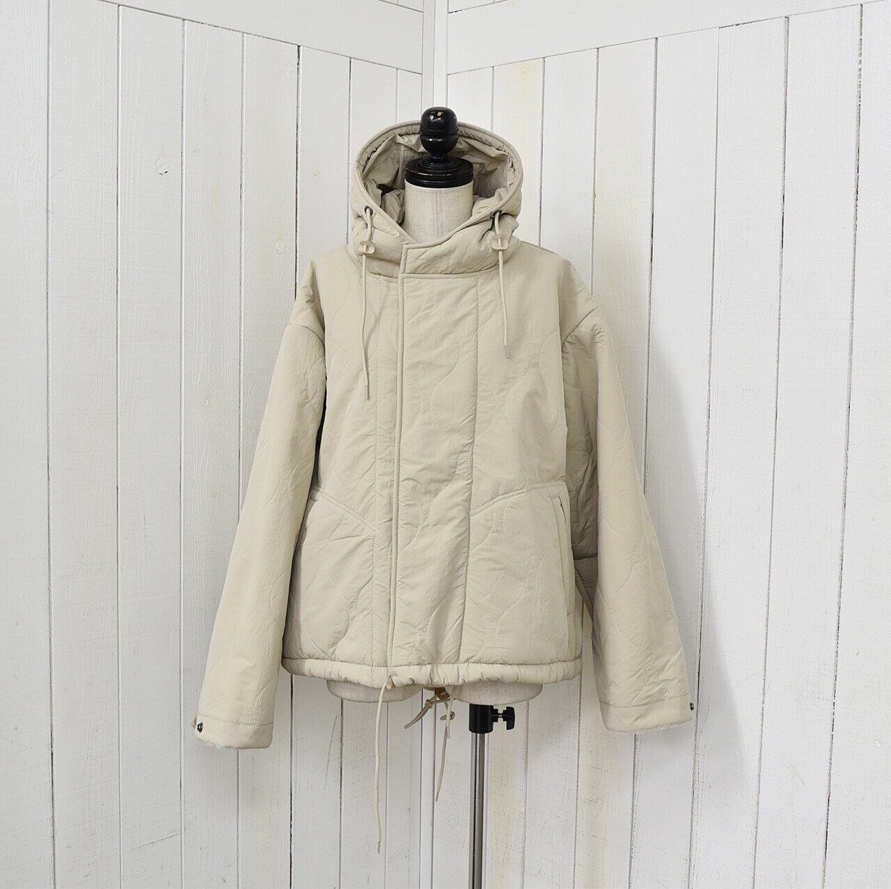 キルティングナイロン×ボアのリバーシブルジャケット。ヒップが隠れるくらいの丈感で少しAラインよりの形になっておりますが裾にドローコードが入っていますので絞って丸いシルエットにしても可愛く着ていただけます。ボア側にはバックプリントのロゴが入りシンプルになりがちな冬のコーディネートのポイントになってくれます。オフ、モカ、ブラックの3色になります。