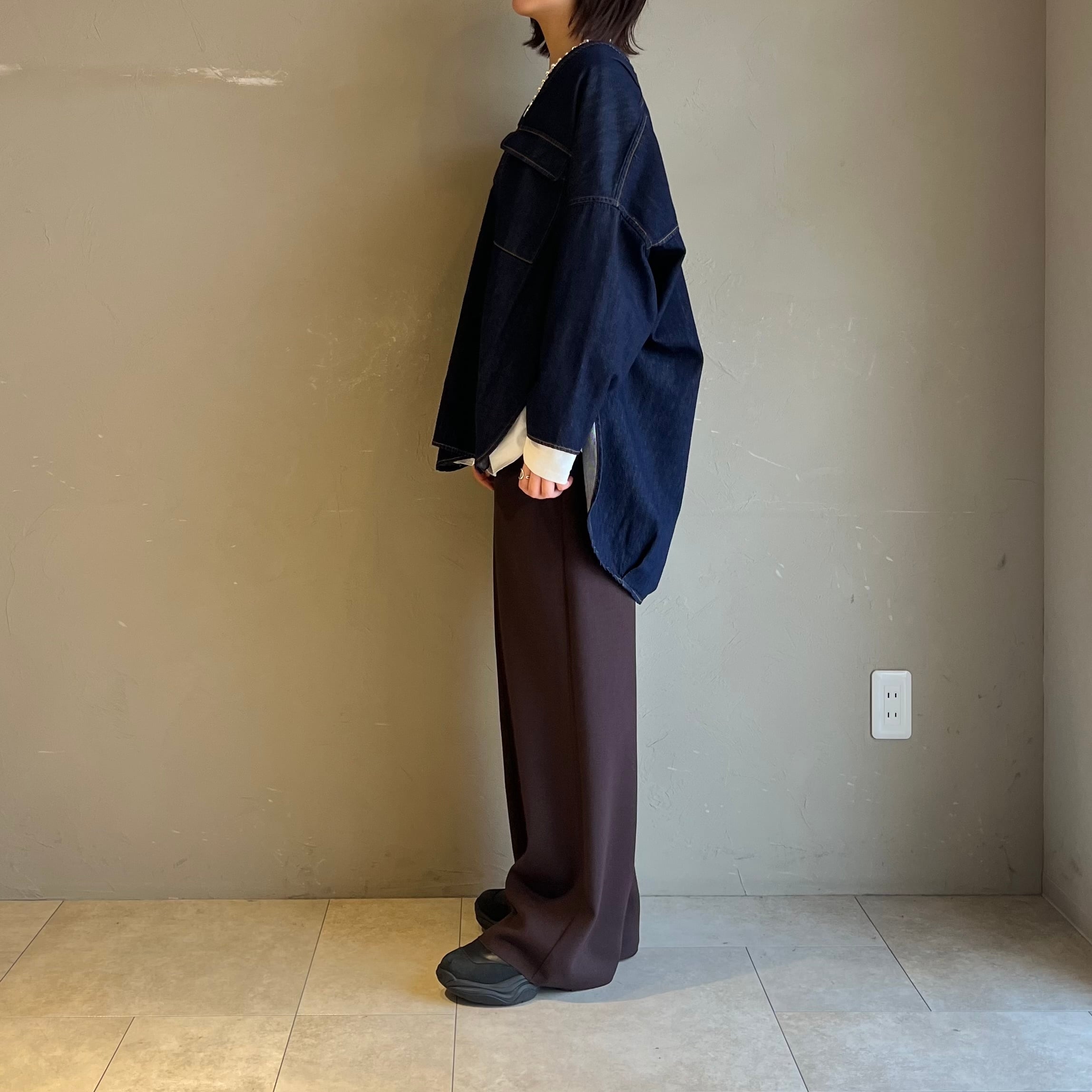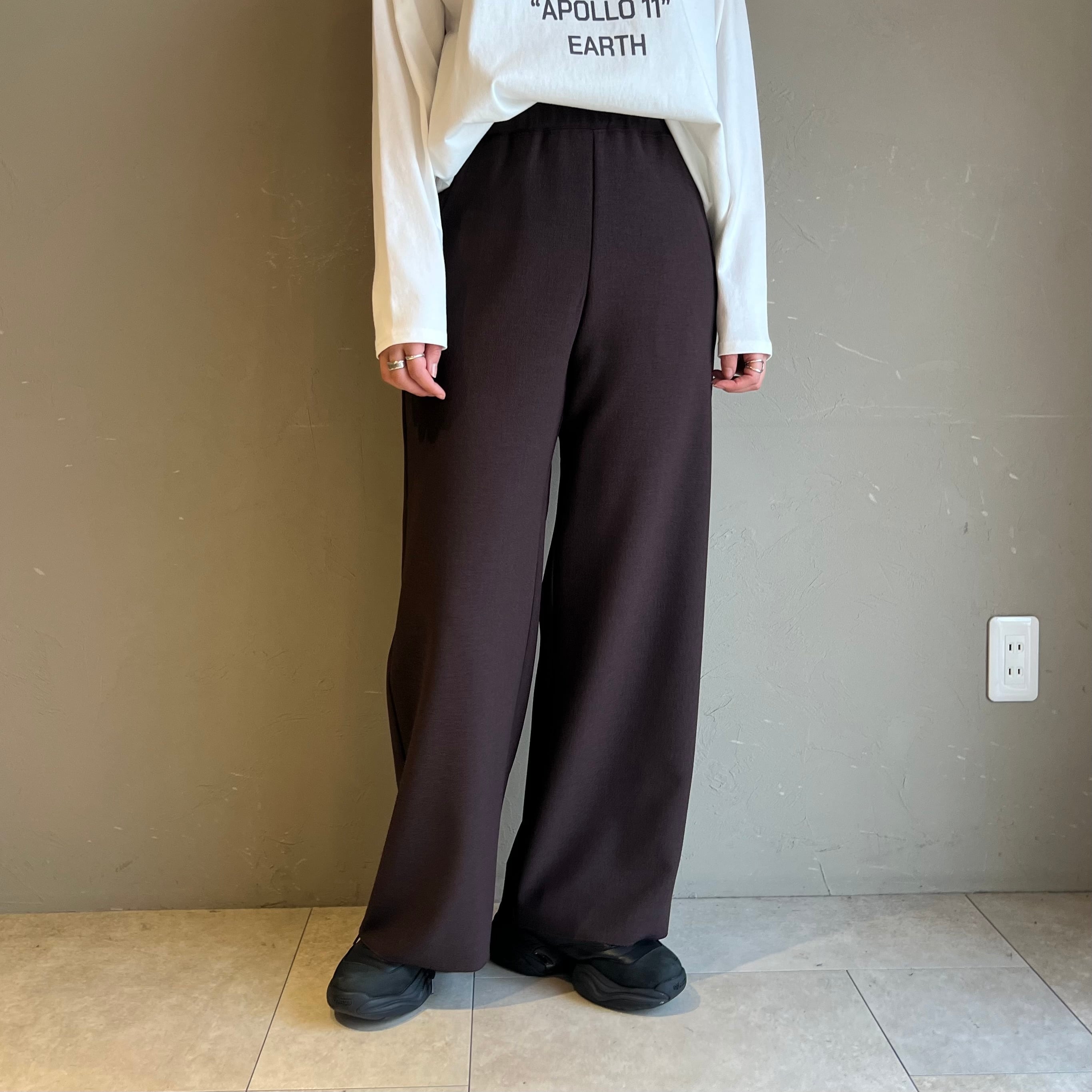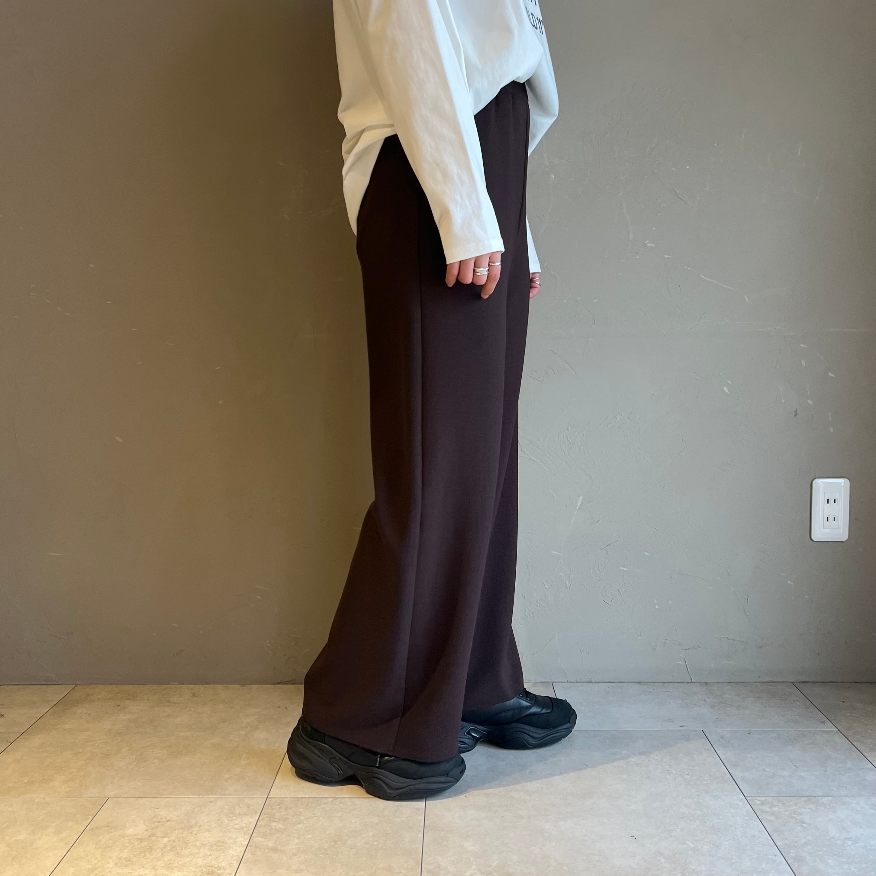 滑らかな素材感が特徴で、程よいドレープ感が楽しめます。程よい張り感もあることでシルエットはすっきりとしており、スタイルアップ効果も期待できます◎