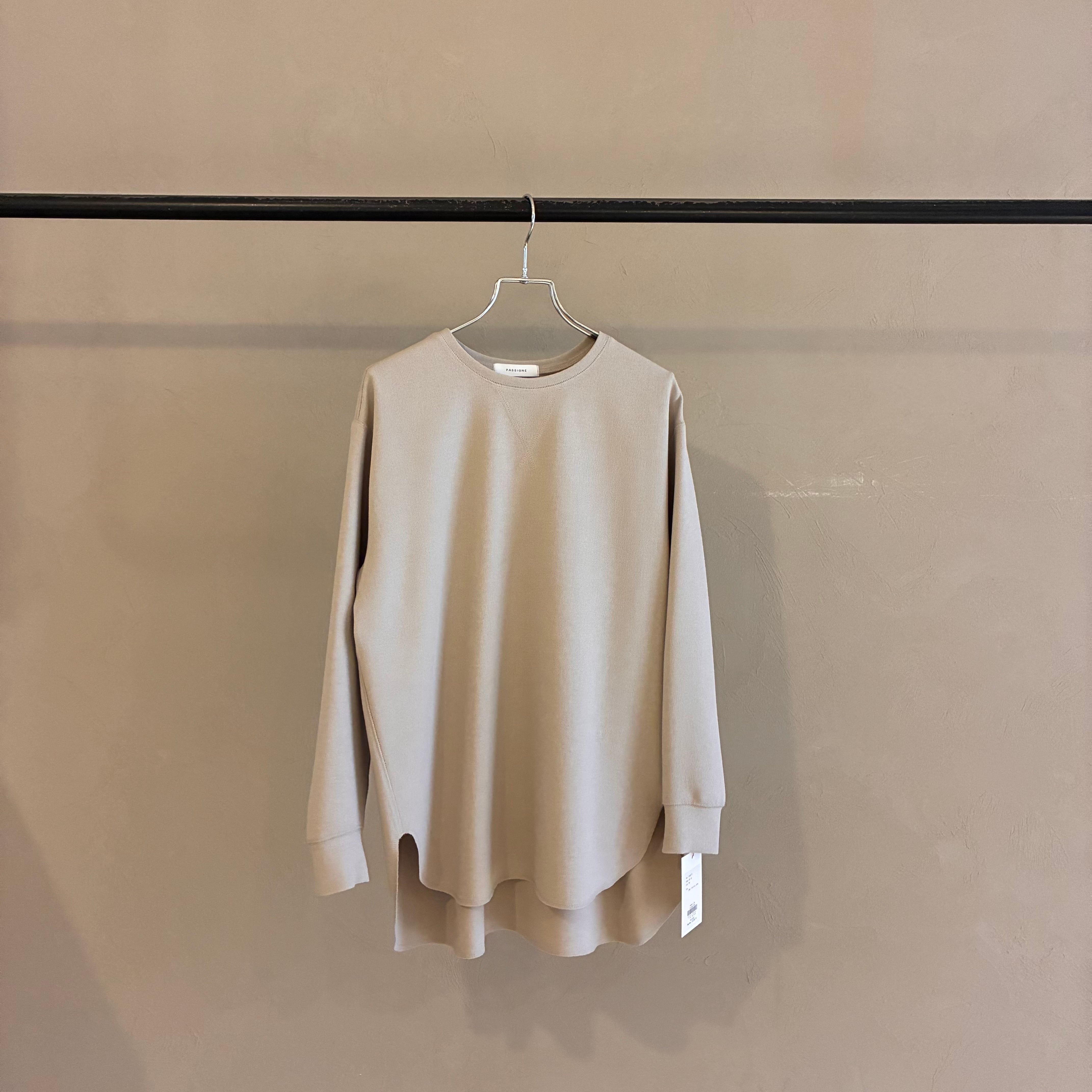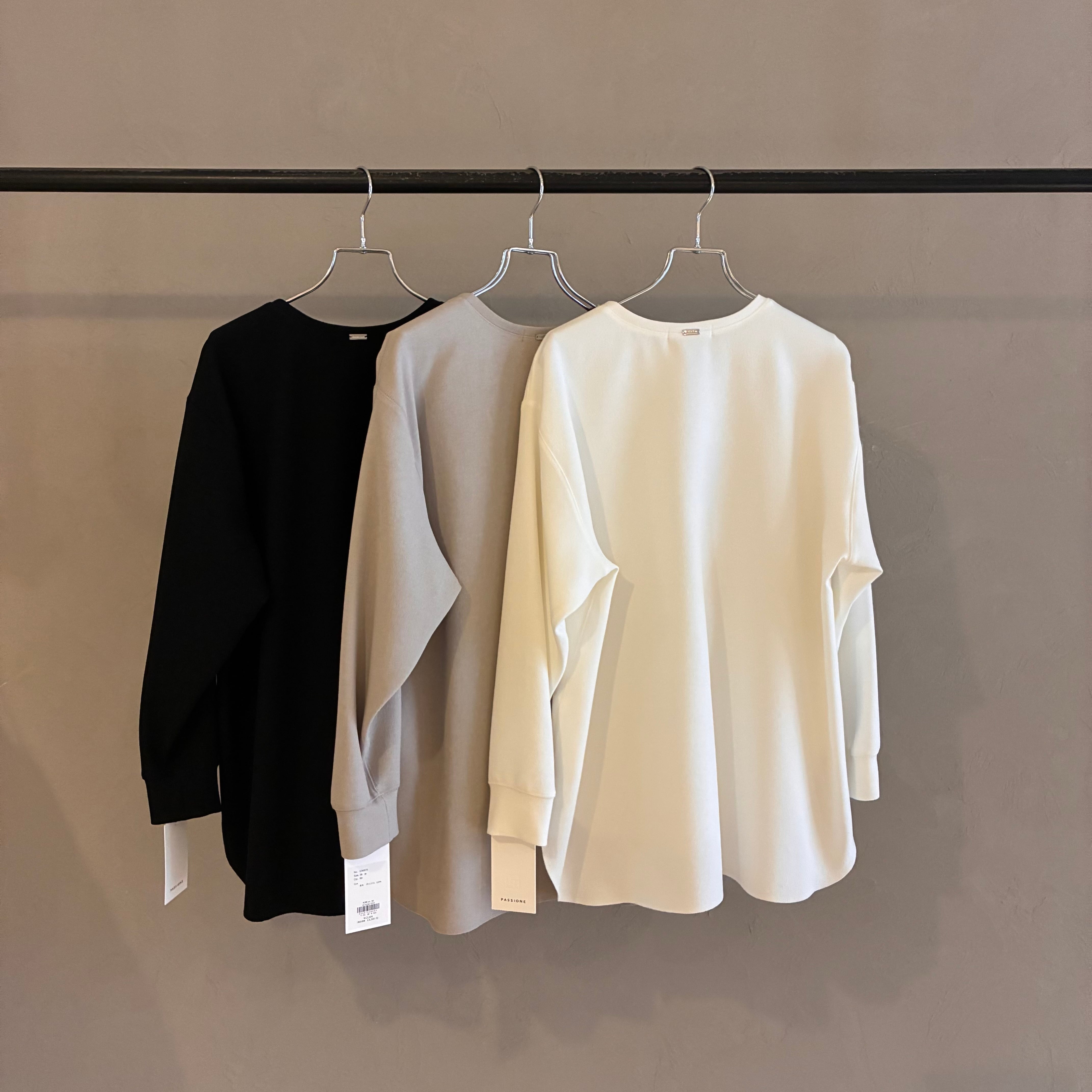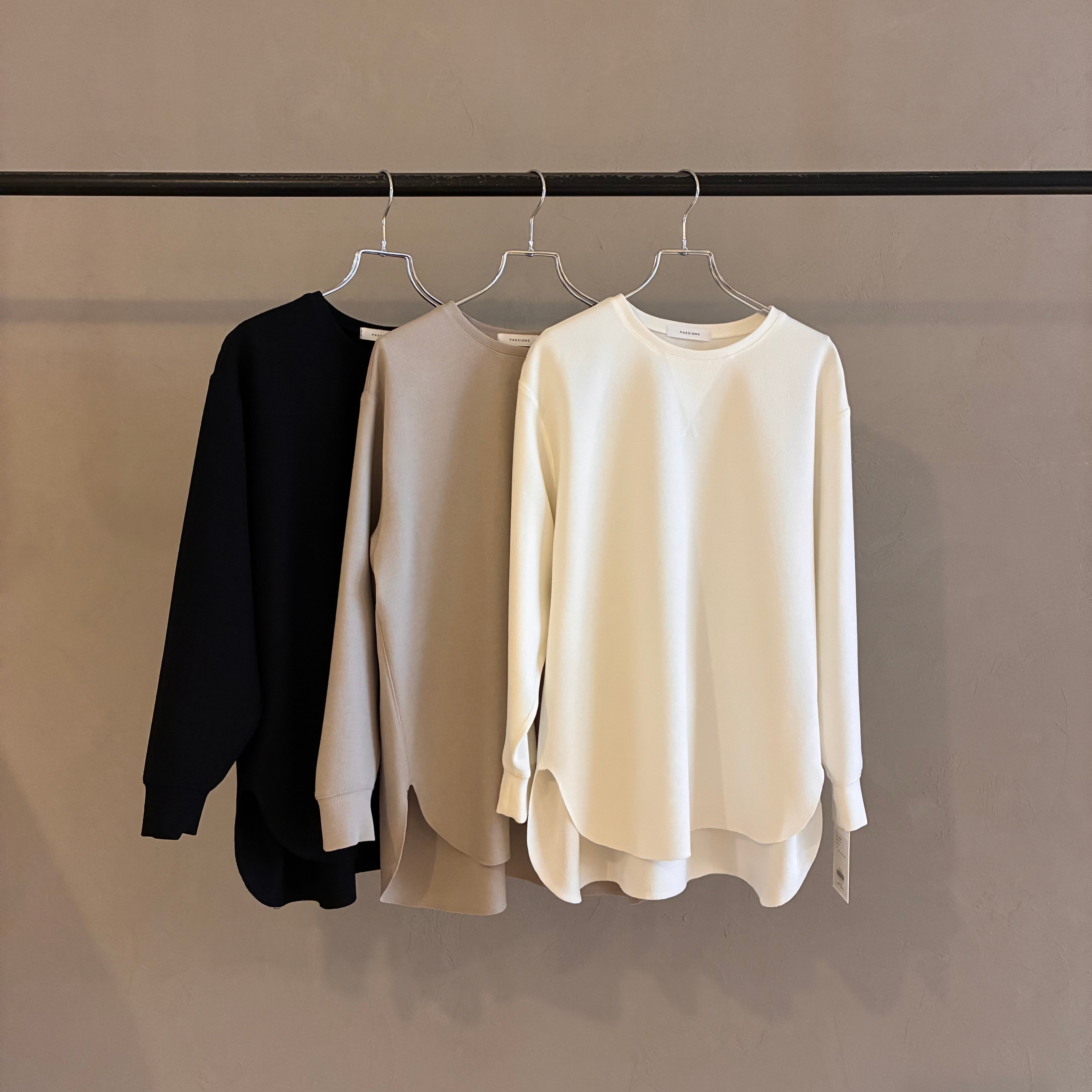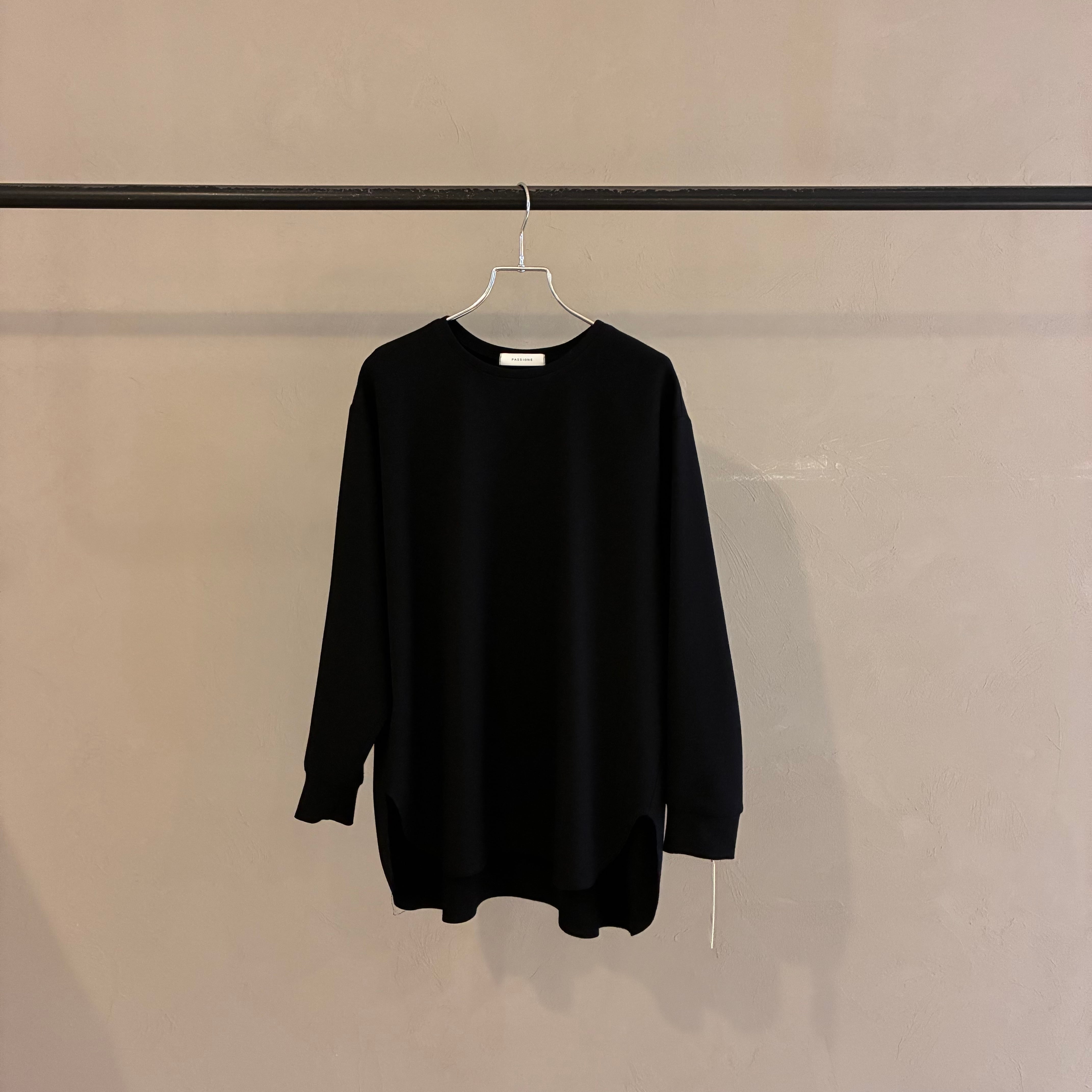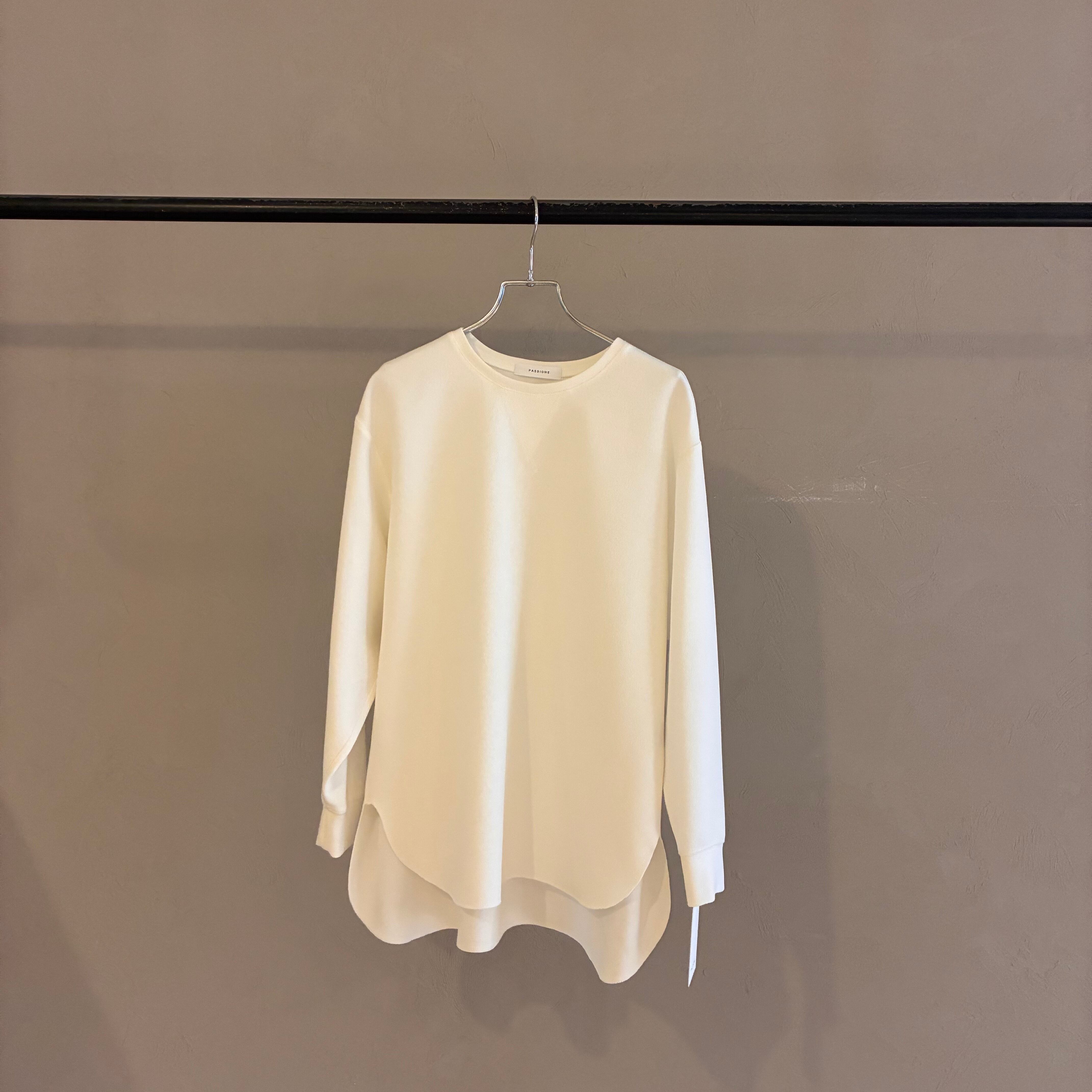 前上がりのデザインなので、フロントをインしなくてもバランスよく着ていただけます。後ろネックにはPASSIONEのロゴ入りプレートが施されています。