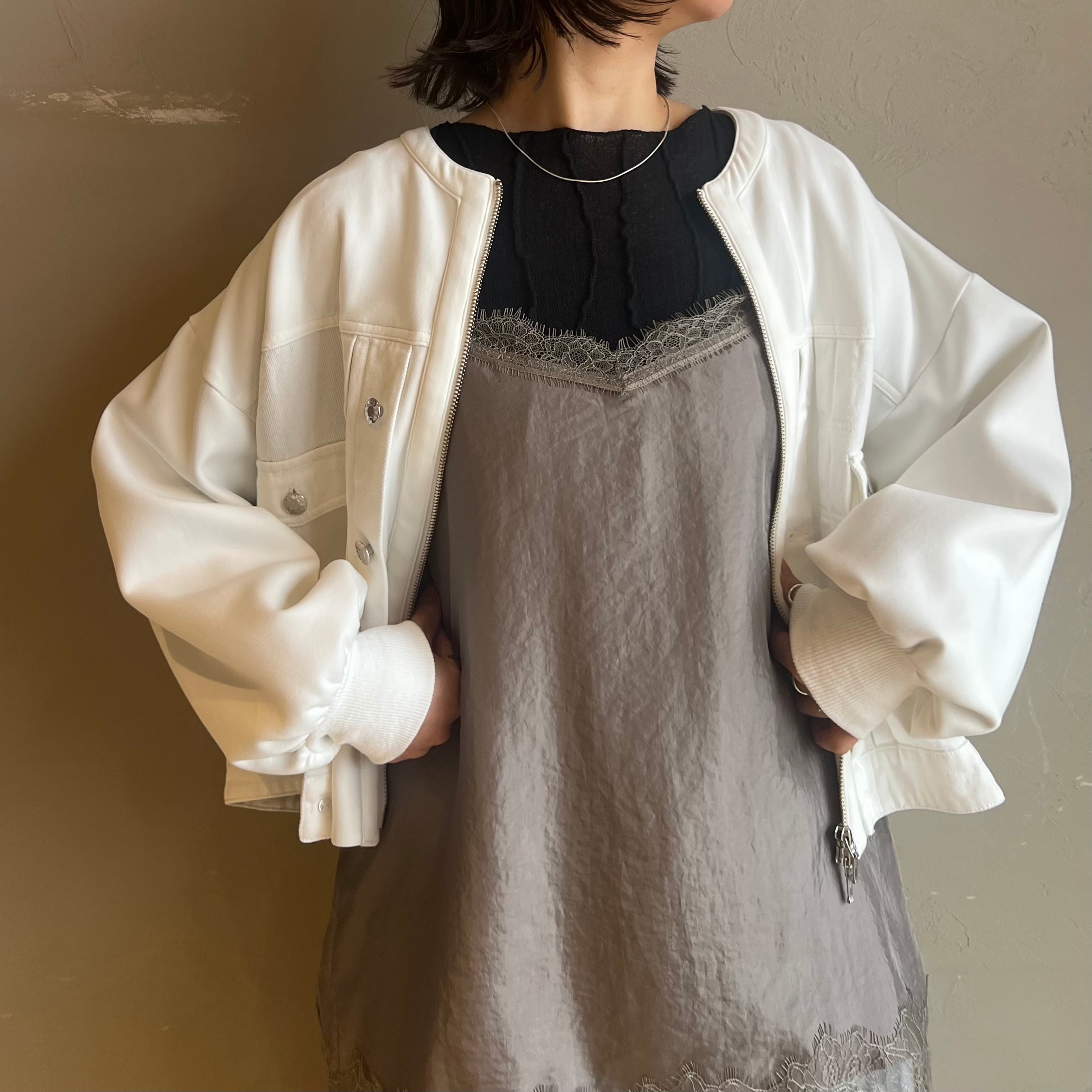 ノーカラー×ジップで顔まわりはすっきり、袖は程よくボリュームが出て女性らしい抜け感に。