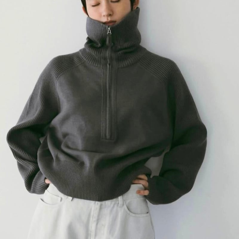 目の詰まった中肉の編み地で仕立てた上質感漂うハーフジップニットトップス。