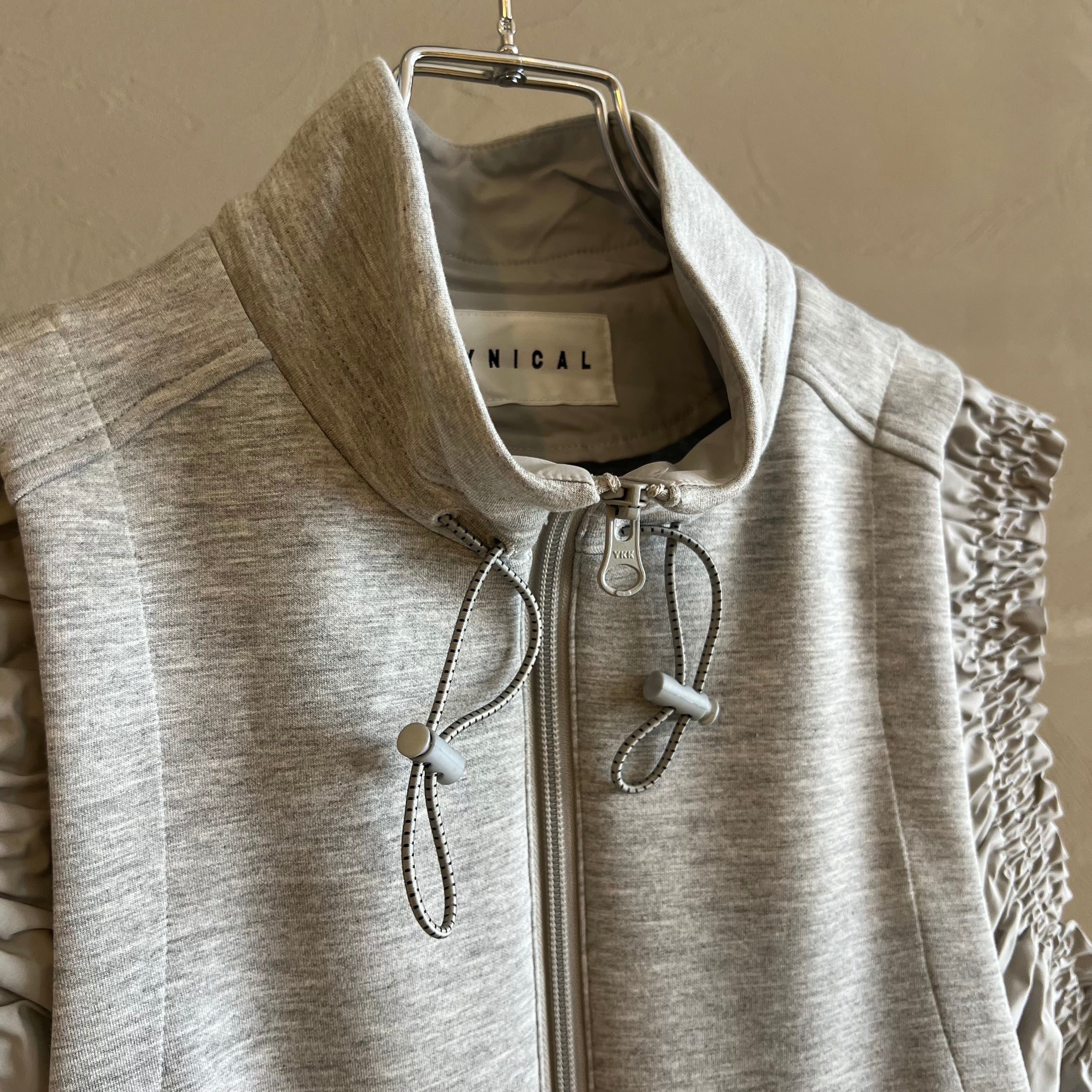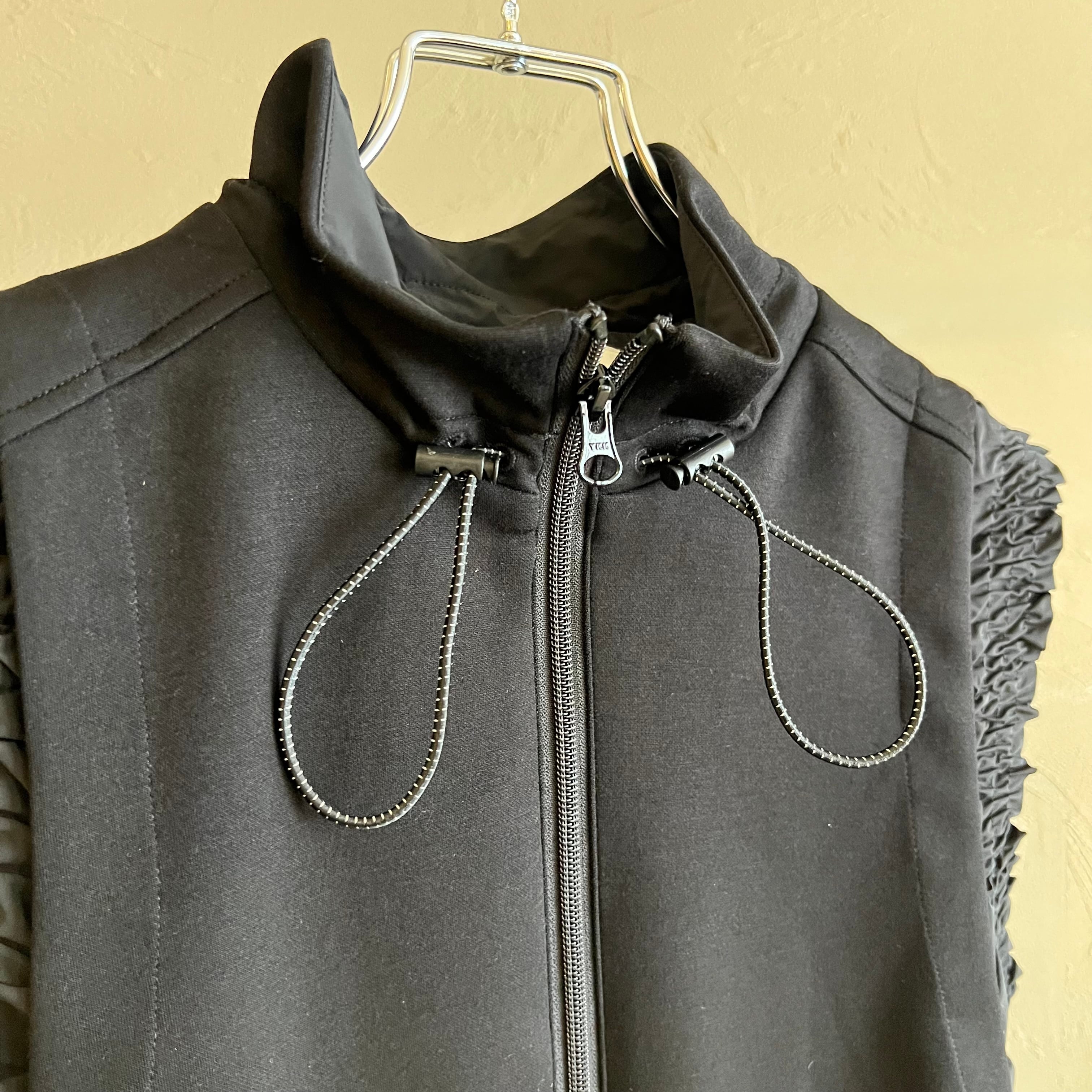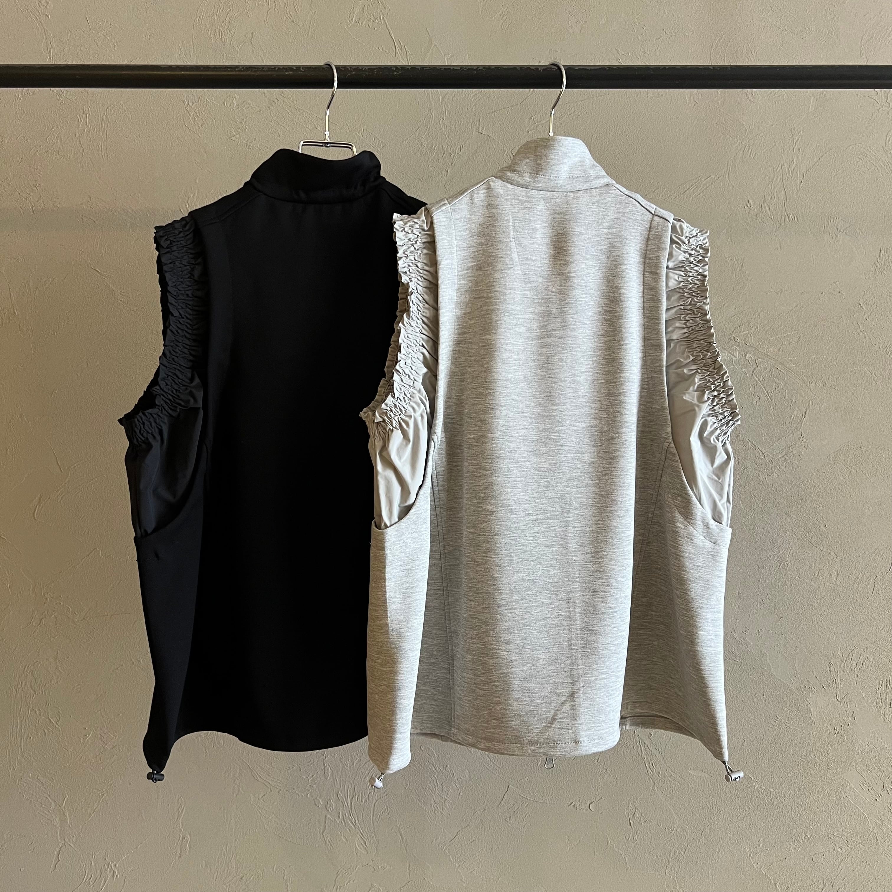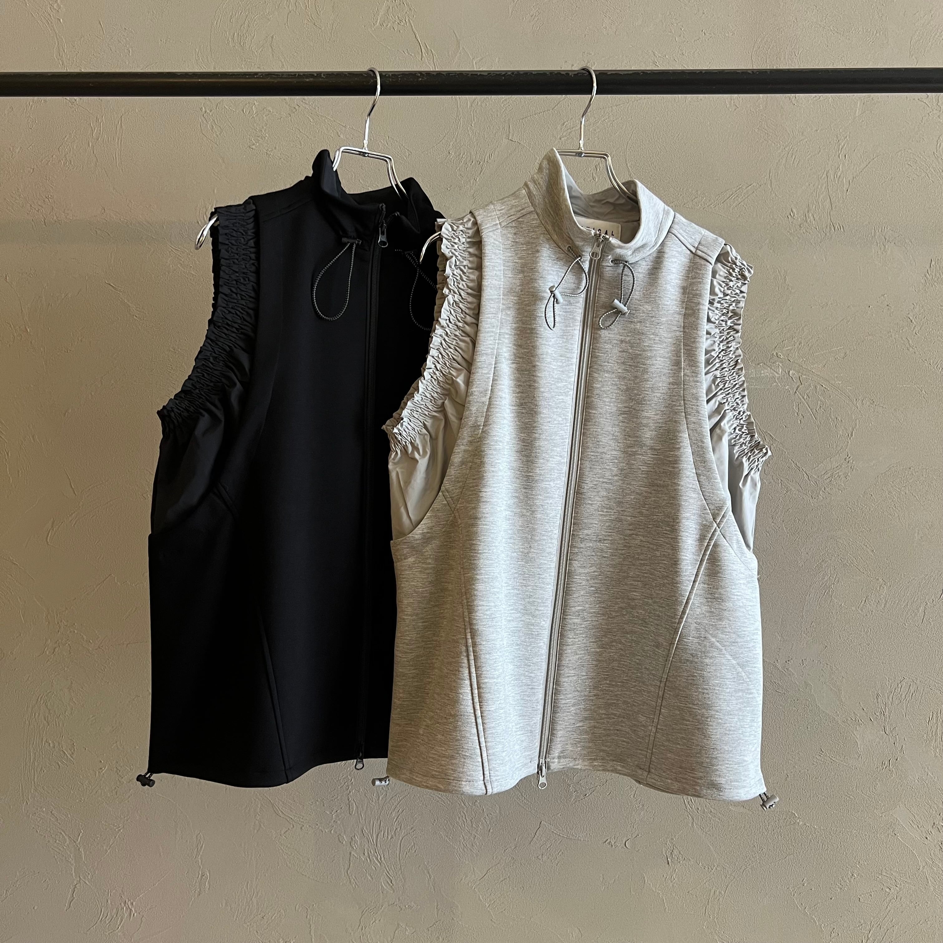 ギャザーやドローコード、もっちりとした軽いダンボール生地と光沢感のあるタフタ生地の異素材ドッキングで、デザインに拘ったジップアップベスト。