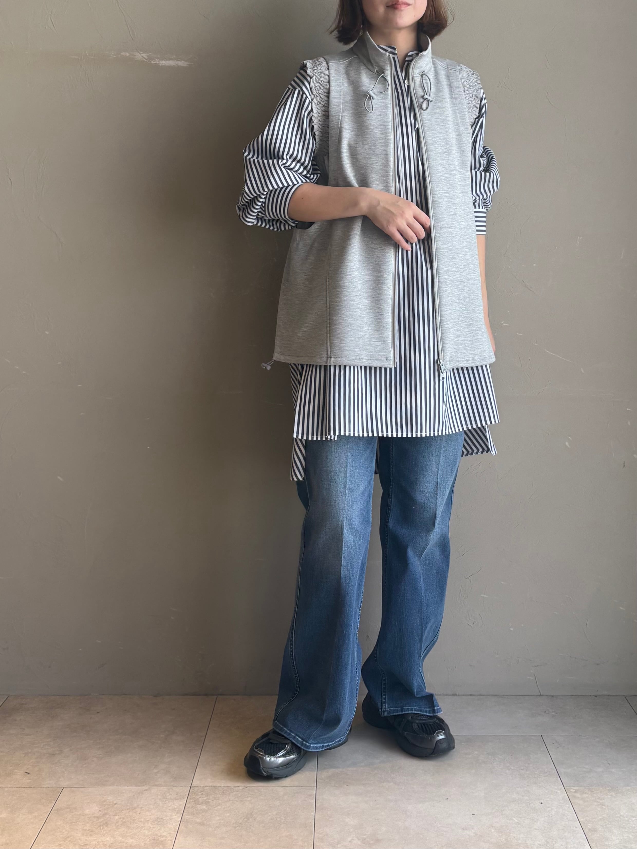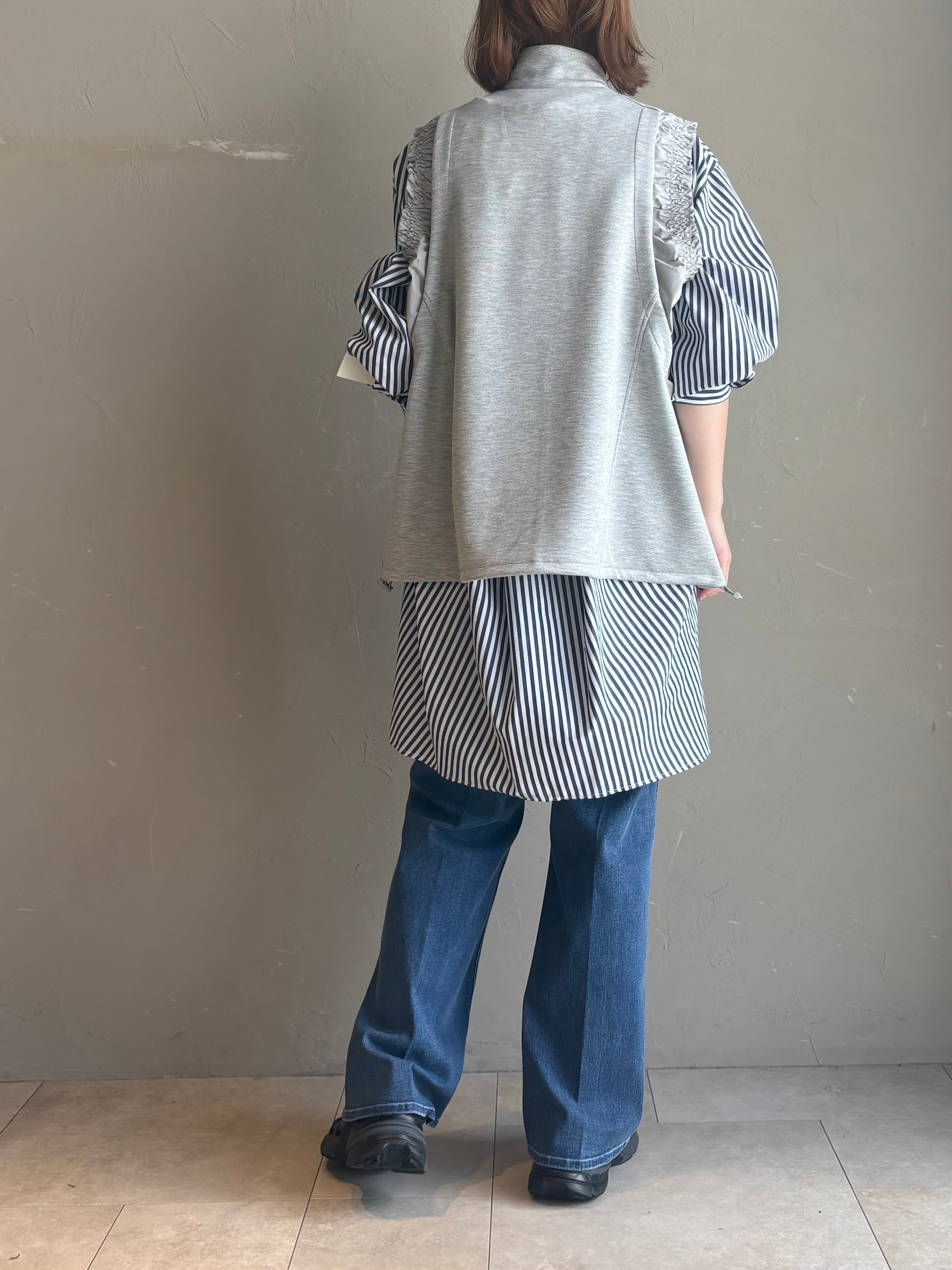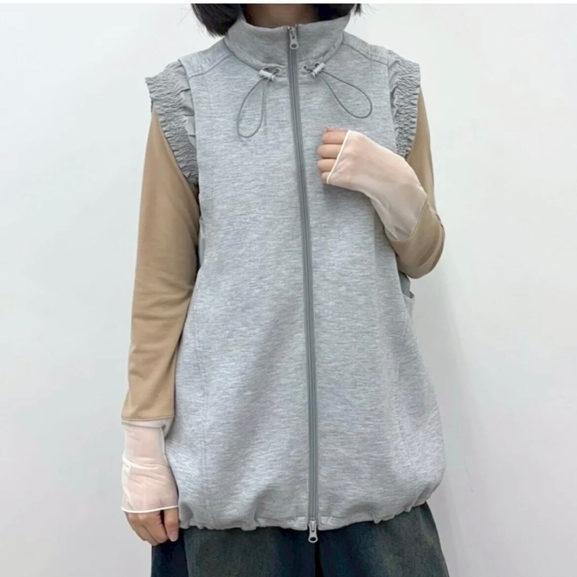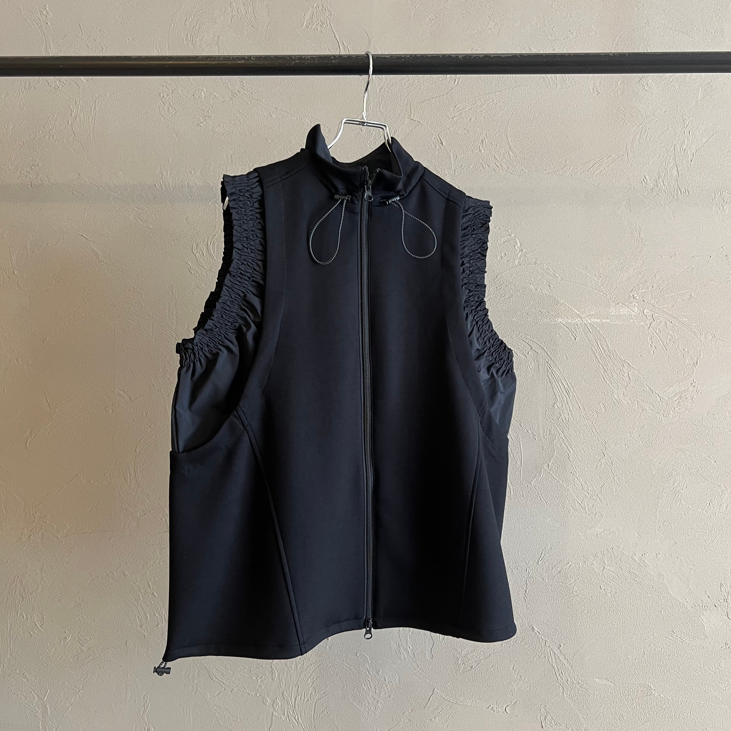 ギャザーやドローコード、もっちりとした軽いダンボール生地と光沢感のあるタフタ生地の異素材ドッキングで、デザインに拘ったジップアップベスト。