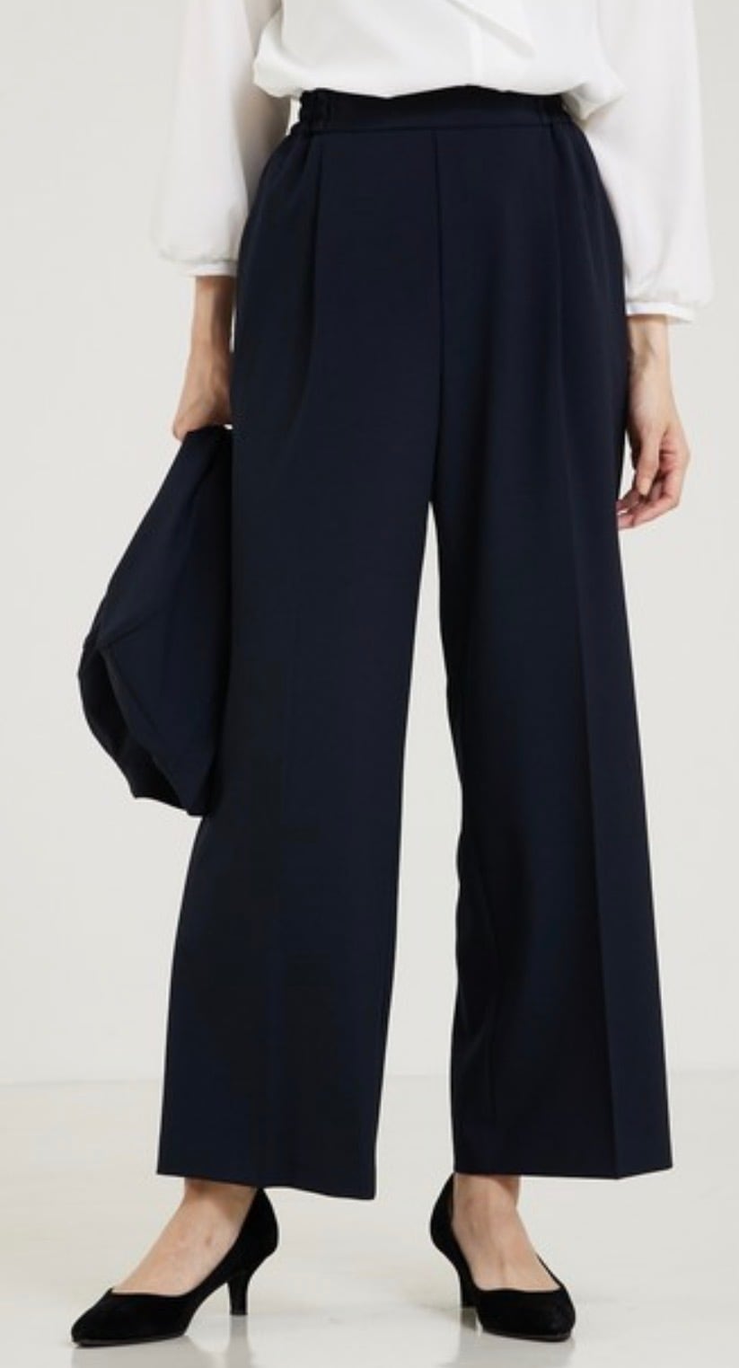 少しゆったり目のストレートシルエットのタックパンツ。ウエストは脇までゴムが入っていて履き心地抜群なのにシルエットも綺麗な1枚。