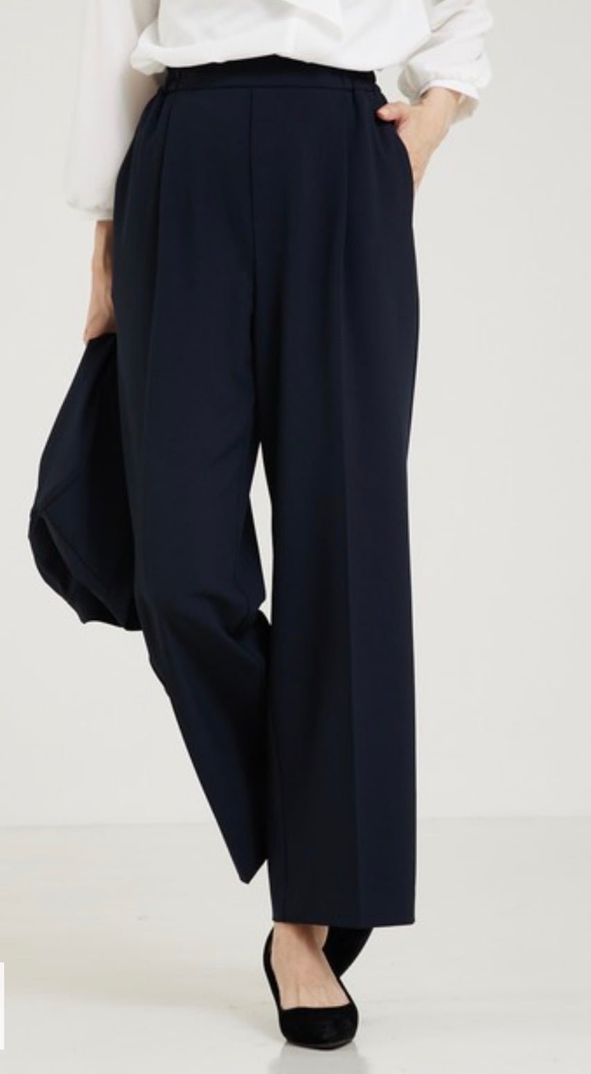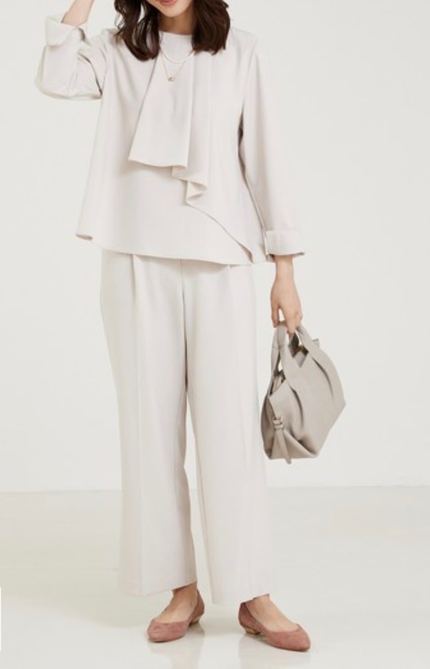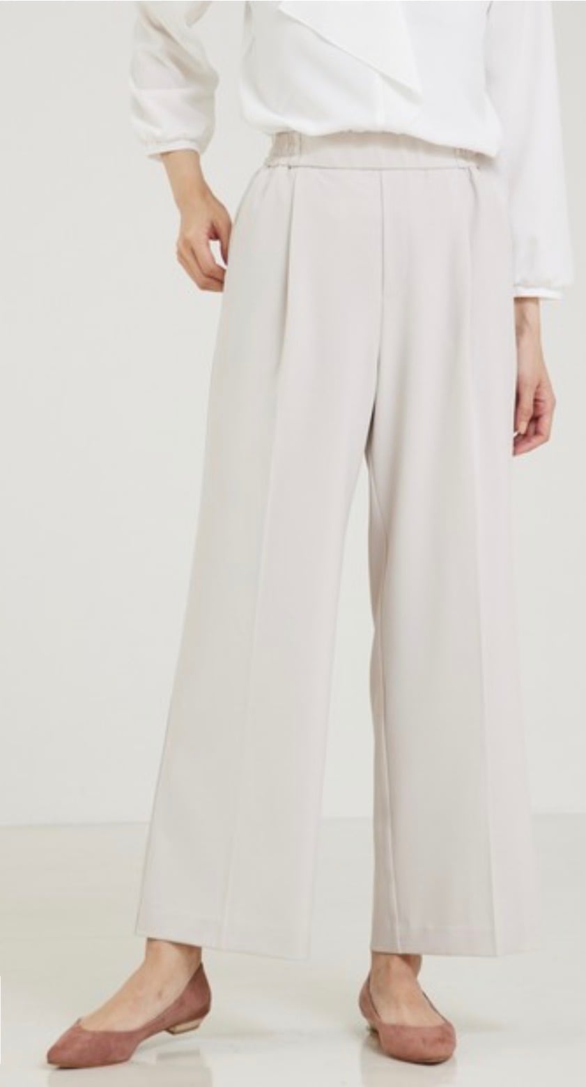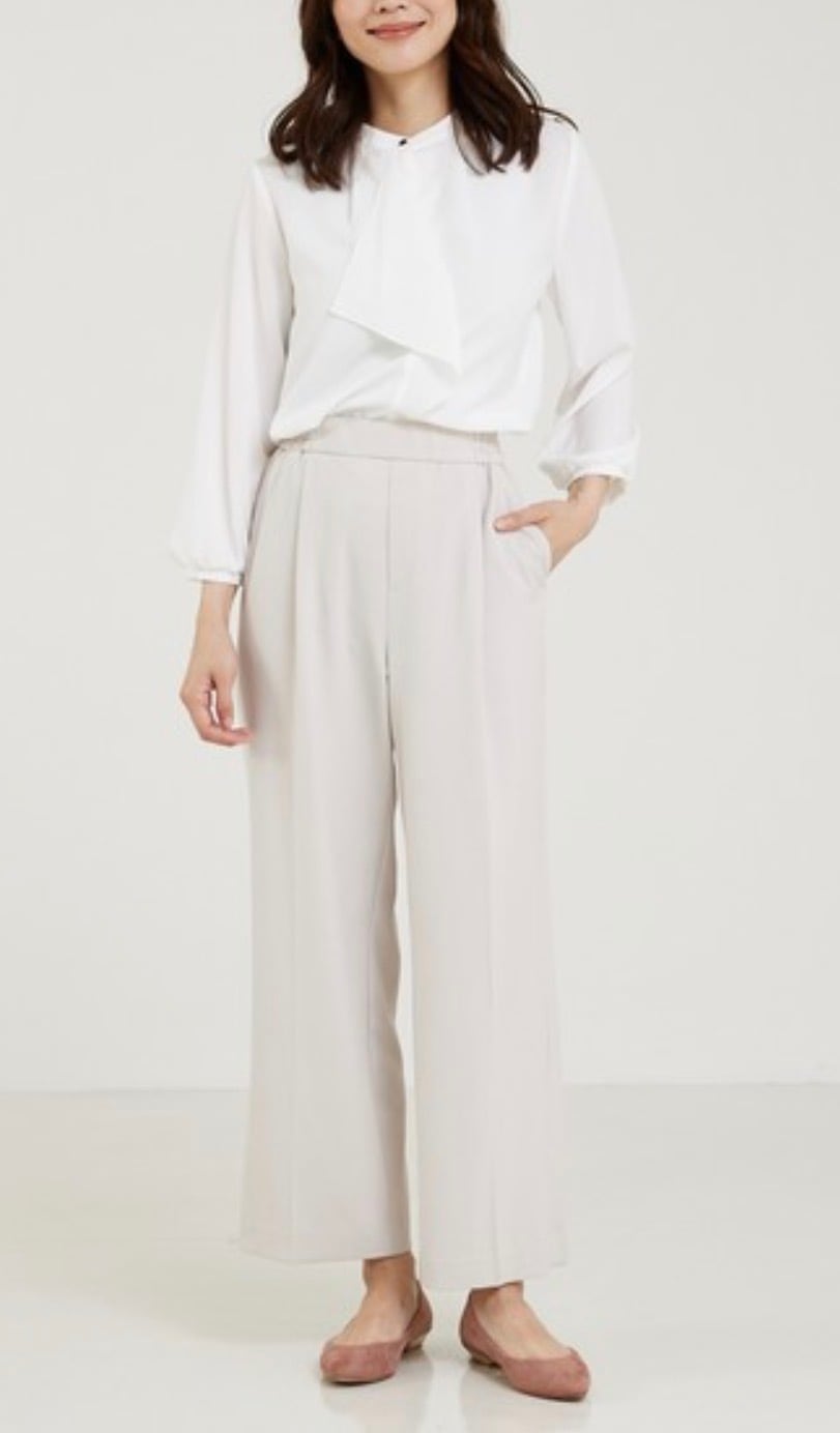 ウエストゴム仕様ながら、きちんと見えするフロントデザインなのでフォーマルなシーンでのタックインのスタイリングも◎