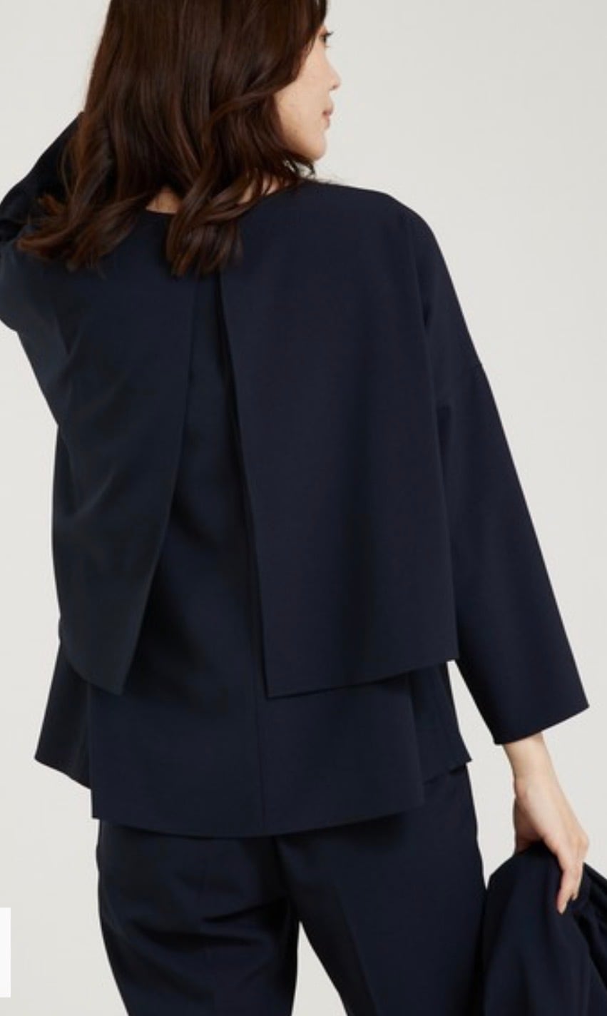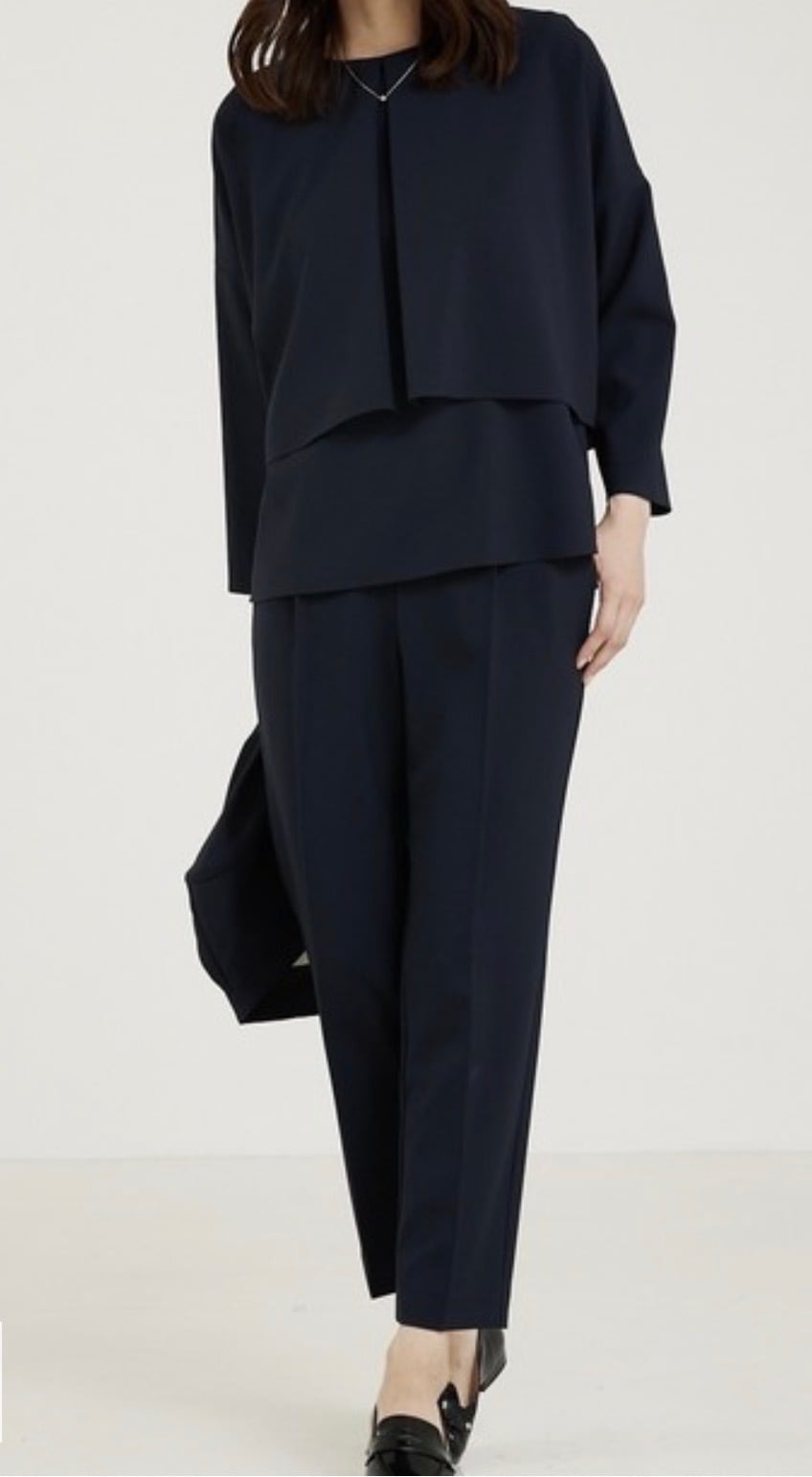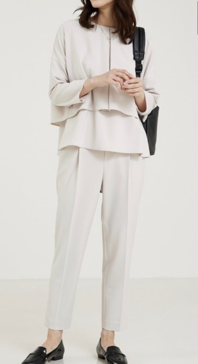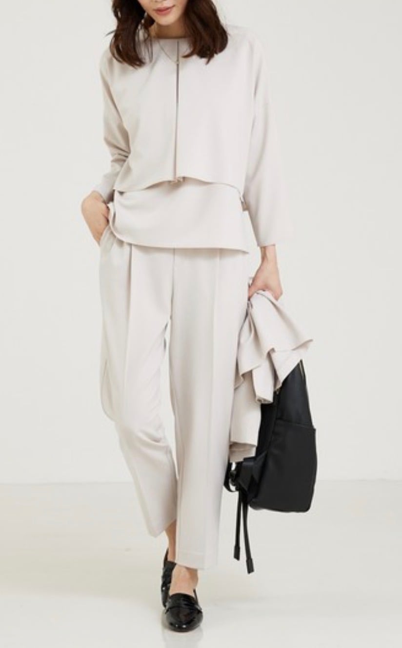 ストレッチも効いていて、程よい厚みなので通年お使いいただけます。新色グレージュのみパンツに裏地あり。