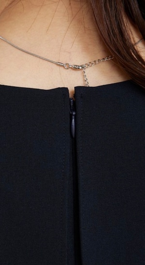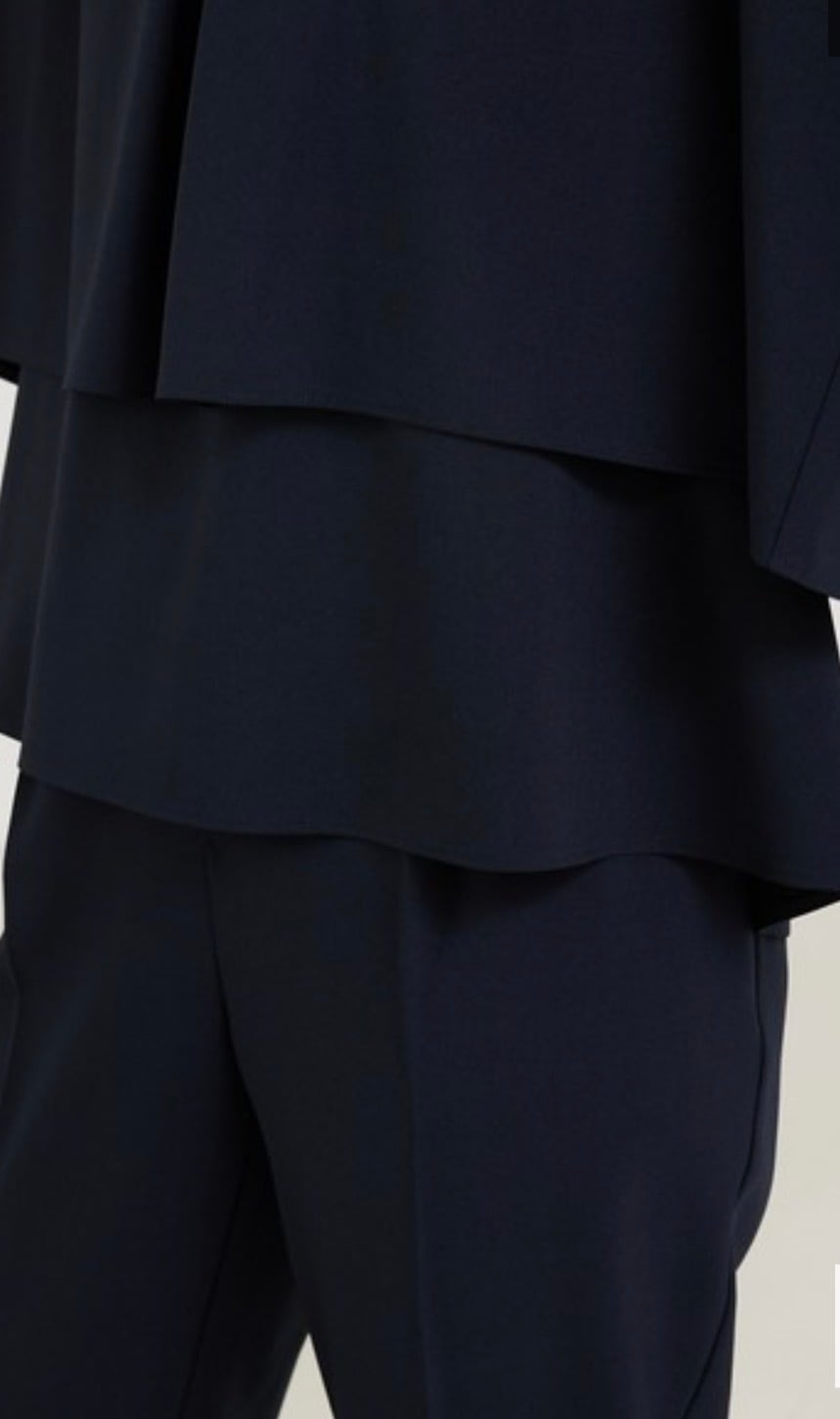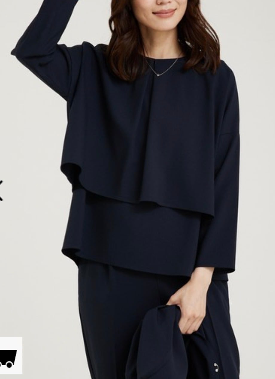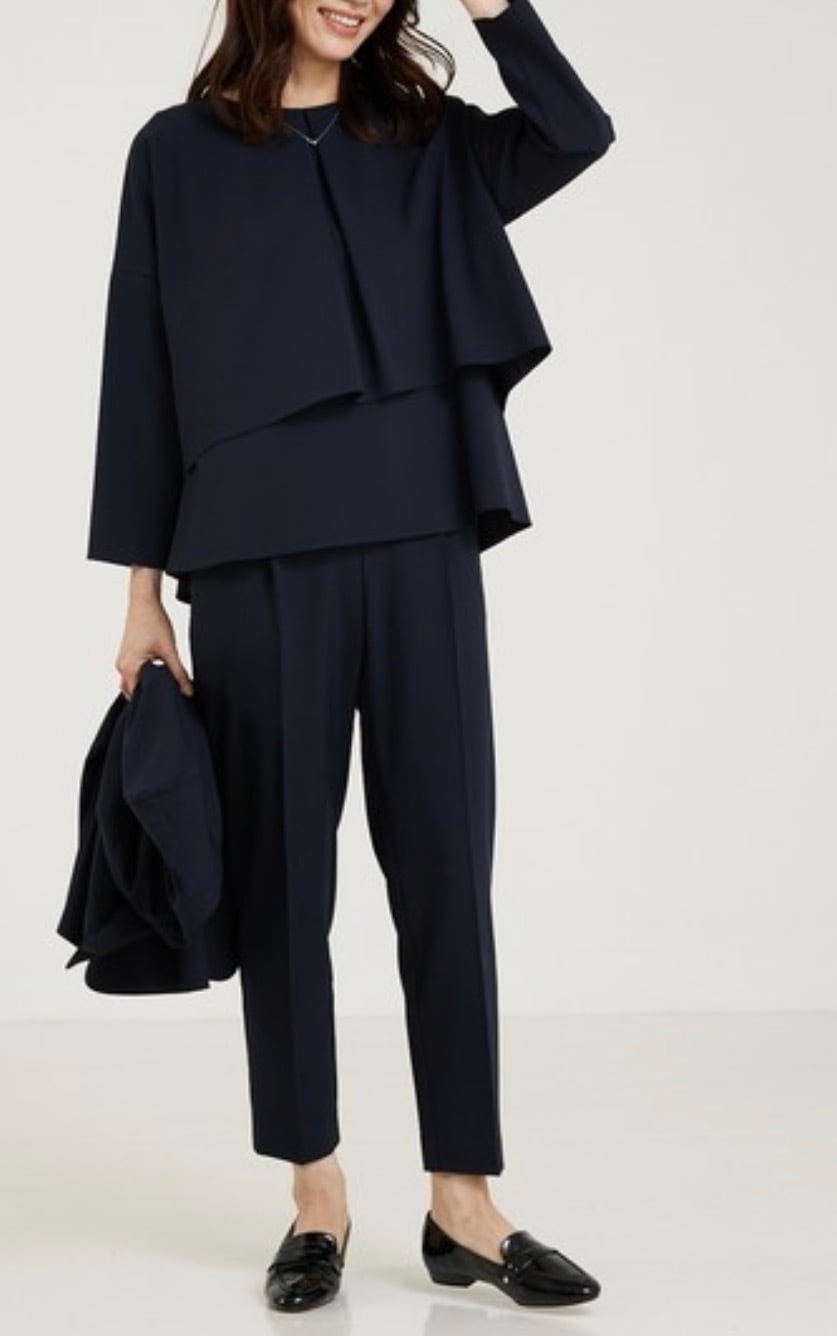 トップスはシンプルながらも2枚重ね風の裾のティアードと後ろのフレアーの重なりが動きを出してくれます。