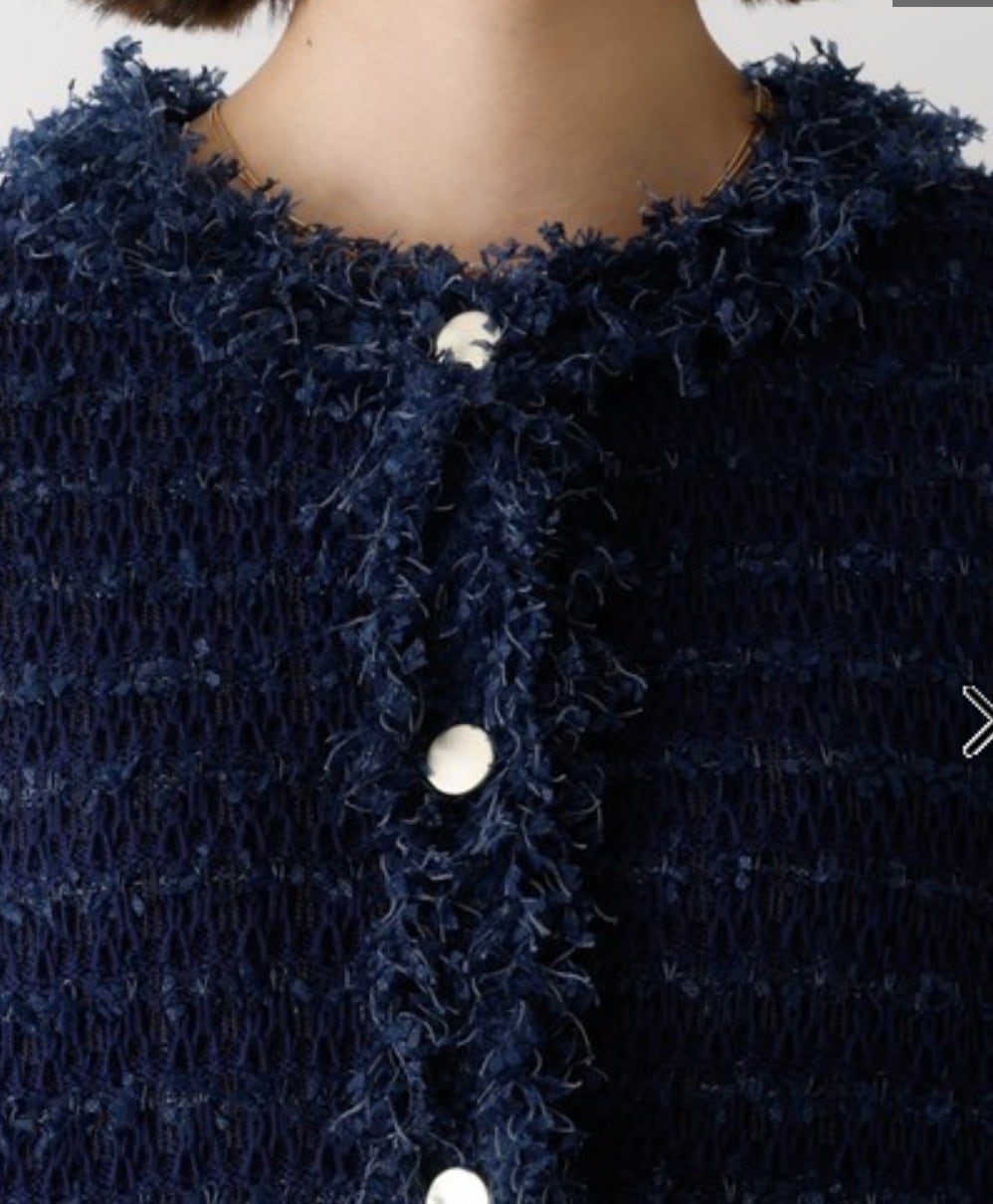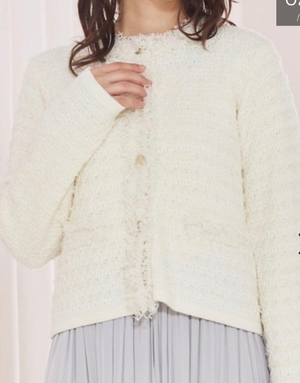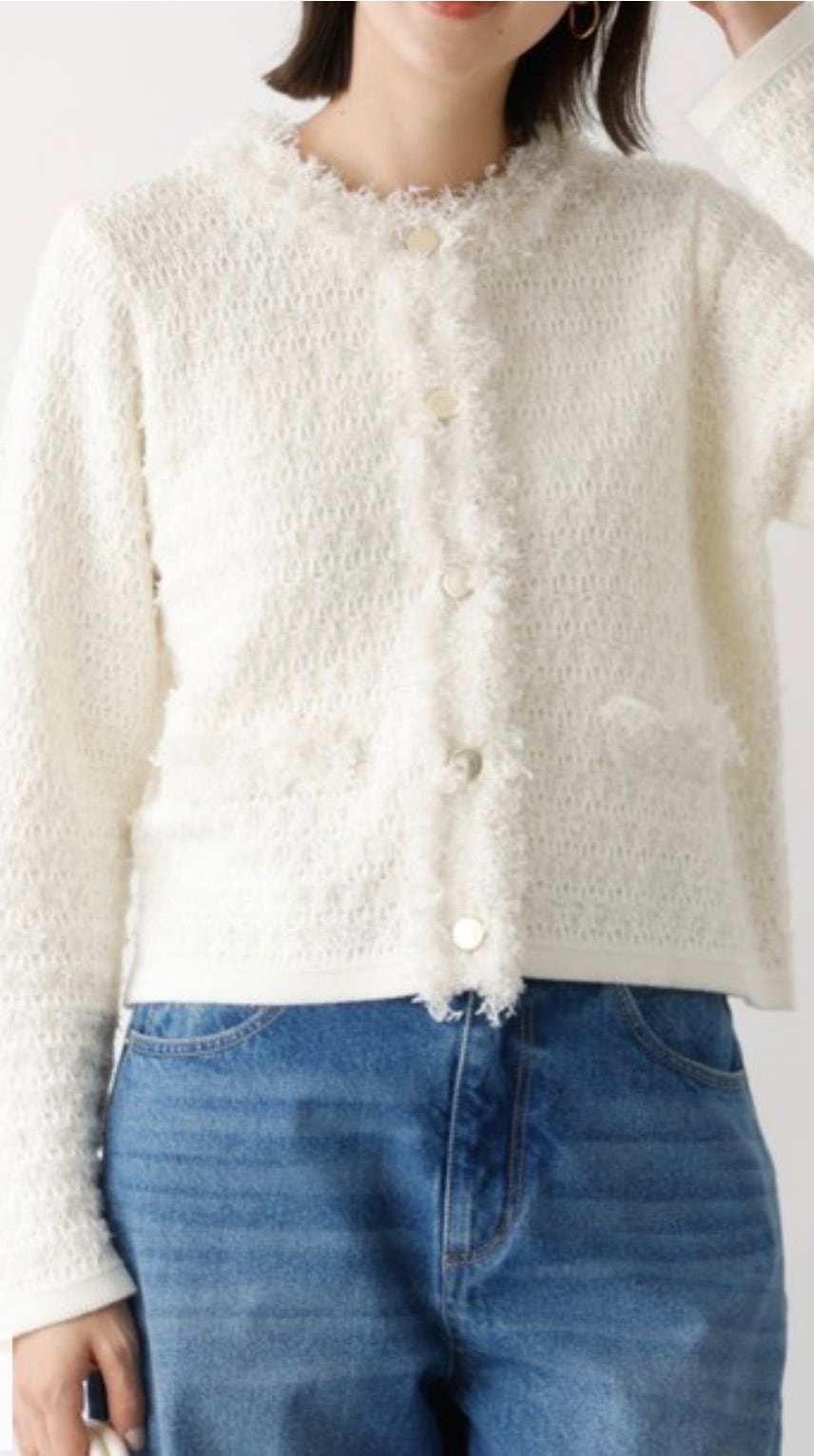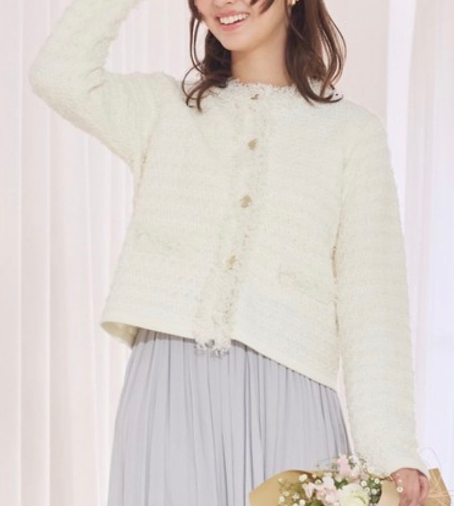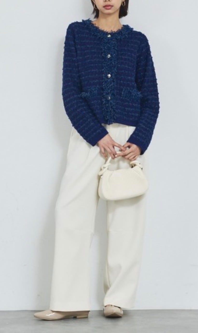 柔らかく着心地の良いジャケット風ニットカーディガン。端のフリンジが華やかなツイード織り、さらにシャネルカラーでジャケットとしての存在感をちゃんともつ1着。トレンドのコンパクトタイプ、でも実は素材がニットなのでトップス感覚で楽に着れちゃう嬉しい女子アイテムです。スタイリング次第でカジュアルからオケージョンまで幅広く活躍します。