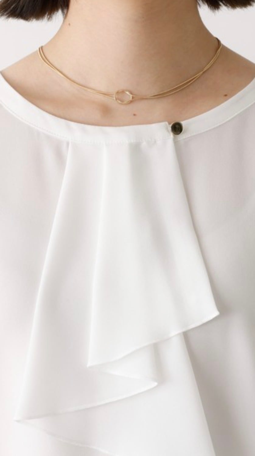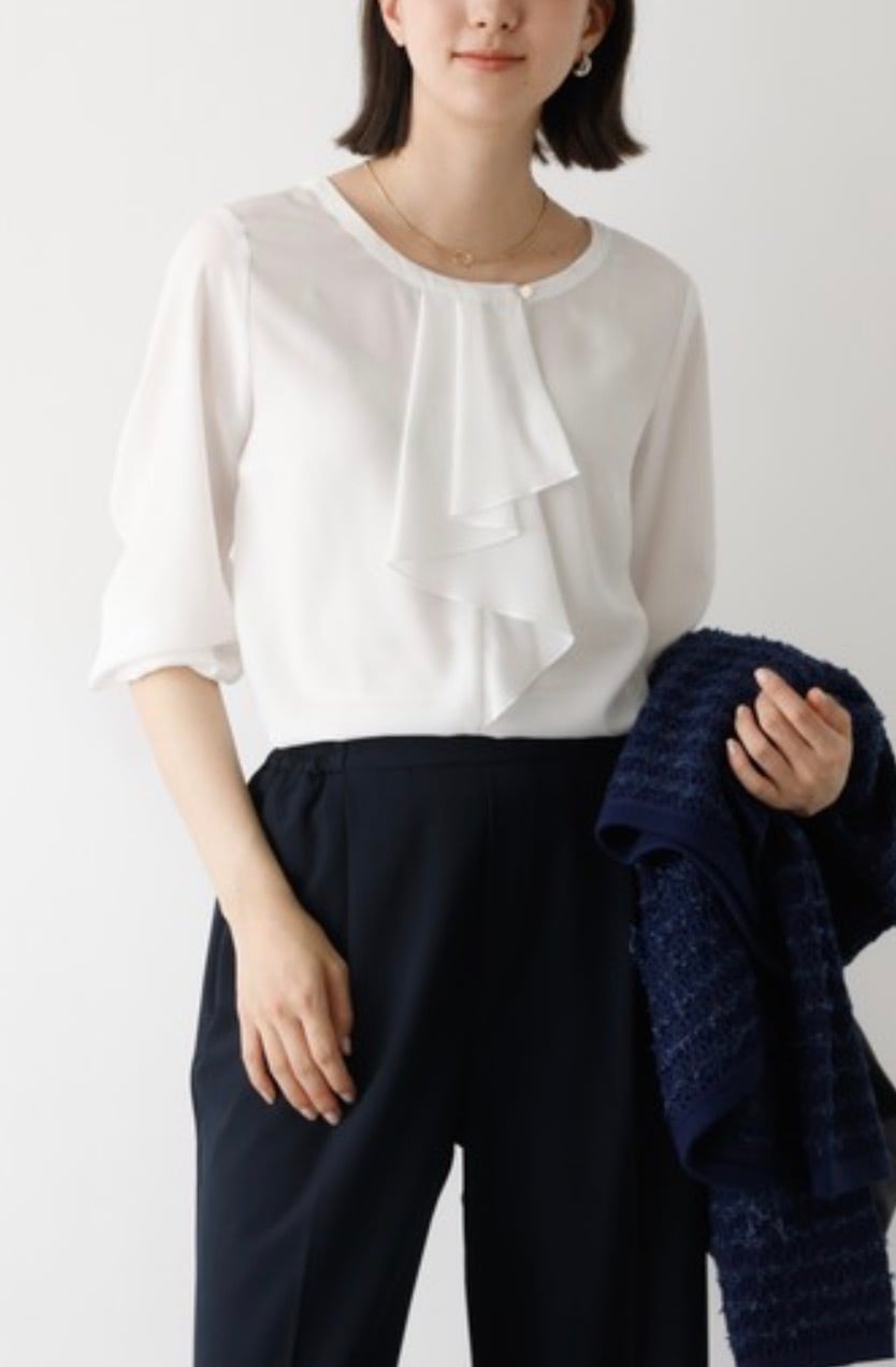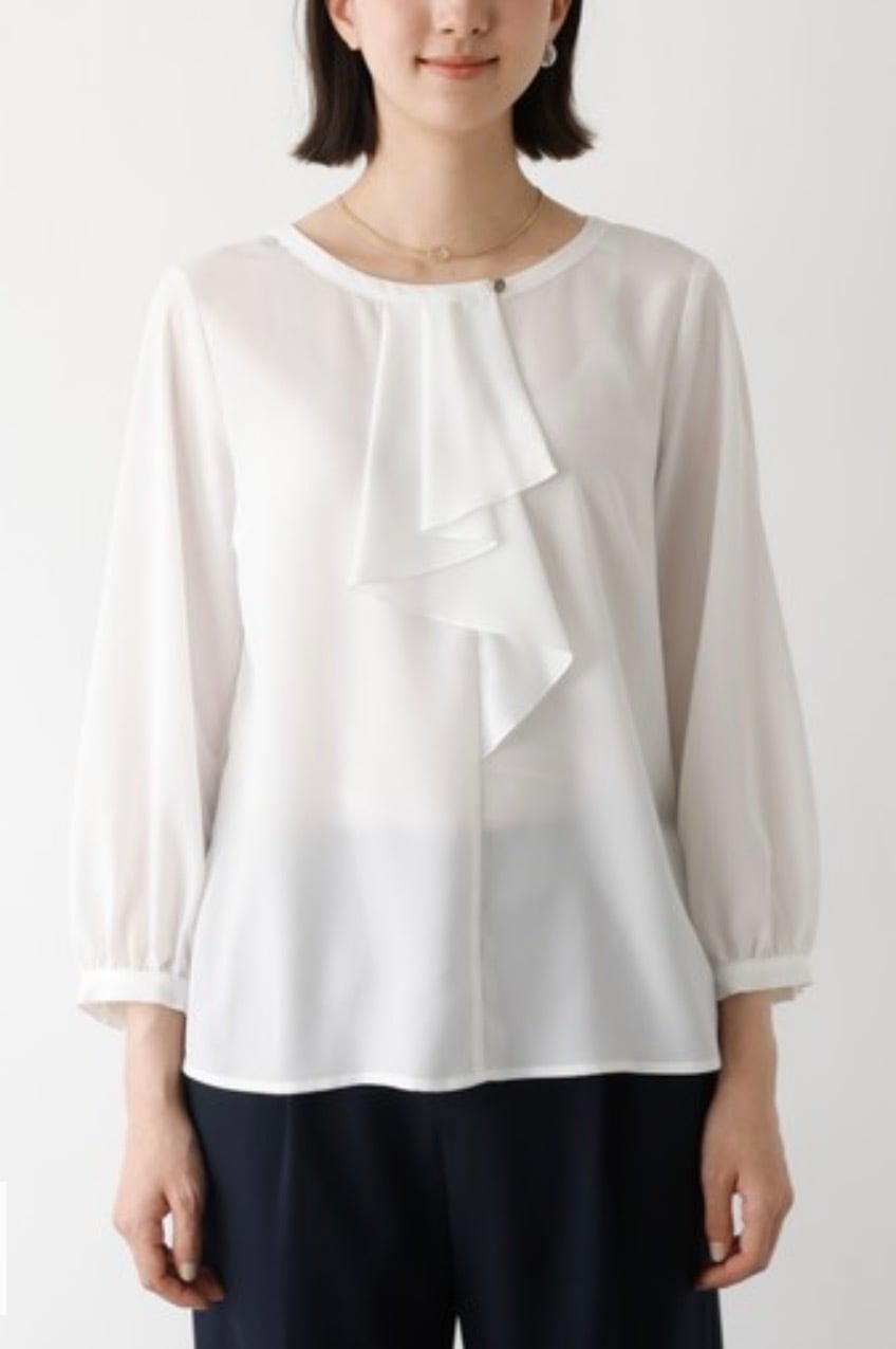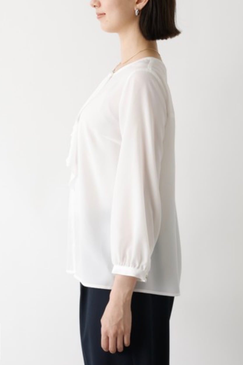 オケージョンなどのシーンに欠かせないホワイトブラウス。シーズンレスで使えて、ジャケットやカーディガンなどさまざまな羽織に対応出来るよう追及、サイズ感、袖丈、衿のデザインにこだわって仕上げました。作業時時などにまくりやすいよう袖口は目立ちにくいゴム入り、衿のフリルは下を向いても広がりすぎない仕様です。お仕事からセレモニーまで、大人女子なら何枚あっても困らないアイテム。
