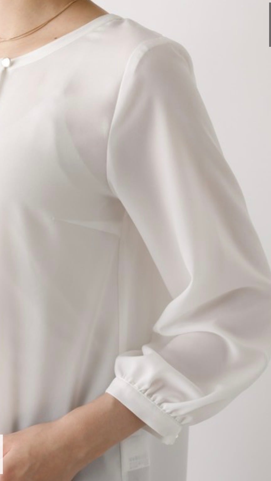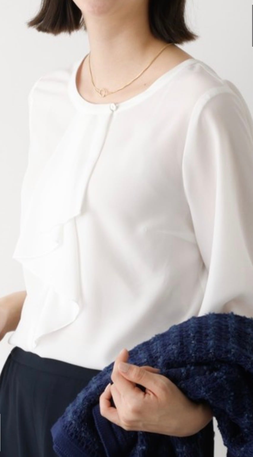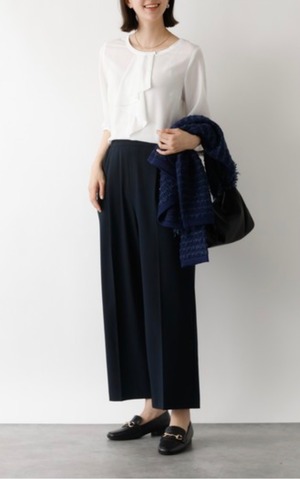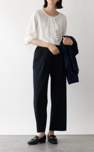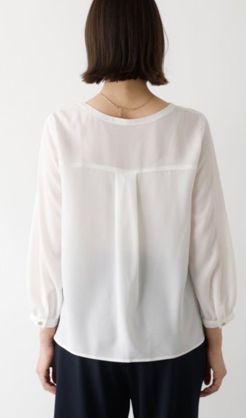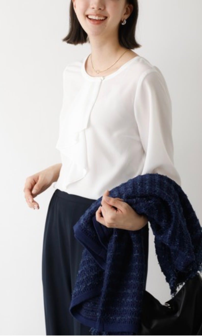 オケージョンなどのシーンに欠かせないホワイトブラウス。シーズンレスで使えて、ジャケットやカーディガンなどさまざまな羽織に対応出来るよう追及、サイズ感、袖丈、衿のデザインにこだわって仕上げました。作業時時などにまくりやすいよう袖口は目立ちにくいゴム入り、衿のフリルは下を向いても広がりすぎない仕様です。お仕事からセレモニーまで、大人女子なら何枚あっても困らないアイテム。