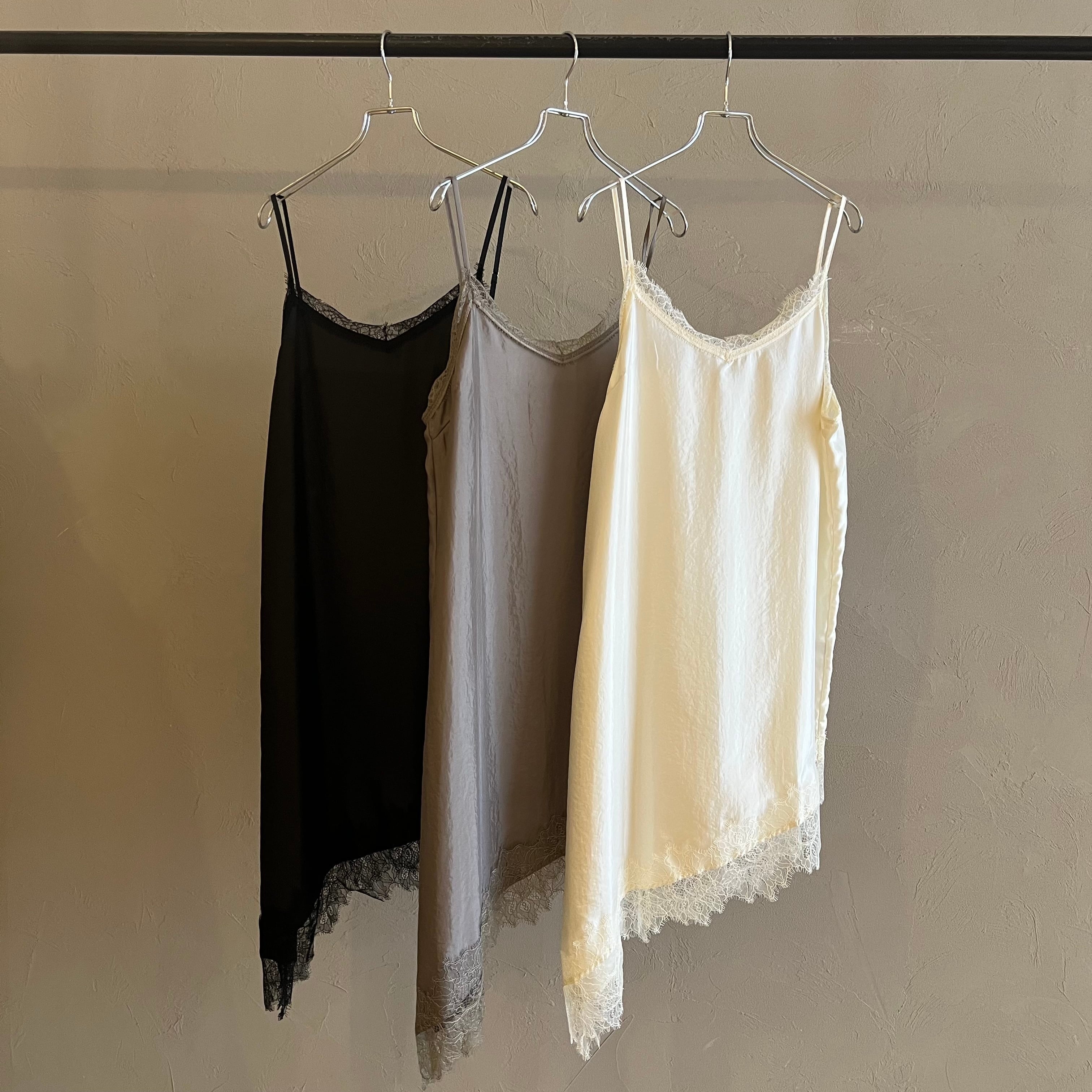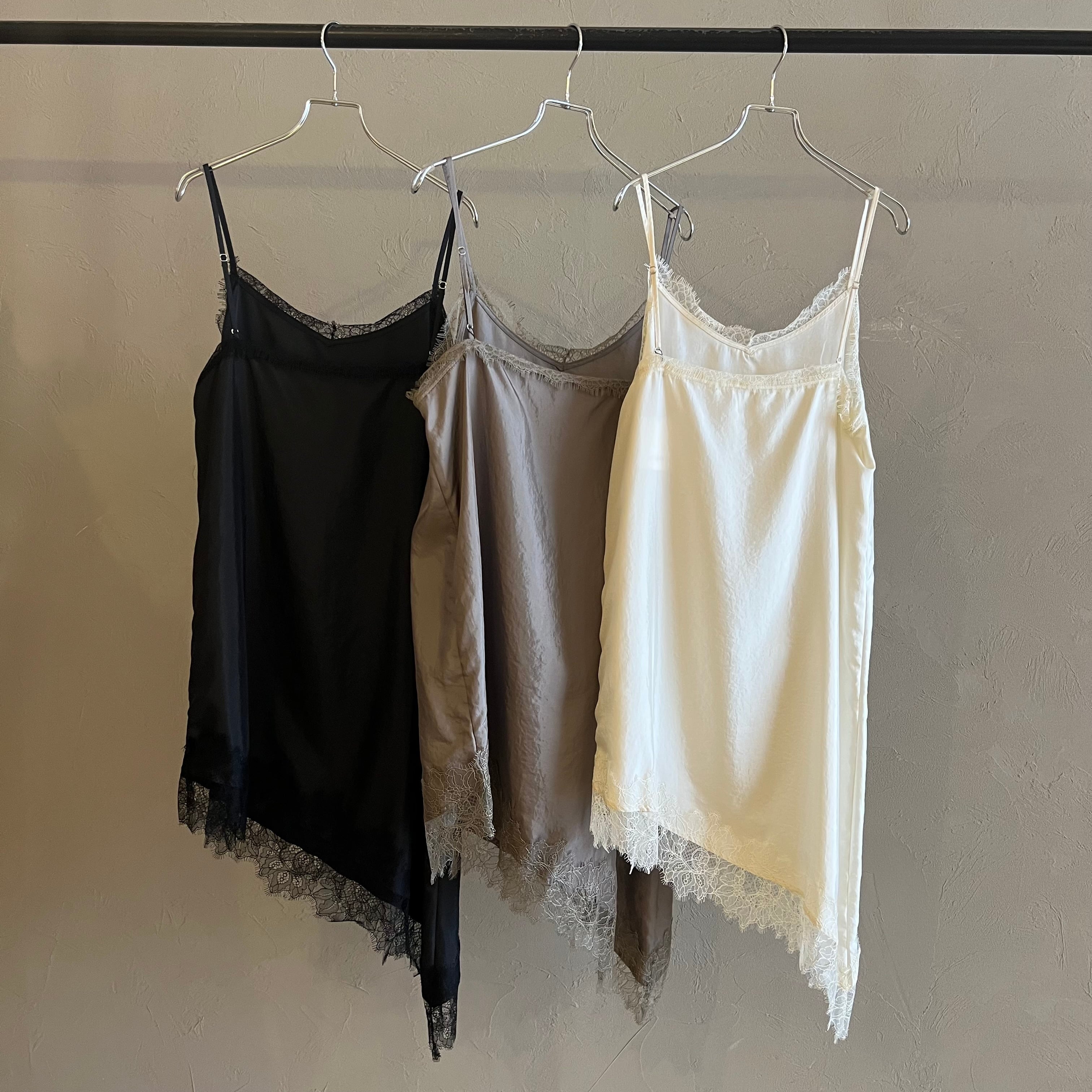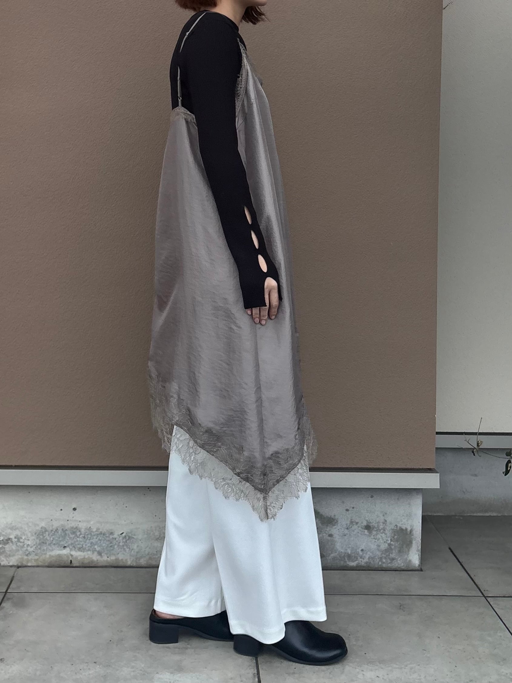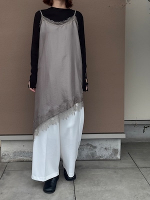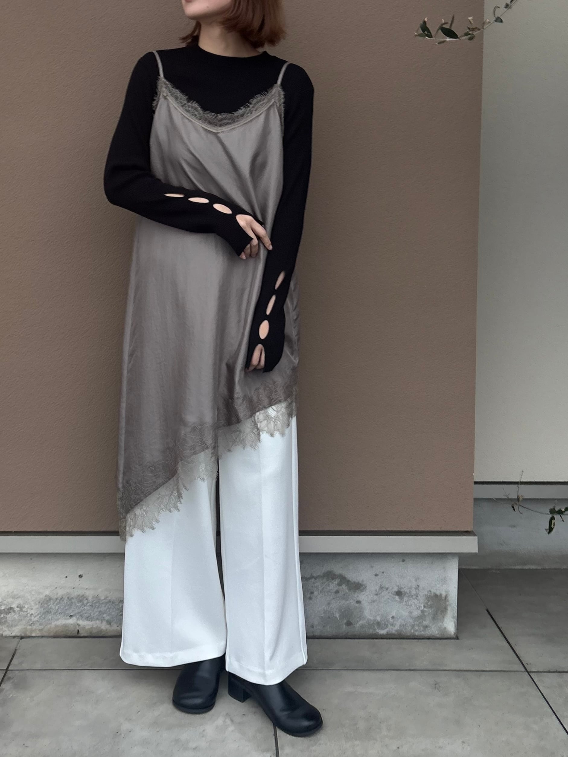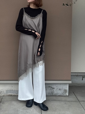 繊細レースをあしらった裾と、斜めに揺れるアシンメトリーラインで、重ねるだけで奥行きのある着こなしに。