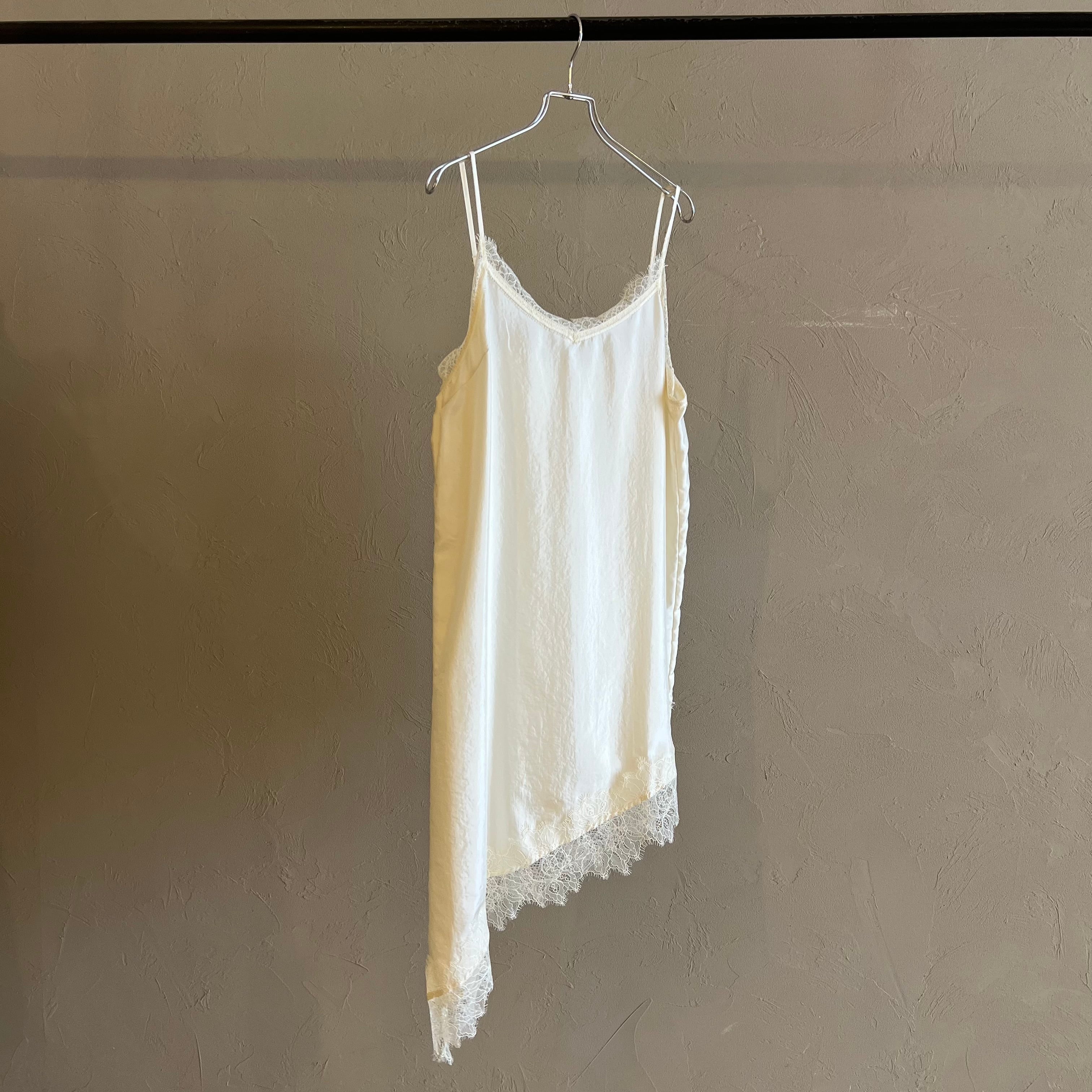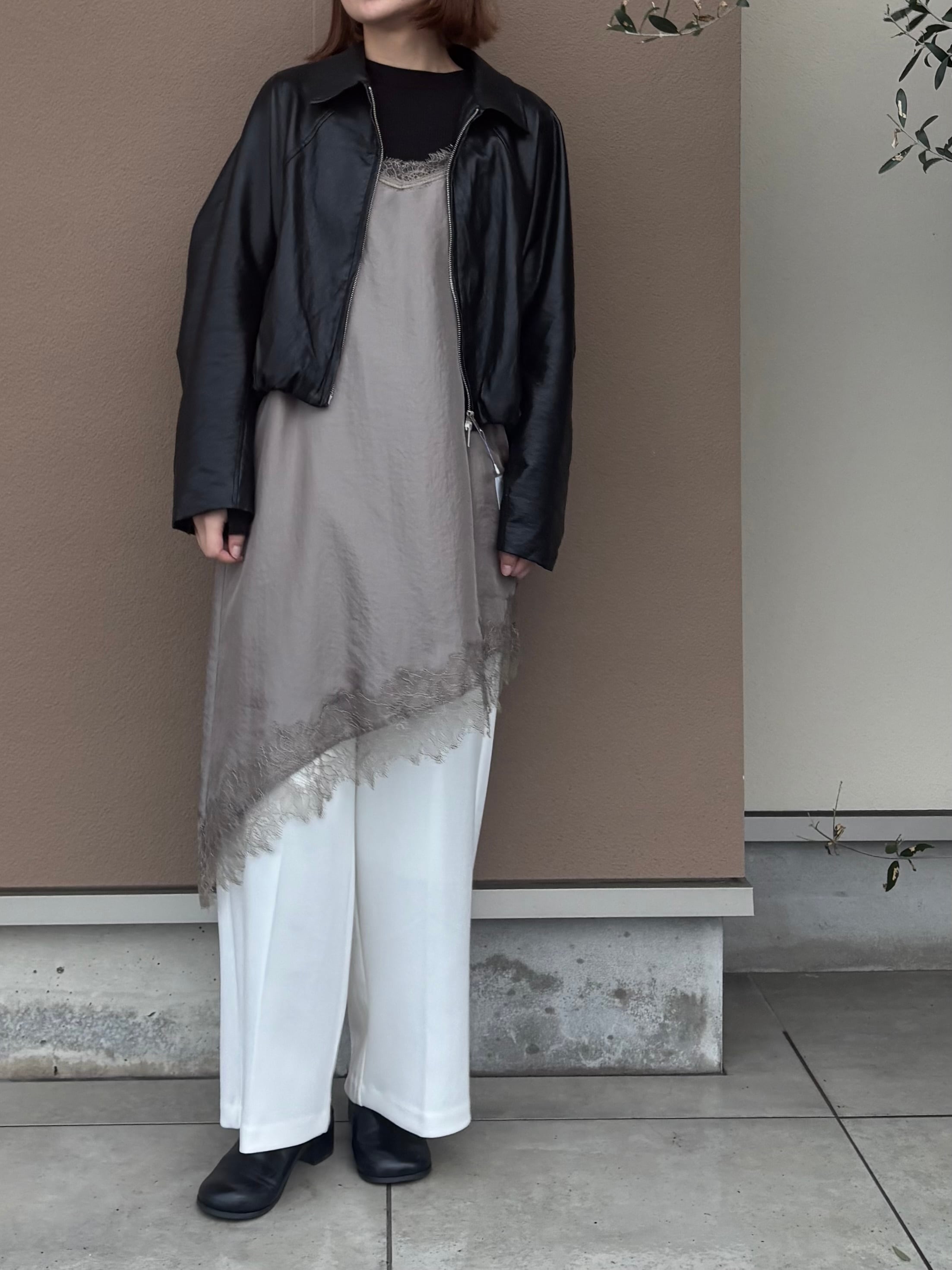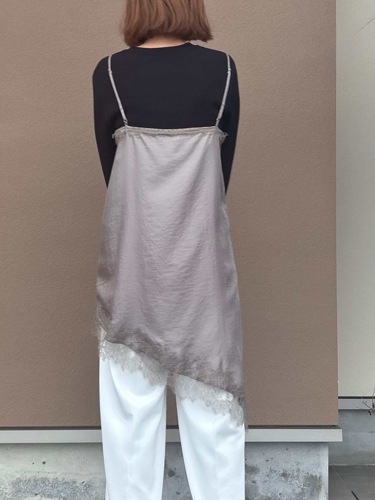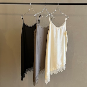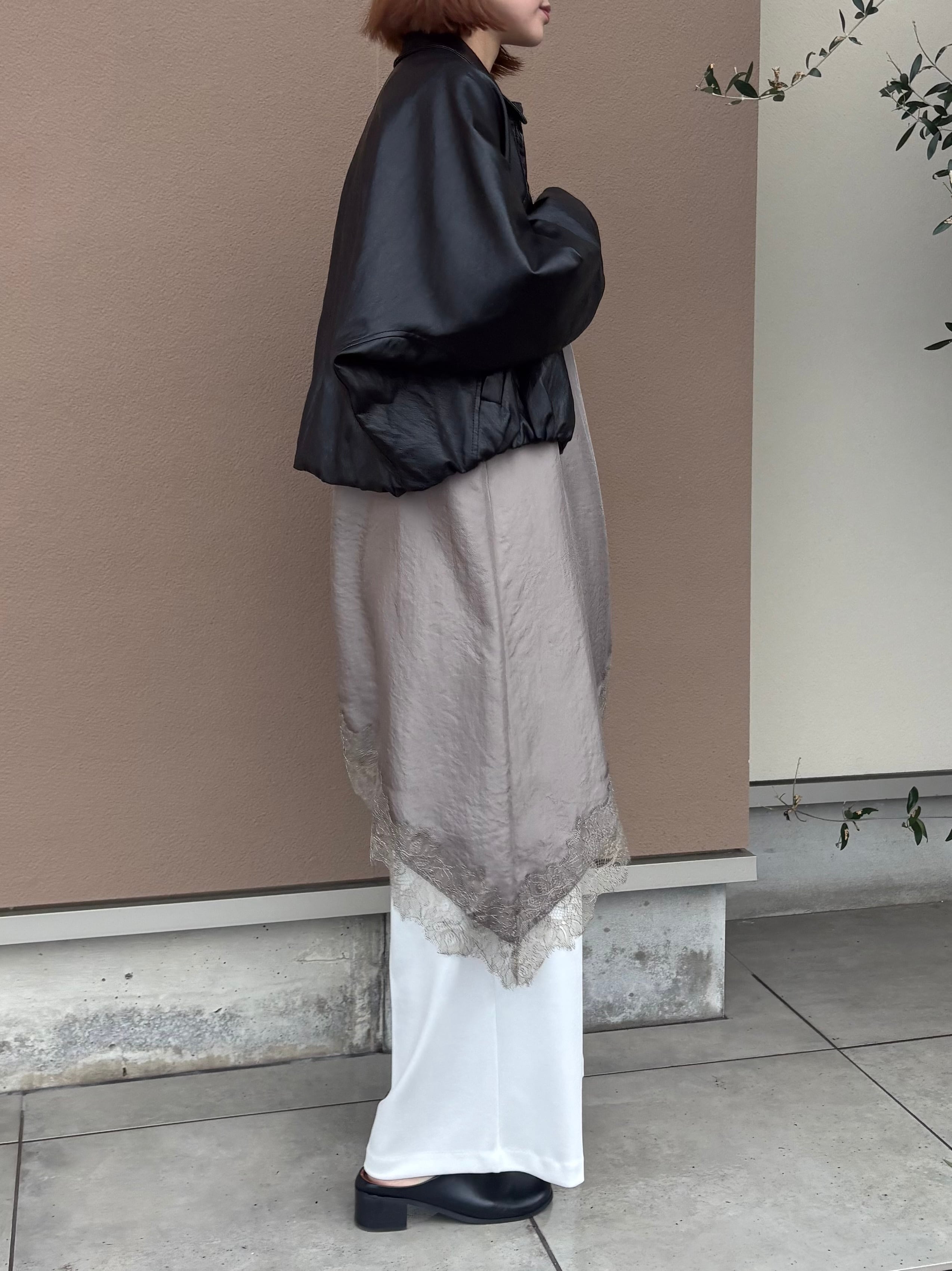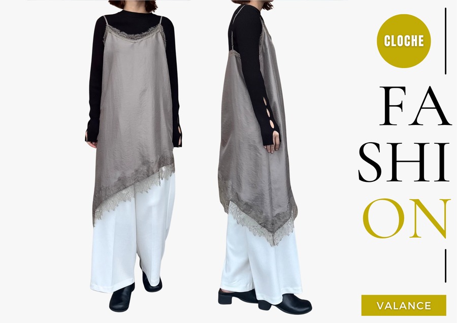 繊細レースをあしらった裾と、斜めに揺れるアシンメトリーラインで、重ねるだけで奥行きのある着こなしに。
