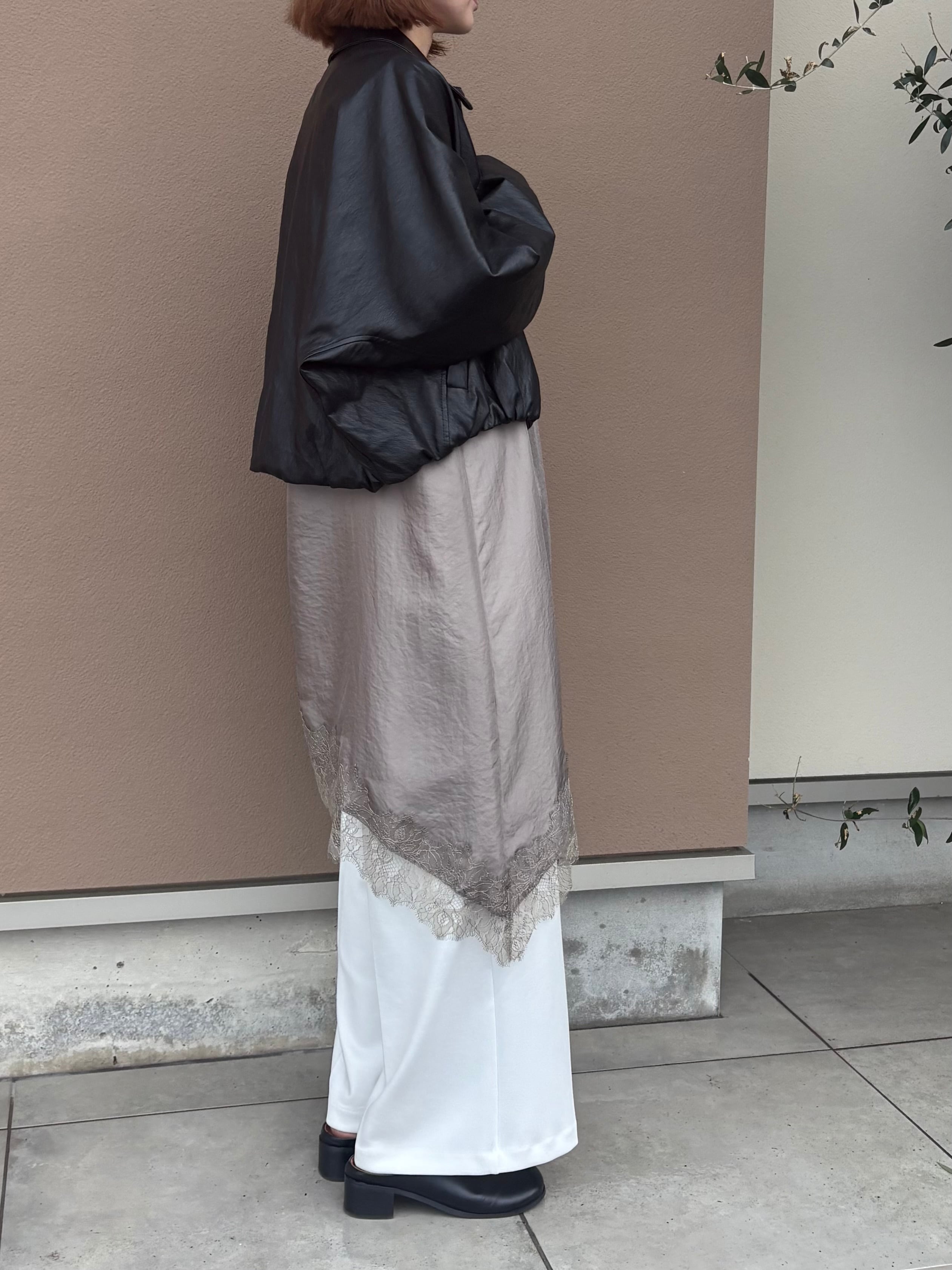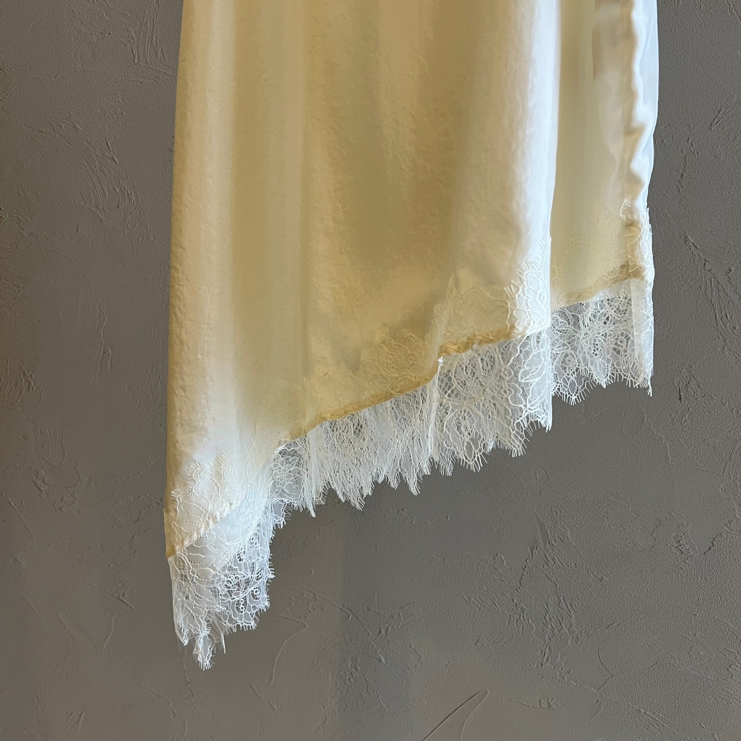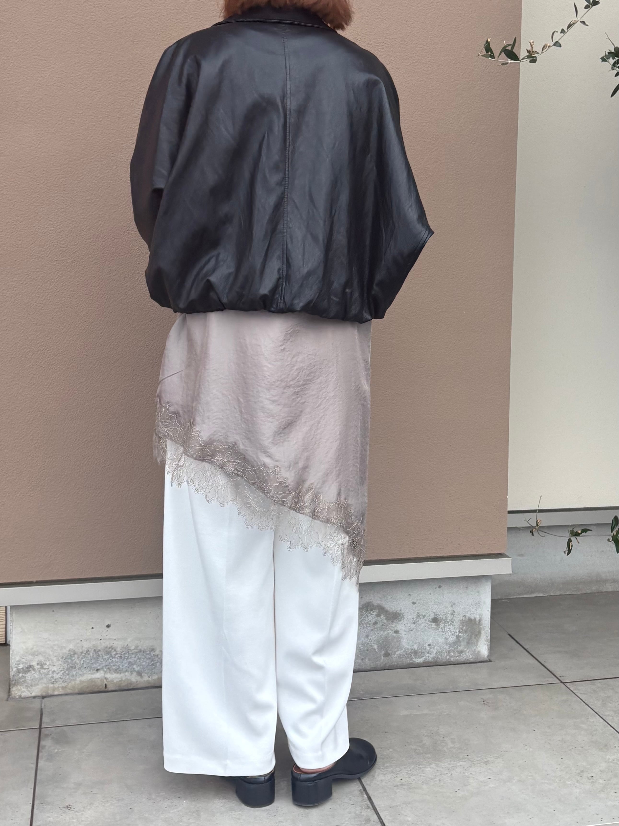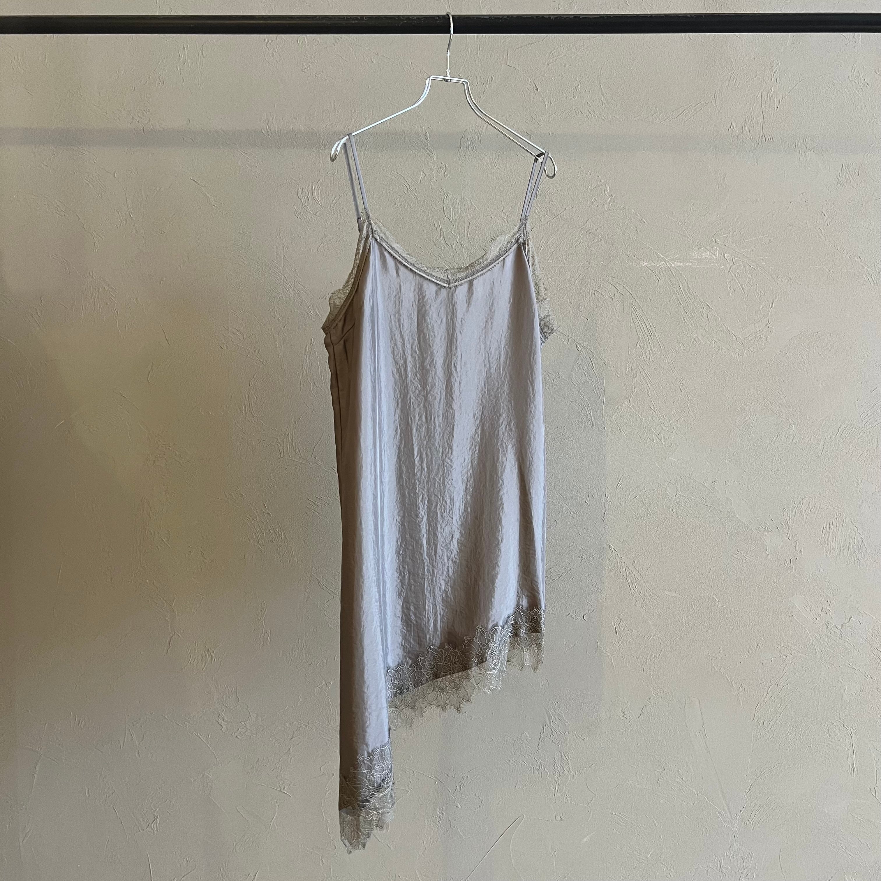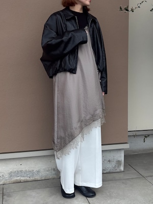 繊細レースをあしらった裾と、斜めに揺れるアシンメトリーラインで、重ねるだけで奥行きのある着こなしに。