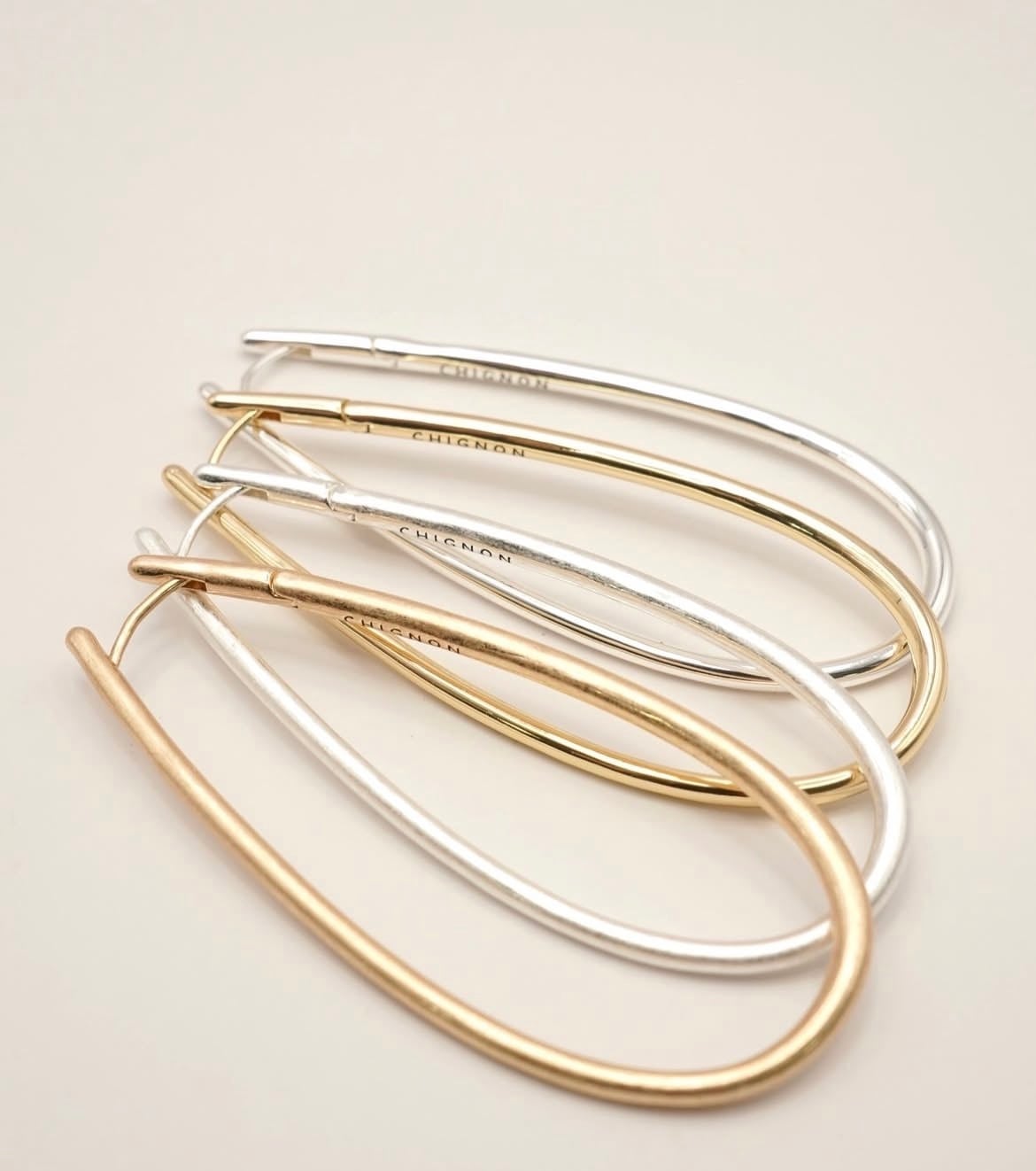 線径の太さを箇所によって少しずつ変えているので単調になりすぎず&独特なニュアンス感が出過ぎないようにスッキリしたデザインに仕上げています。また、キャッチレスなのでキャッチを無くす心配も無く、着脱もスムーズにできるのもポイントです。大振りなサイズなので小顔効果も◎