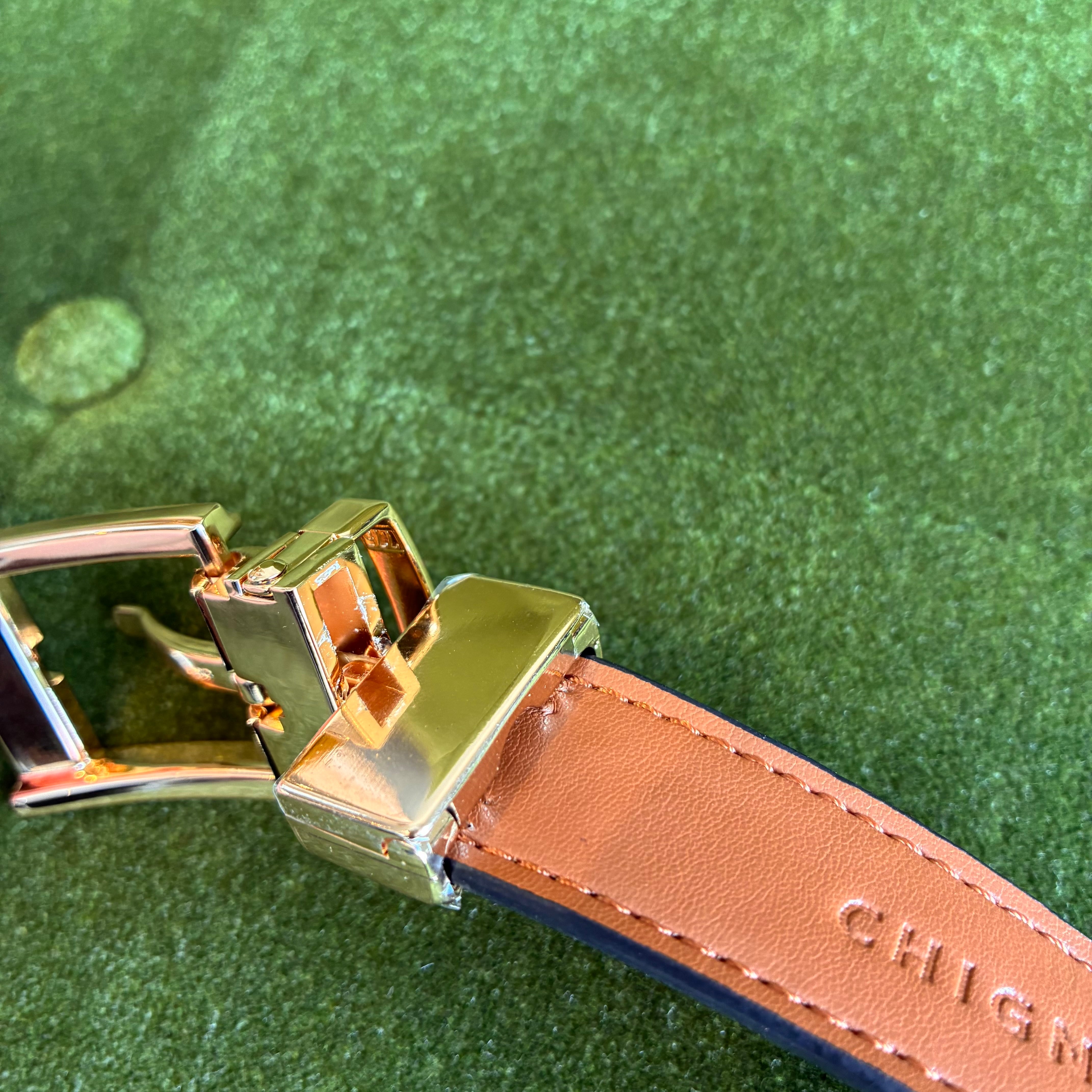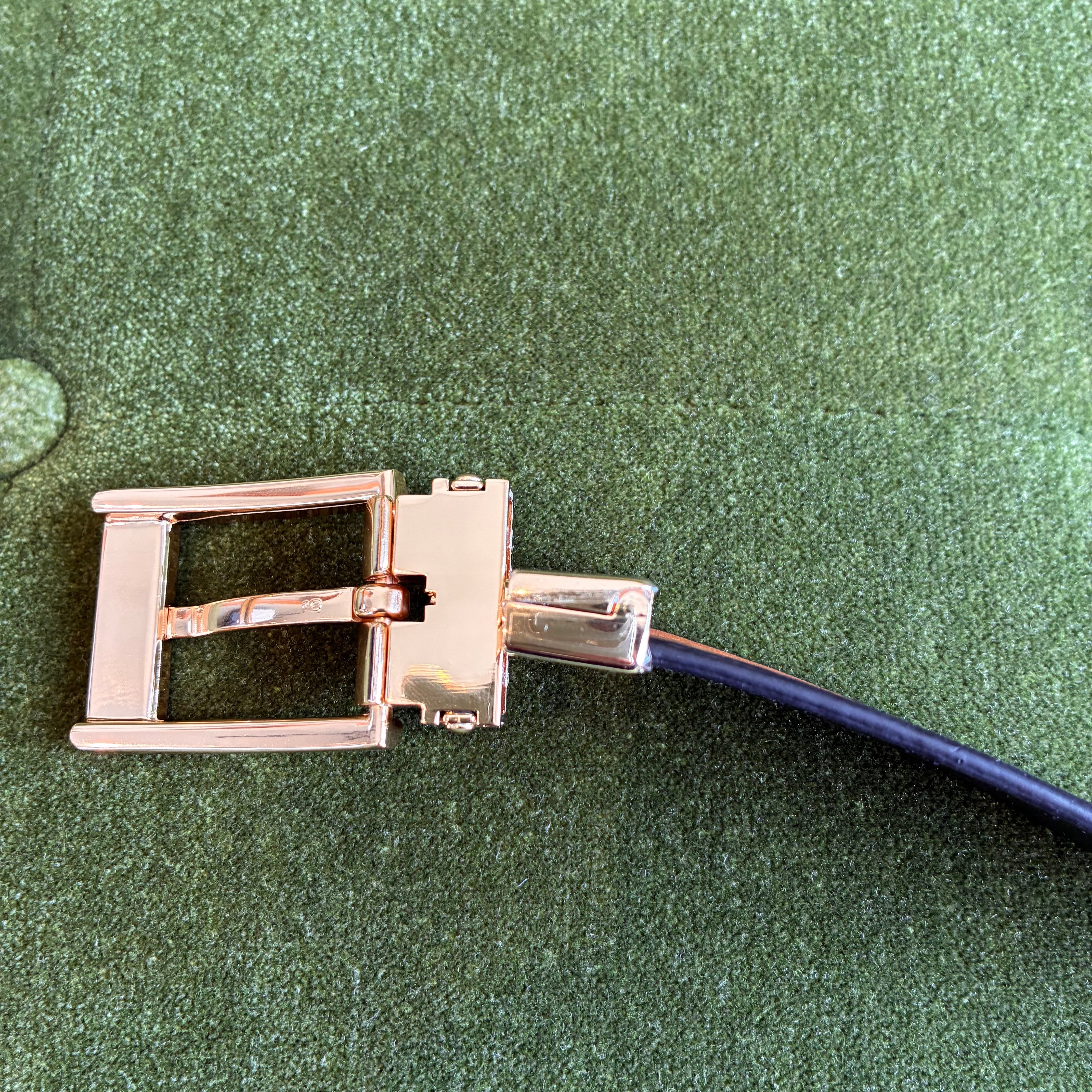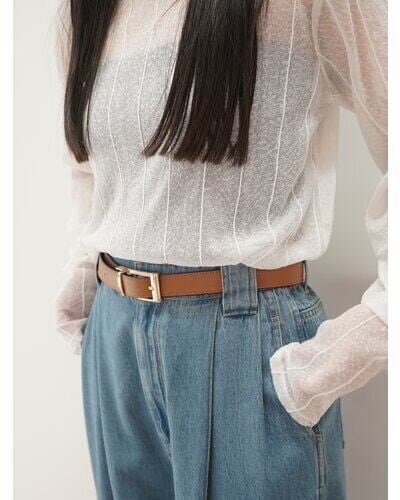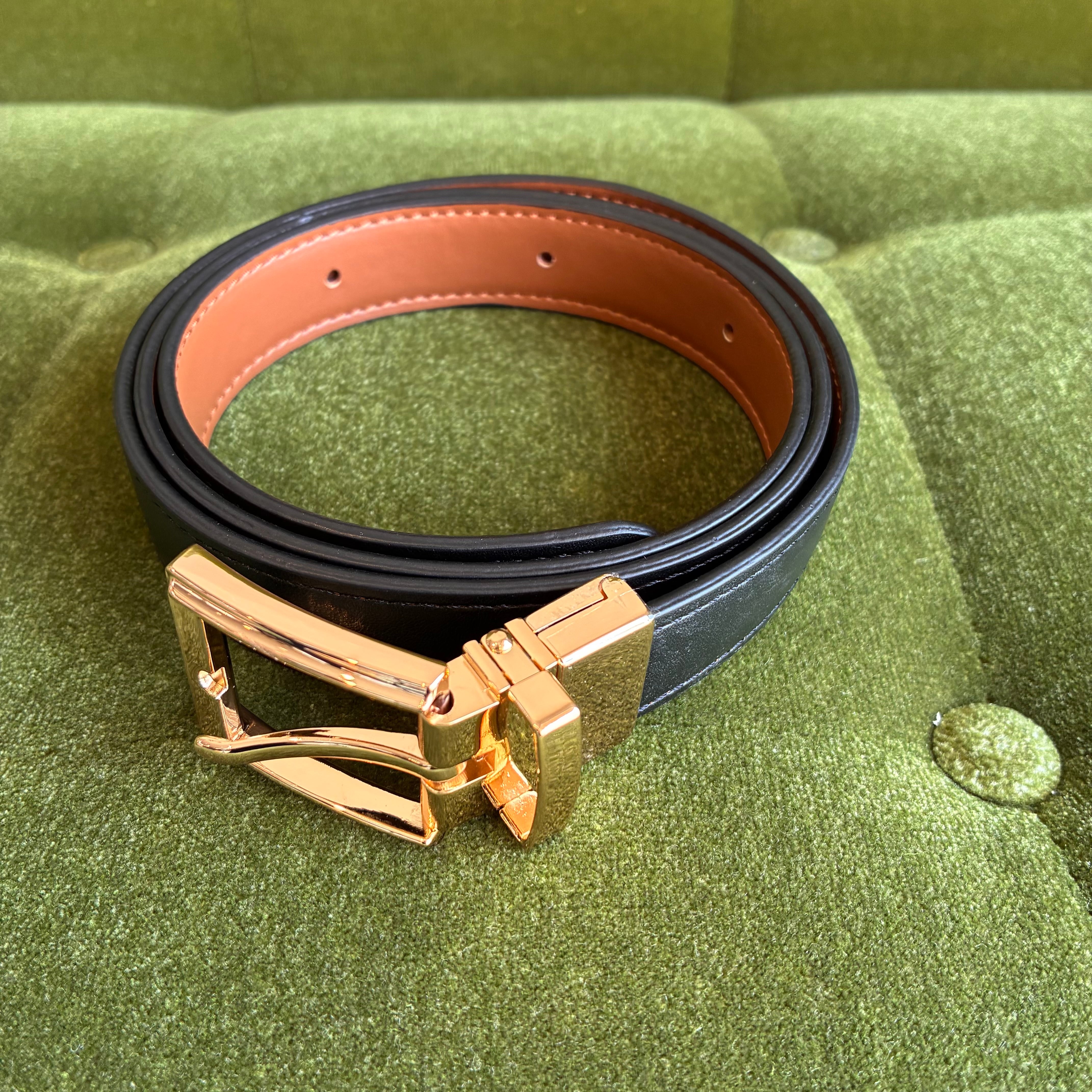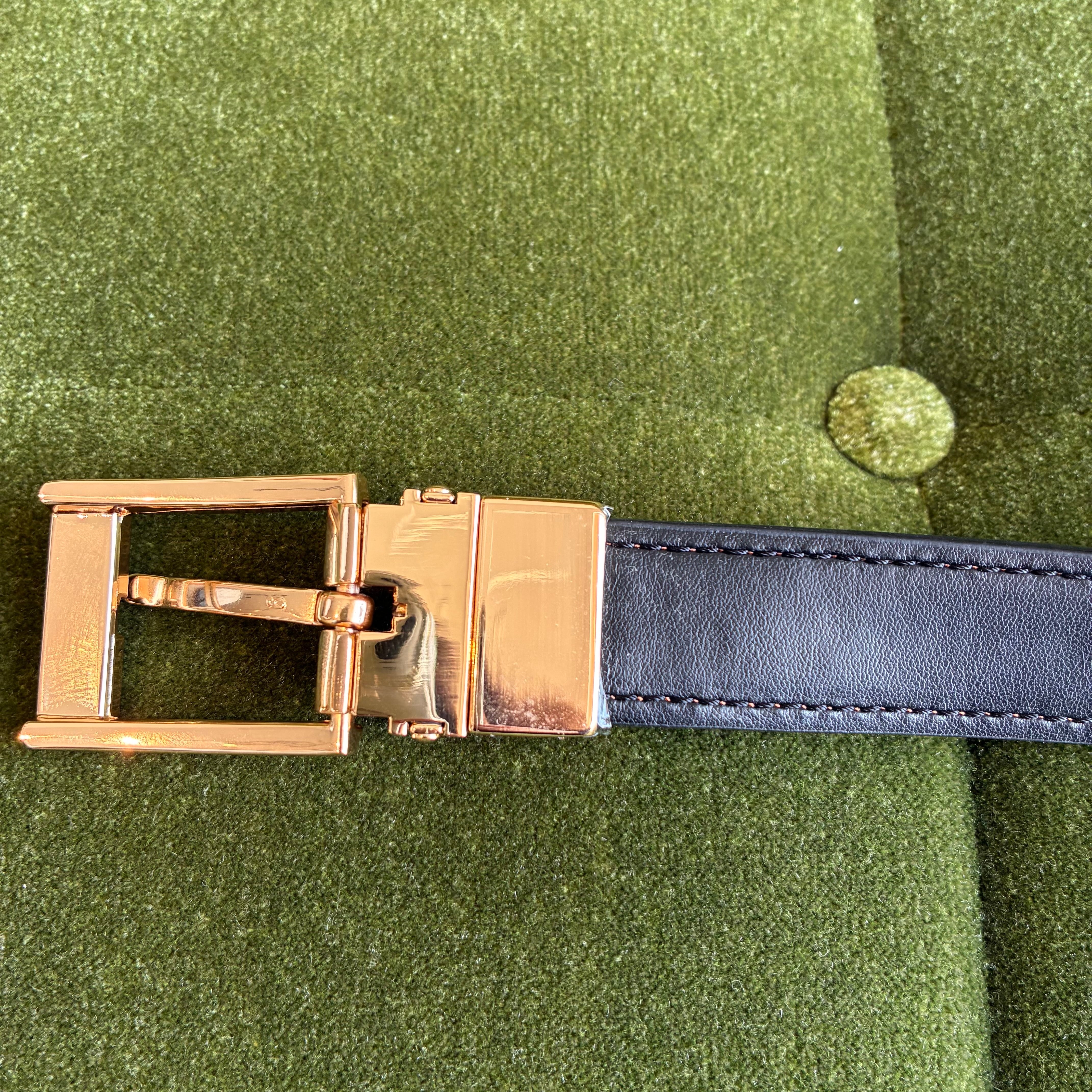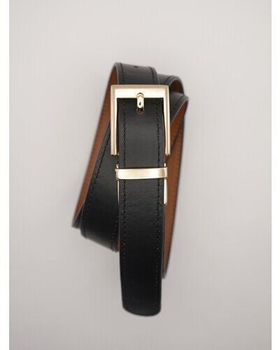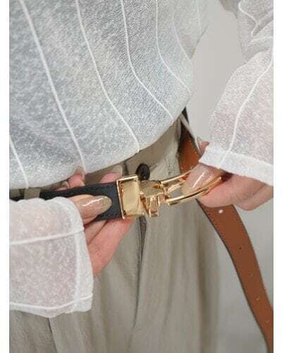 バックルを180度回転すると表裏両面使えるリバーシブル仕様の2WAYベルトです。1本で2本分楽しめるので、その日の気分やコーディネートに合わせてご使用いただけます。お色はブラウン×ブラック、形もシンプルなので様々な洋服に合わせやすい万能ベルトとなっております。ブラウン面には「CHIGNON」の押印入り。