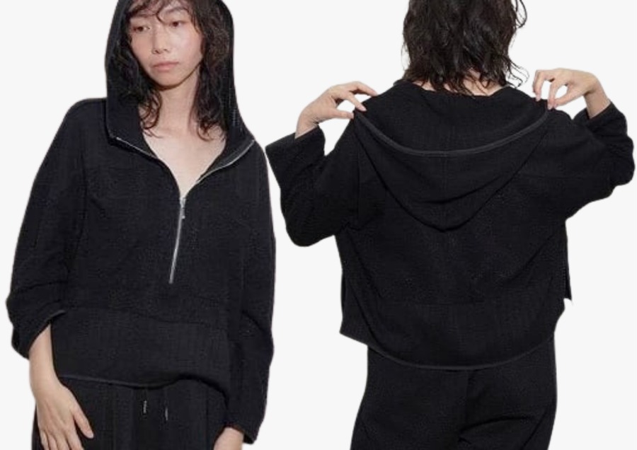 ハーフジップと立体フードで顔まわりがすっきり見えてラフなのにちゃんと洒落ます。