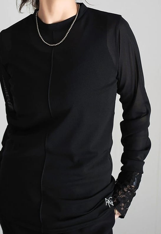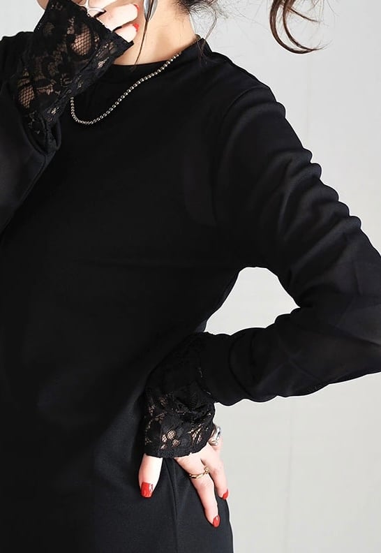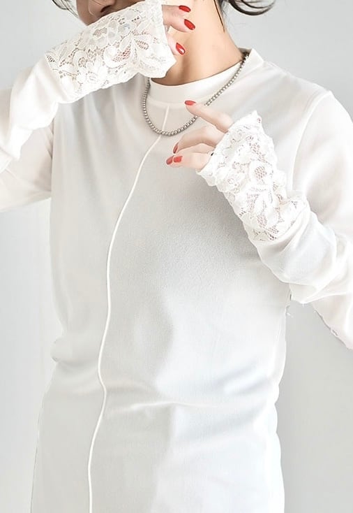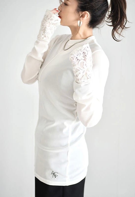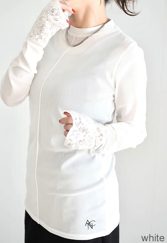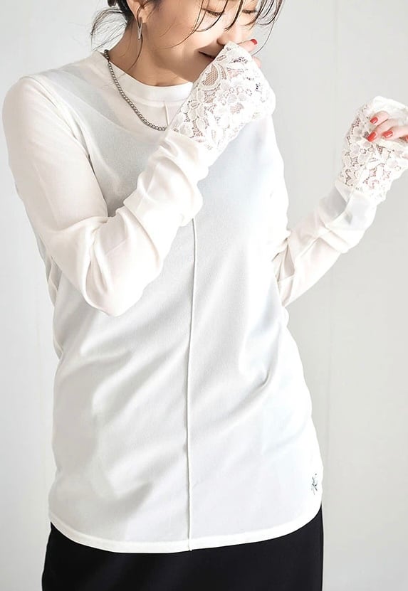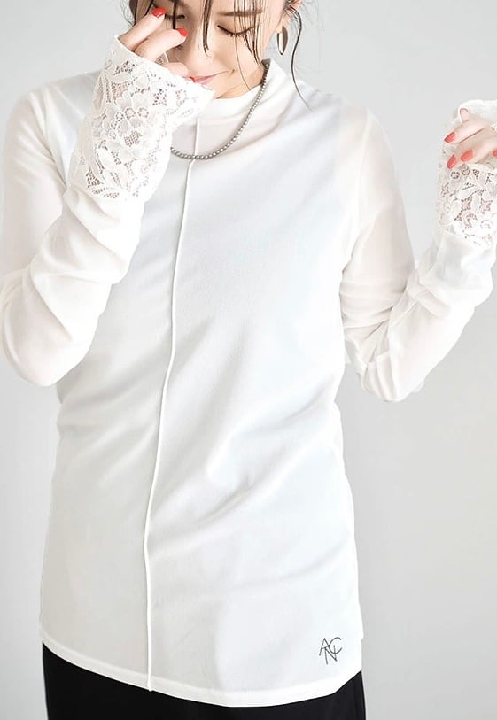 長めの袖丈の端にレースを切り替えることでアウターとの重ね着の際にポイントになる、コーディネートに合わせて何枚も欲しくなるようなアイテムです。