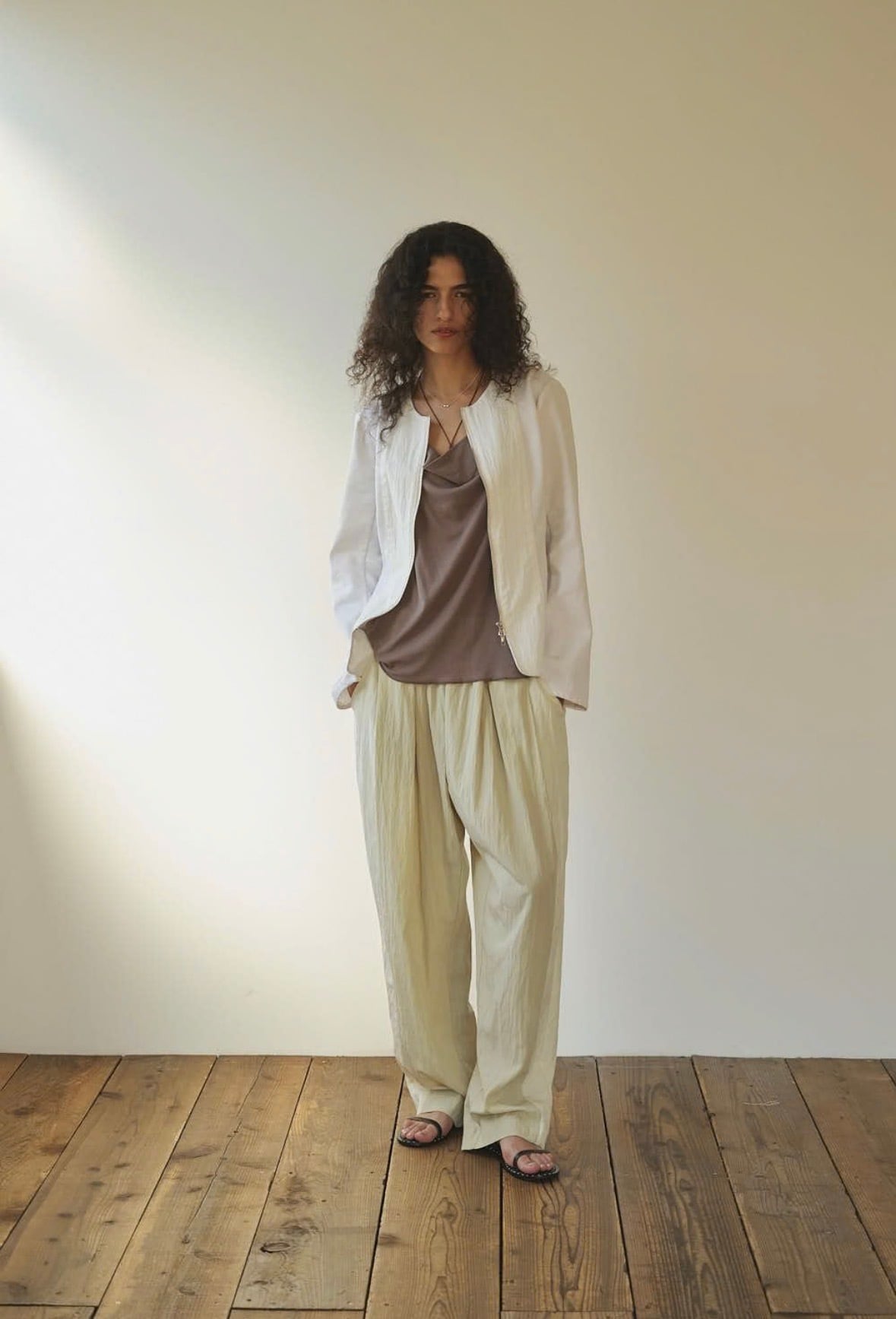 シアー素材のシャツやミニマルなタンクトップを合わせれば、涼感のある都会的スタイルが完成します。