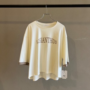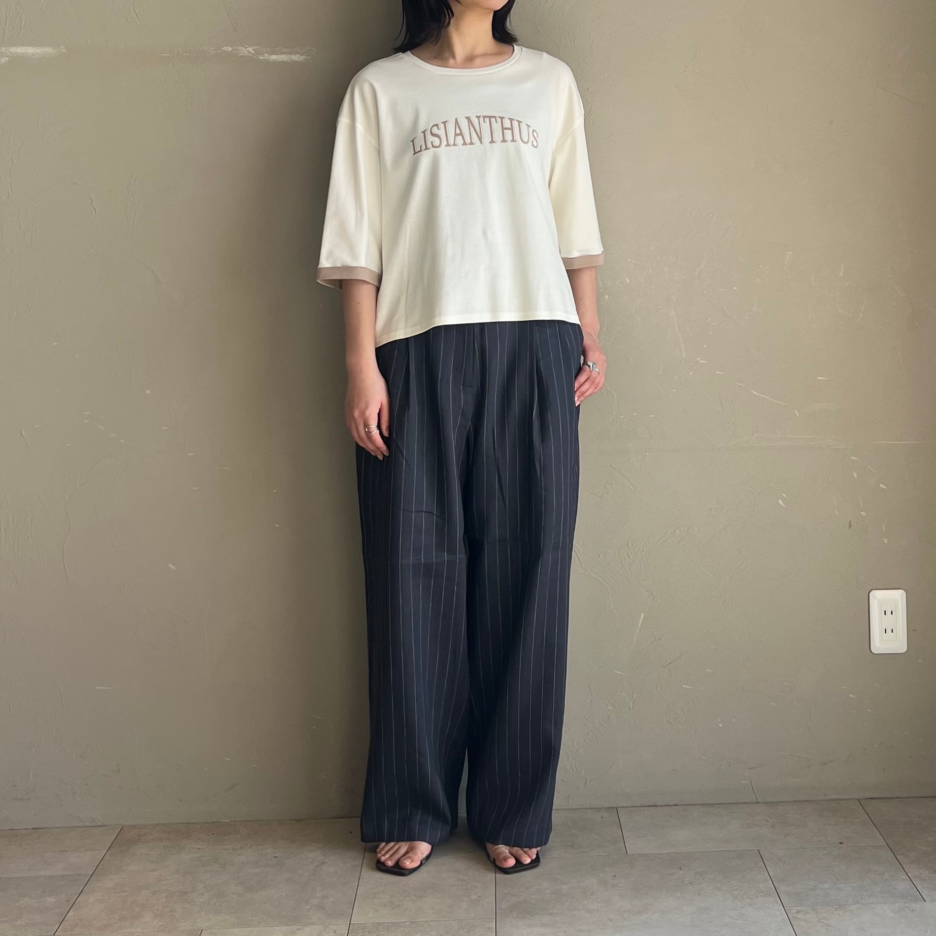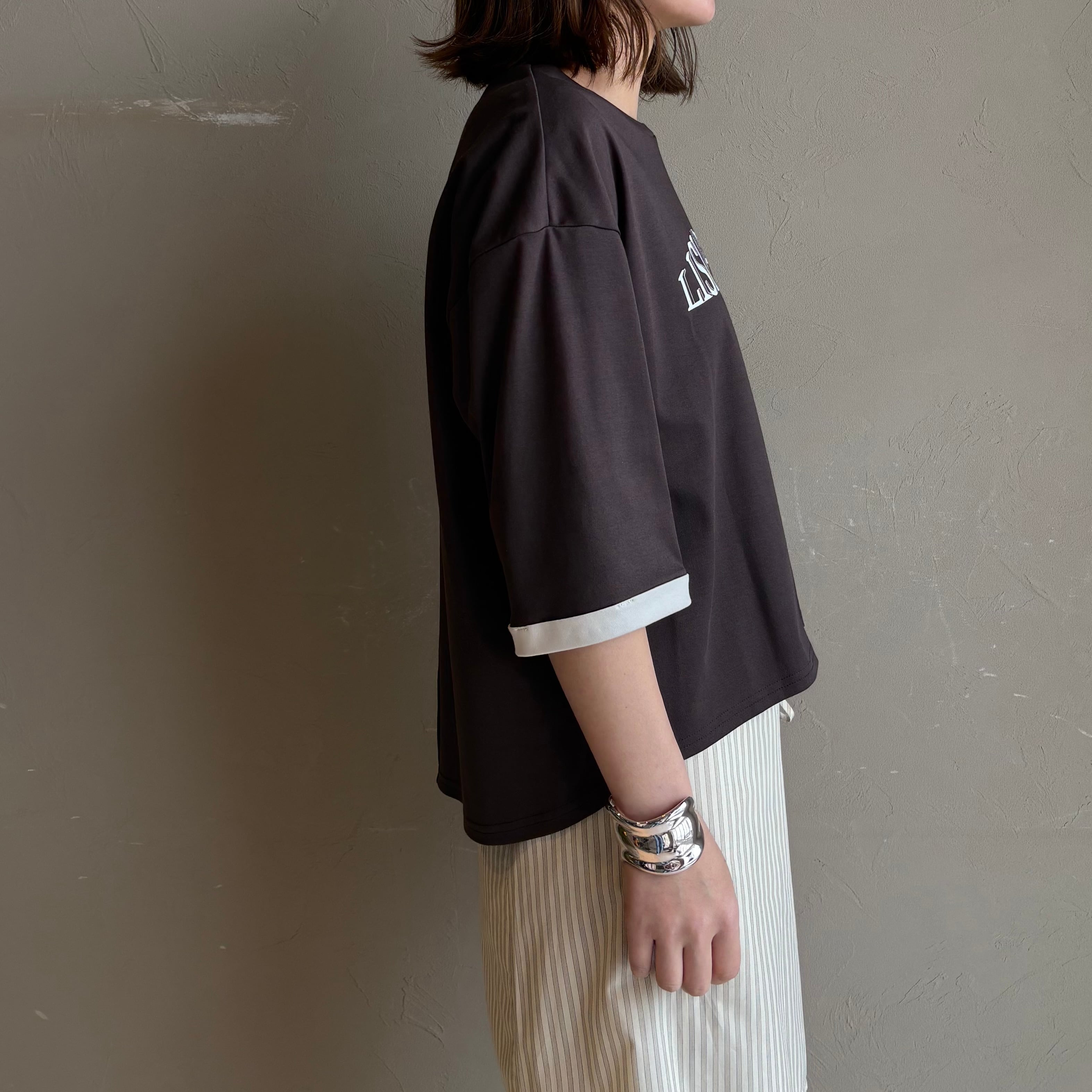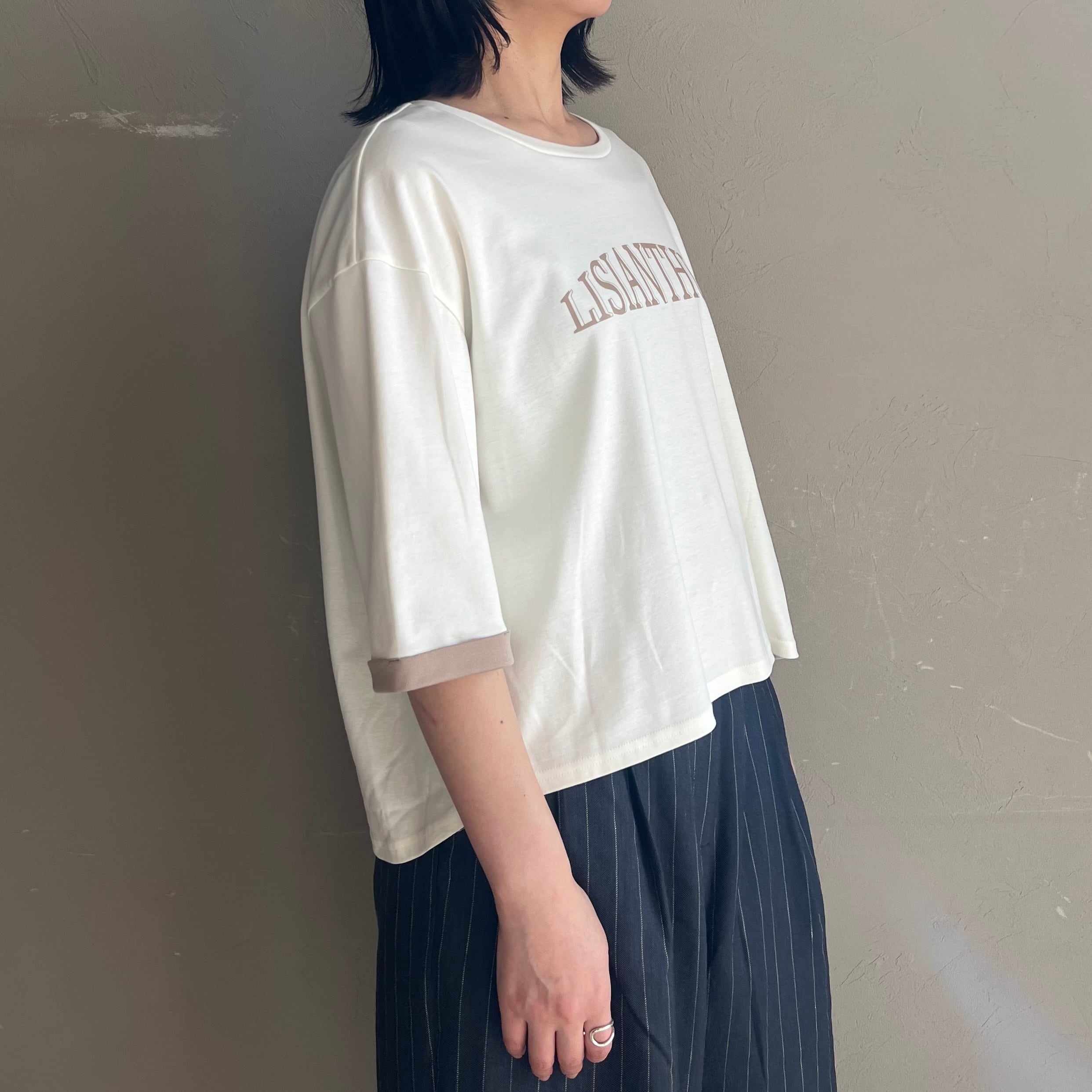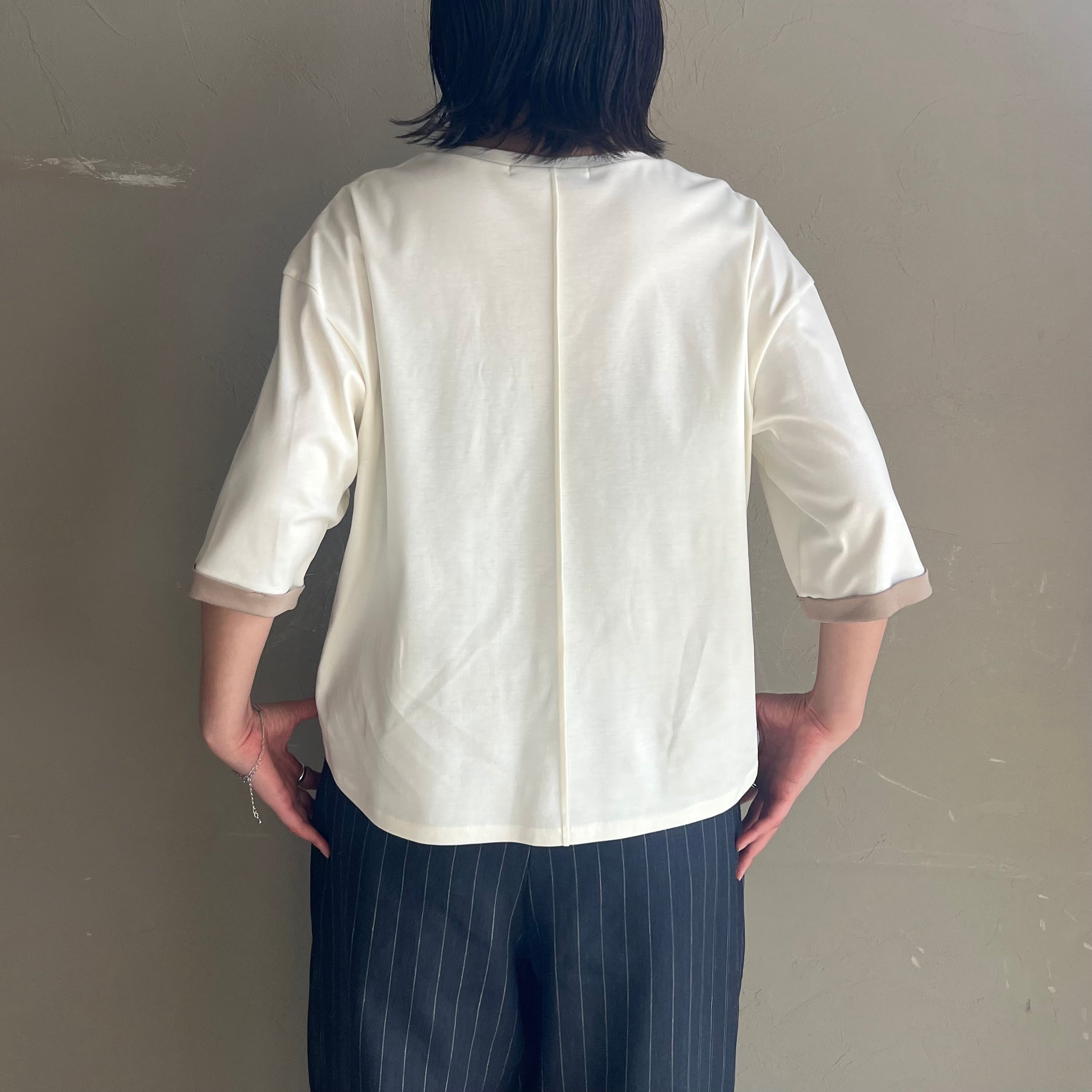 背中のピンタックが後ろ姿もこなれて見えるポイントになっており、落ち着いた配色のキレイ目ロゴTです。