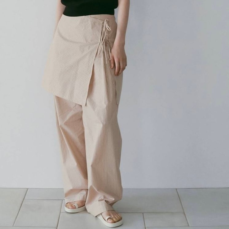 ストライプ柄のイージーパンツとラップスカートがセットになったレイヤードアイテム。