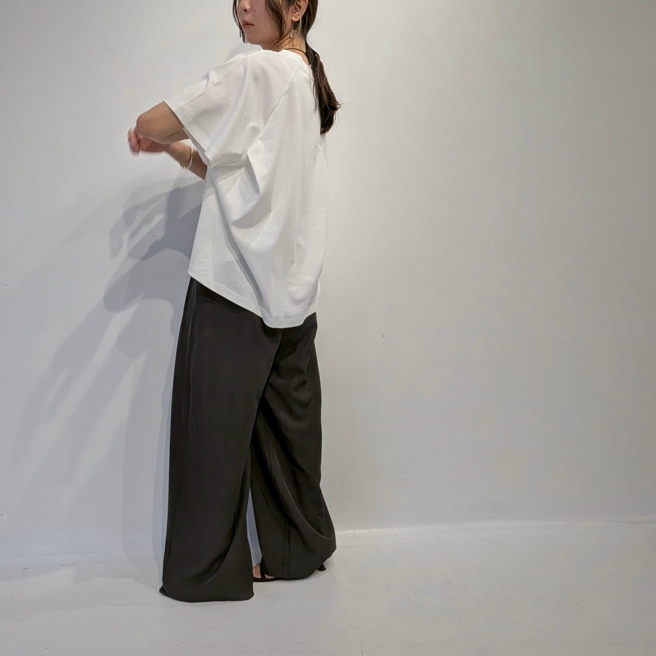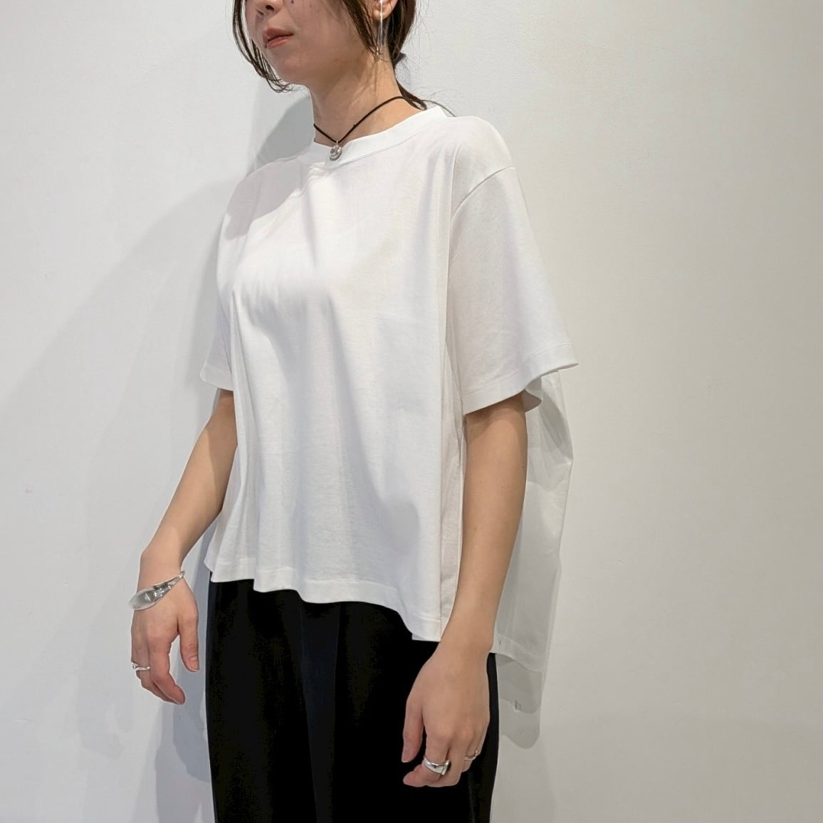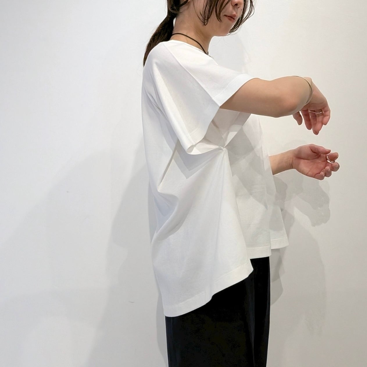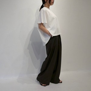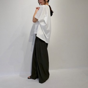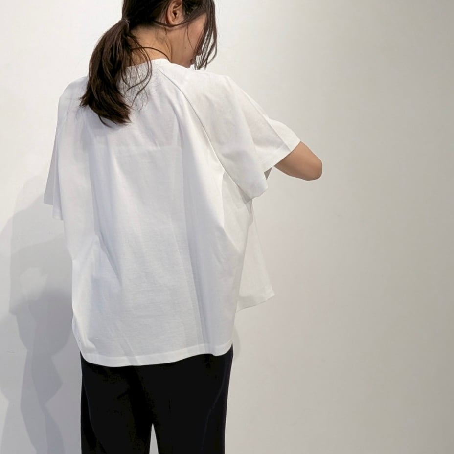 後ろのAHにタックを入れたフレアプルオーバー。AHにタックを入れることで構築的でモードな印象の1枚です。着丈に前後差をつけることでフレアシルエットでもバランスが取りやすくボトムのシルエットも選びません。