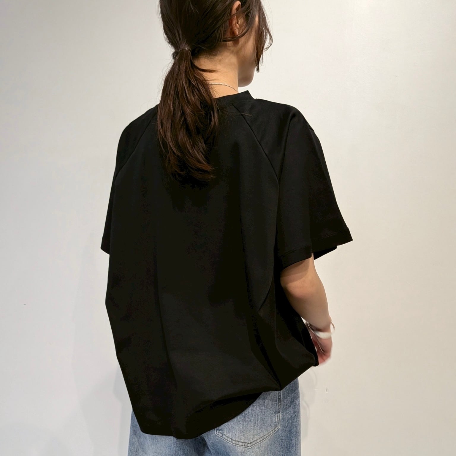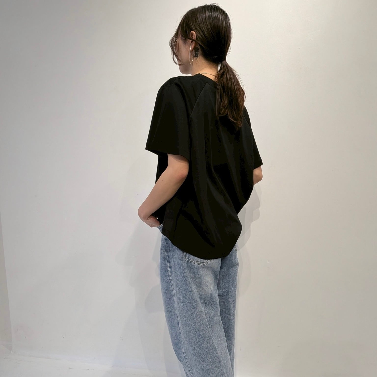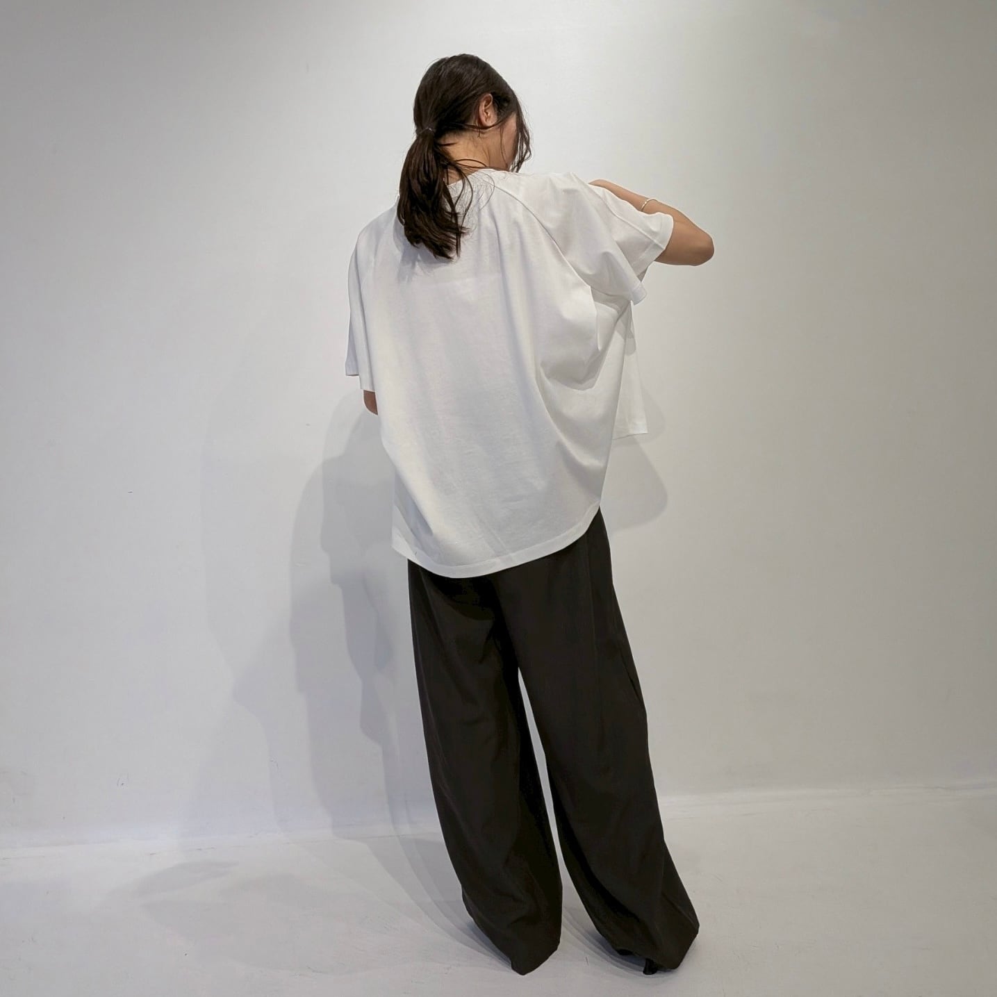 後ろのAHにタックを入れたフレアプルオーバー。AHにタックを入れることで構築的でモードな印象の1枚です。着丈に前後差をつけることでフレアシルエットでもバランスが取りやすくボトムのシルエットも選びません。