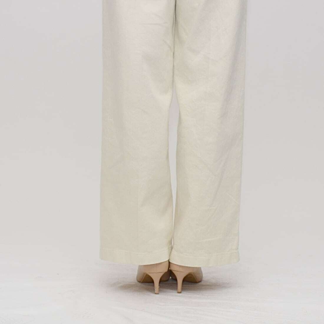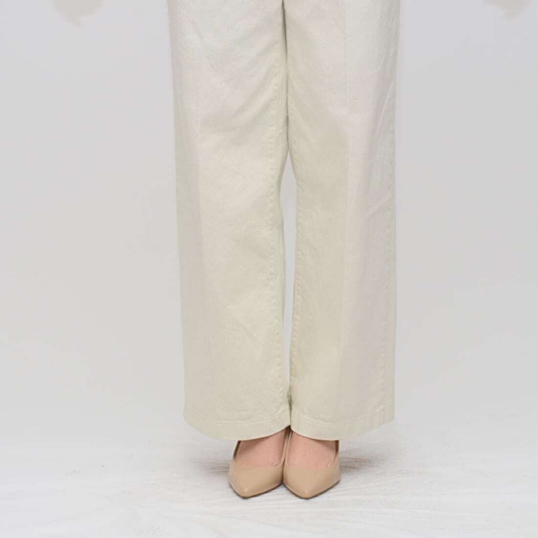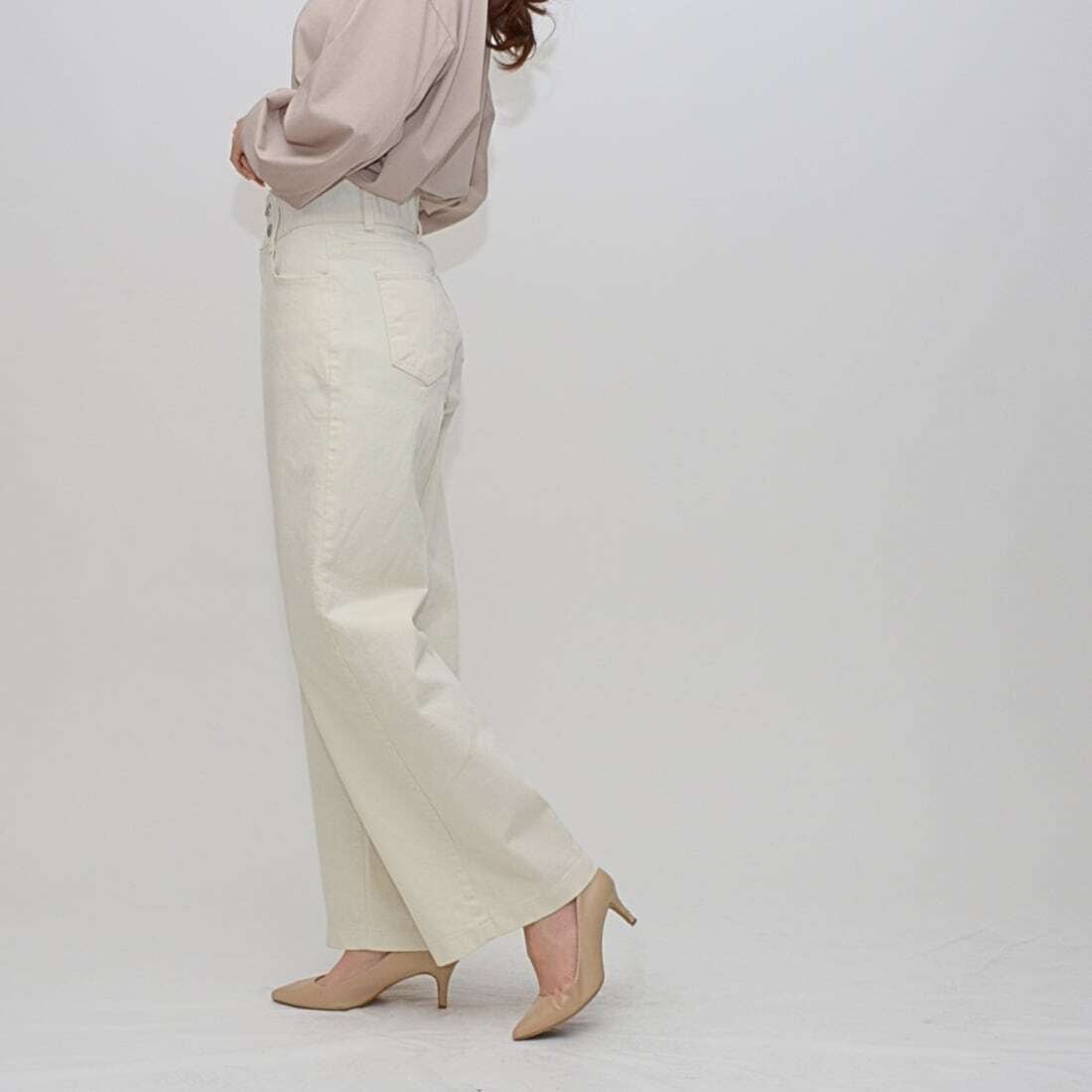 シルエットは、膝から裾にかけてまっすぐ流れるような今旬の「セミワイドシルエット」。