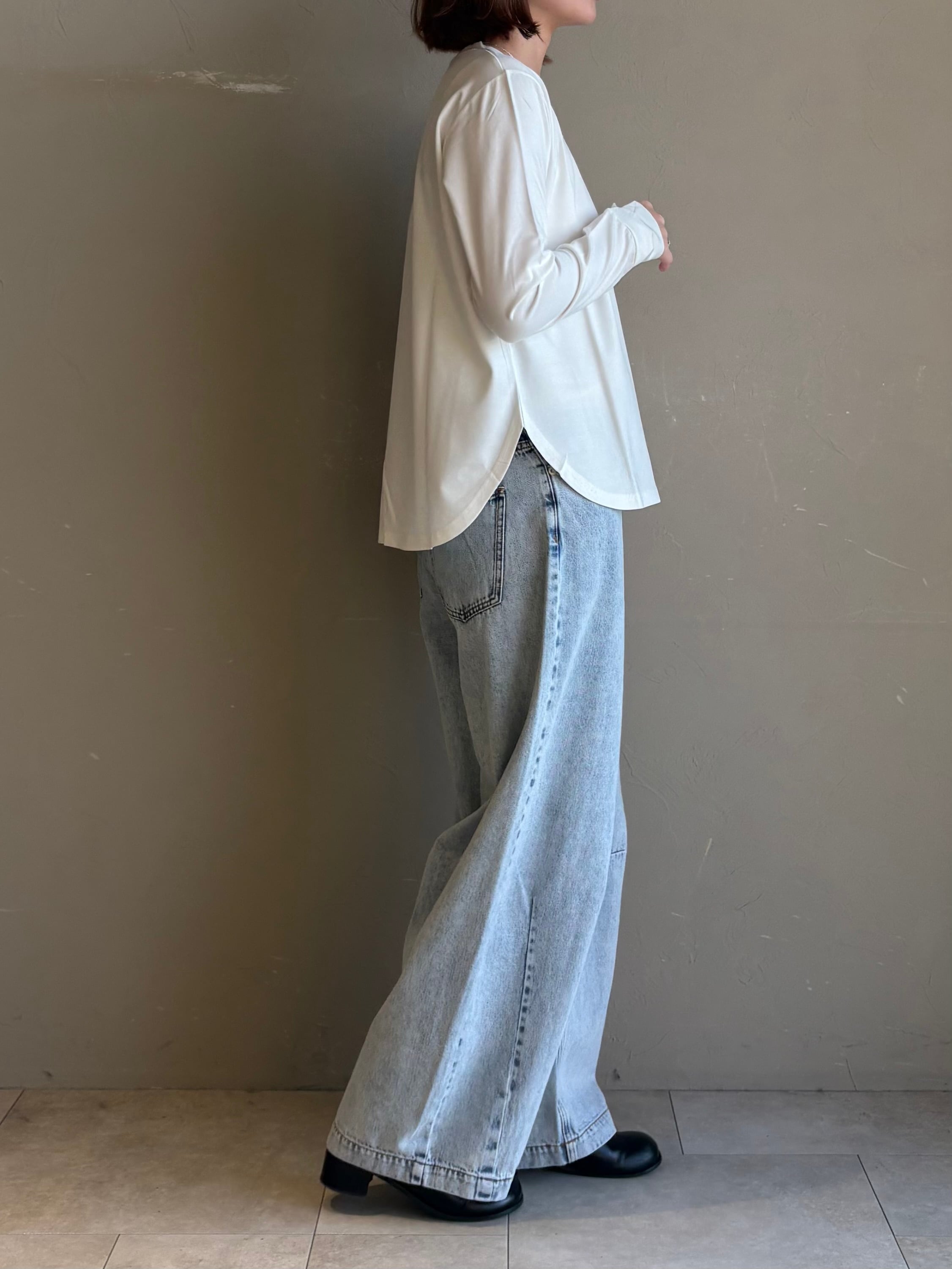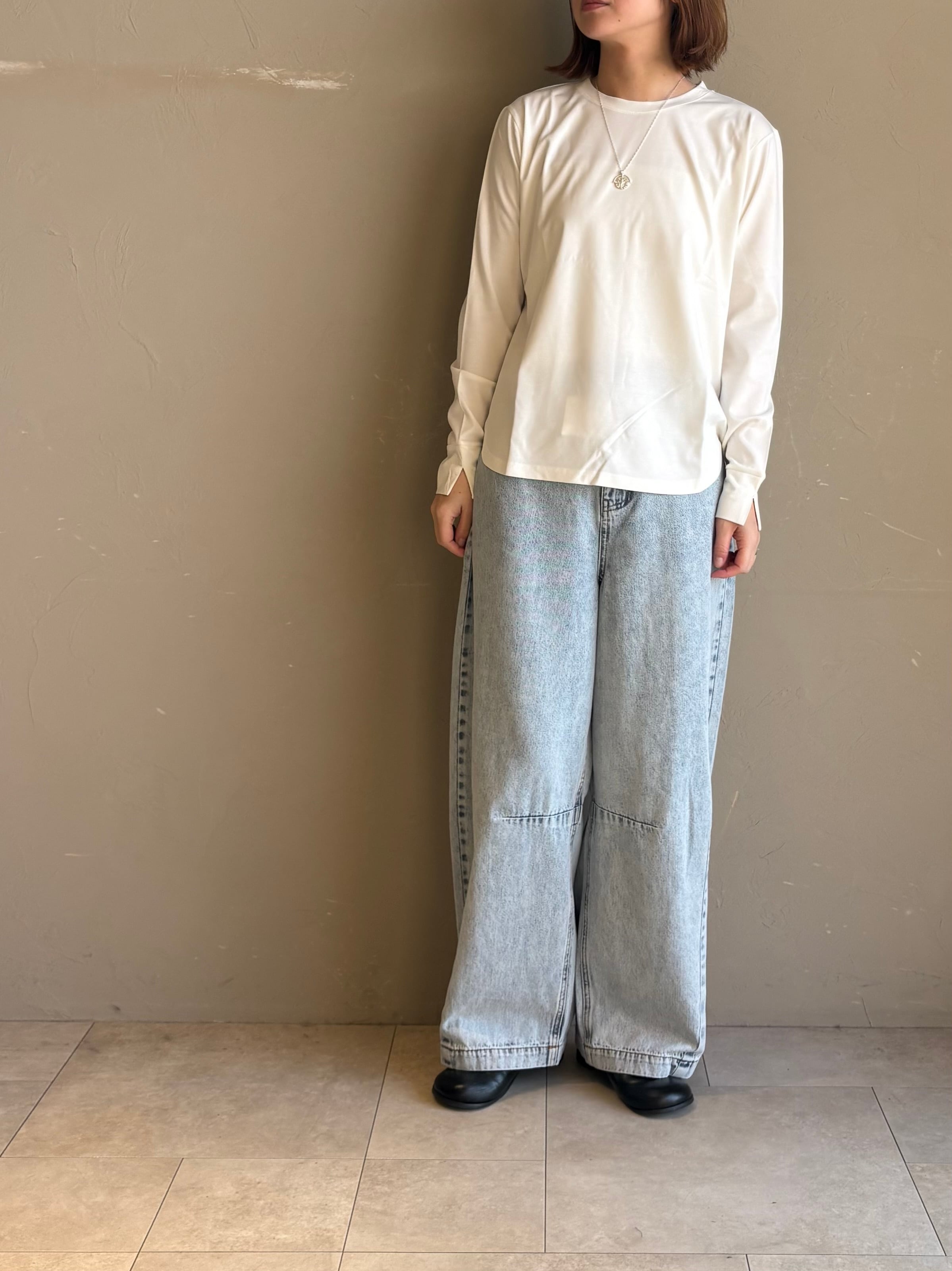 レイヤードしやすいラウンドヘムのロンTはコンパクトなサイズ感なのでショート丈などとの相性も◎