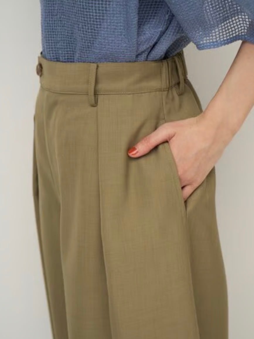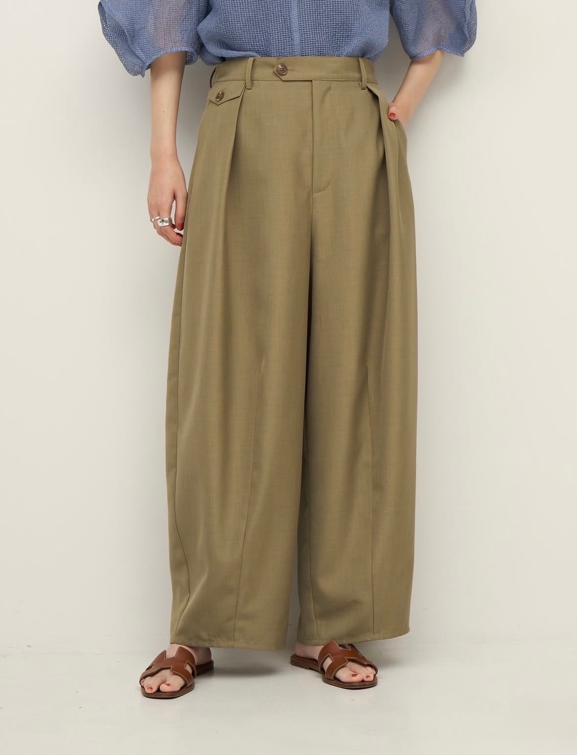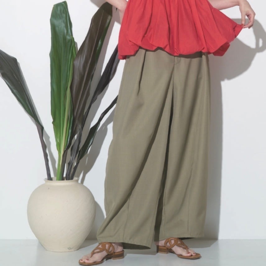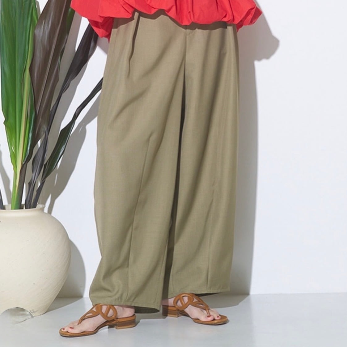 程よいハリのある素材なのでキレイなコクーンシルエットに。後より前側に分量感を多く設定し、ボリュームを感じながらもスッキリとしたラインで、コーディネートしやすいボトムになっています。メンズライクなスラックスをイメージしたウォッチポケットもアクセント。単品使いではもちろん、