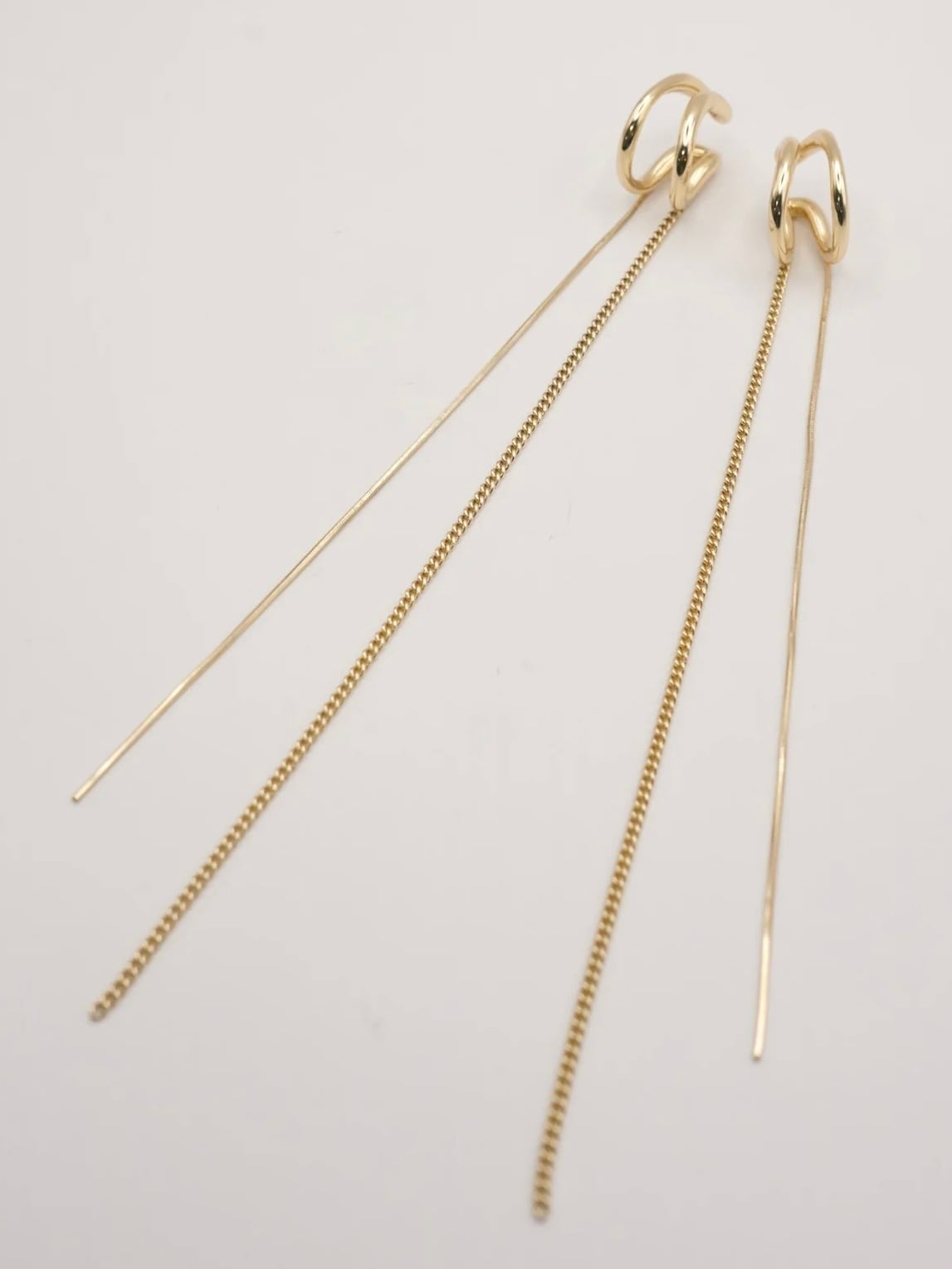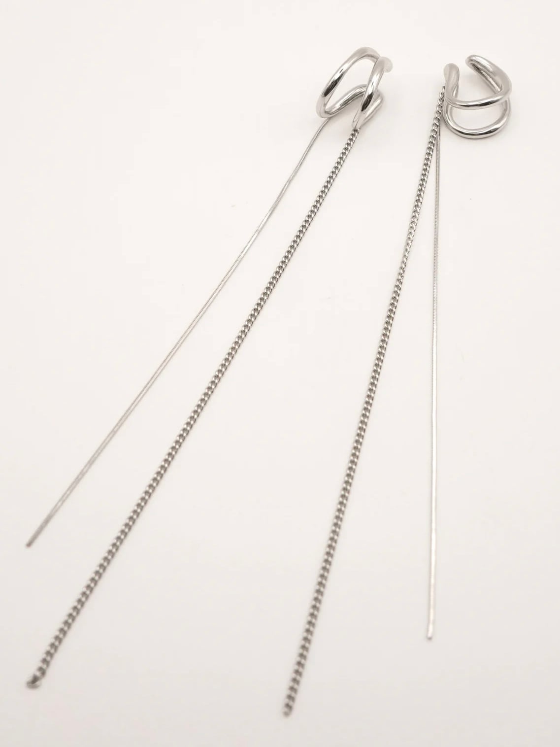 強弱のある線形で描かれたダブルラインのイヤカフに、きらっと揺れる2種類のロングチェーンが施された上品なデザインとなっております。