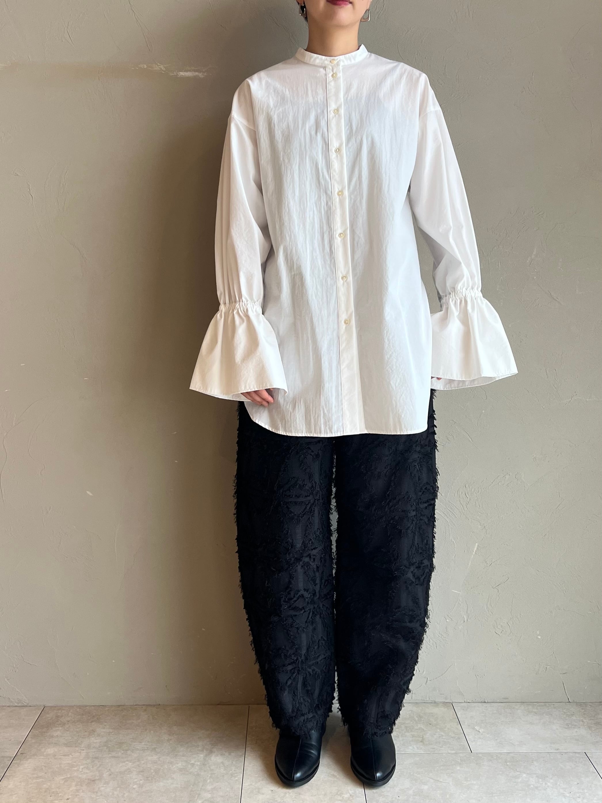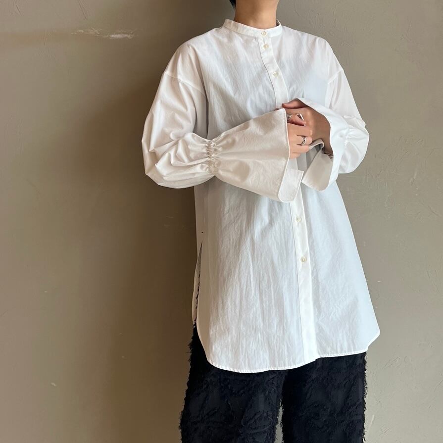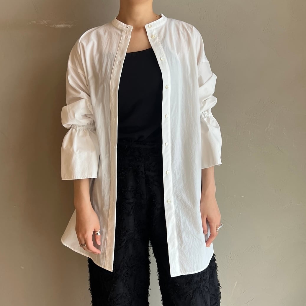 オーバーに作られたシルエットや、しっかりとした生地で、キャンディスリーブでも甘さを抑えたブラウスです。