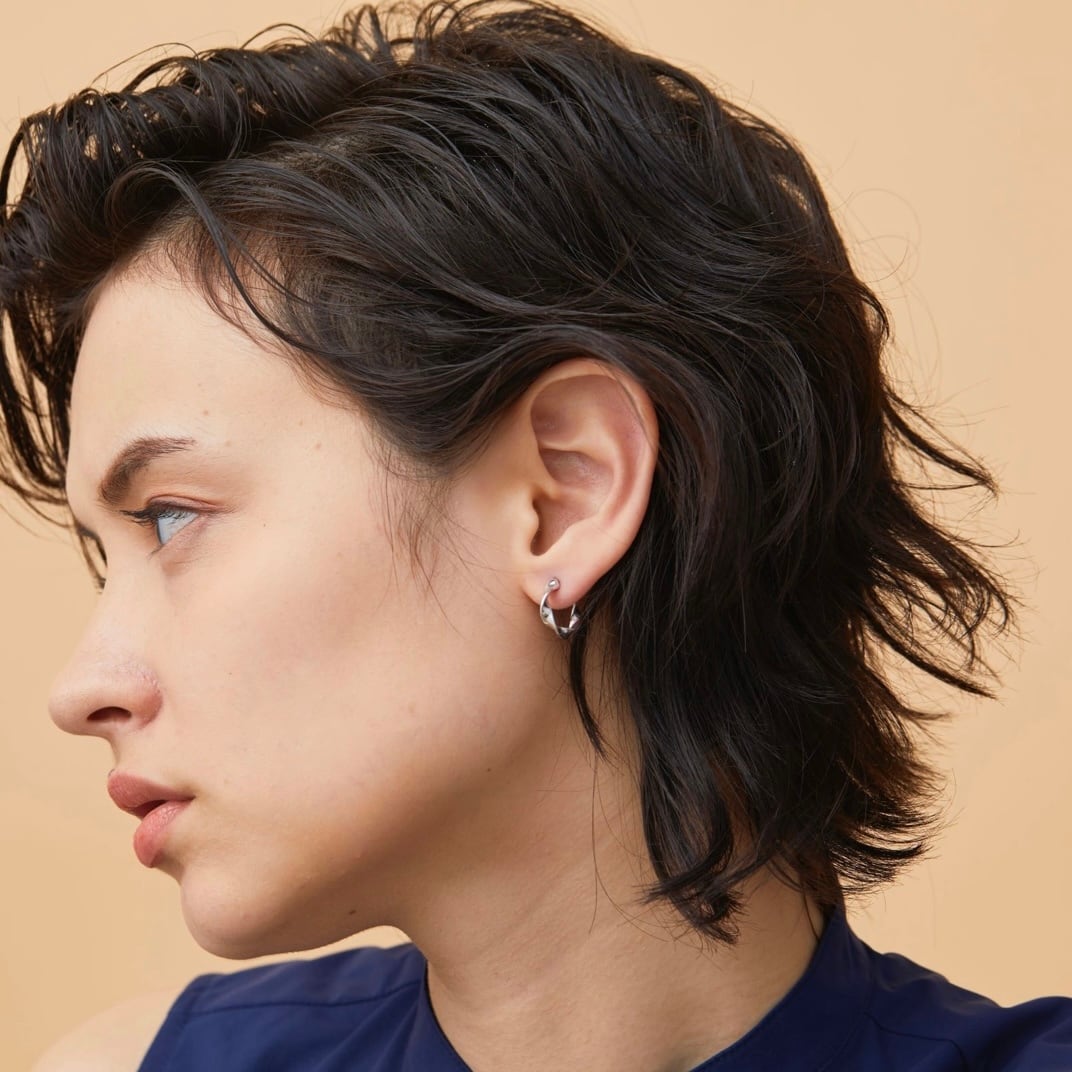 フープ部分には高級感のある925シルバーを、軸部分は金属アレルギー反応が出にくいサージカルステンレスを採用しました。リュクスさをプラスしてくれるゴールドカラーモデルと、洗練された雰囲気を醸し出すシルバーカラーモデル、どちらもON/OFF問わず様々なシーンで活躍するデザインです。