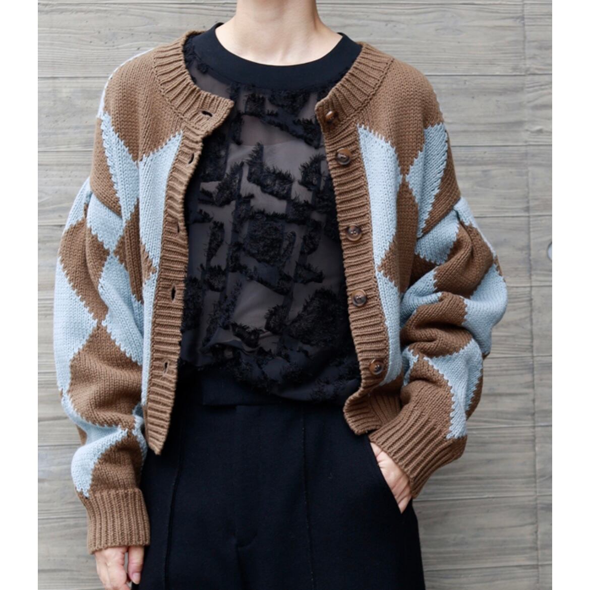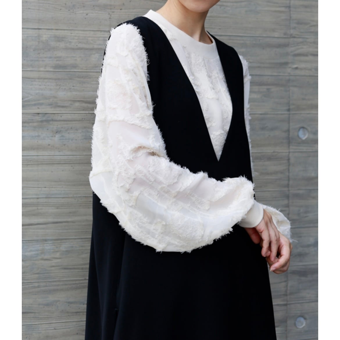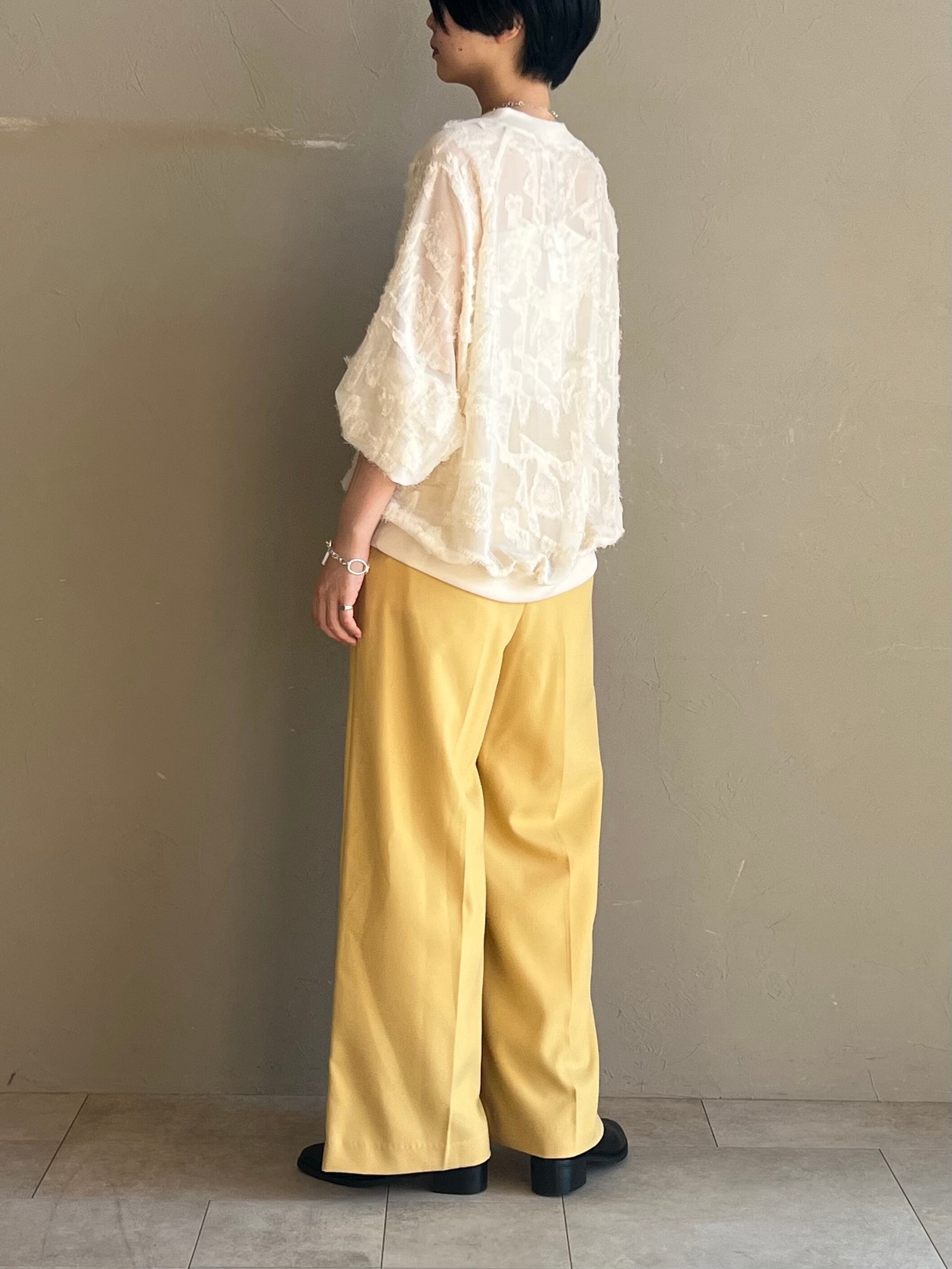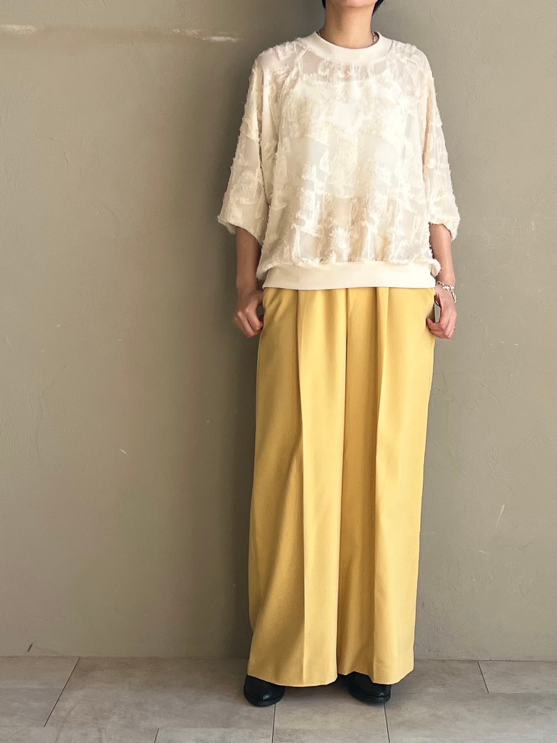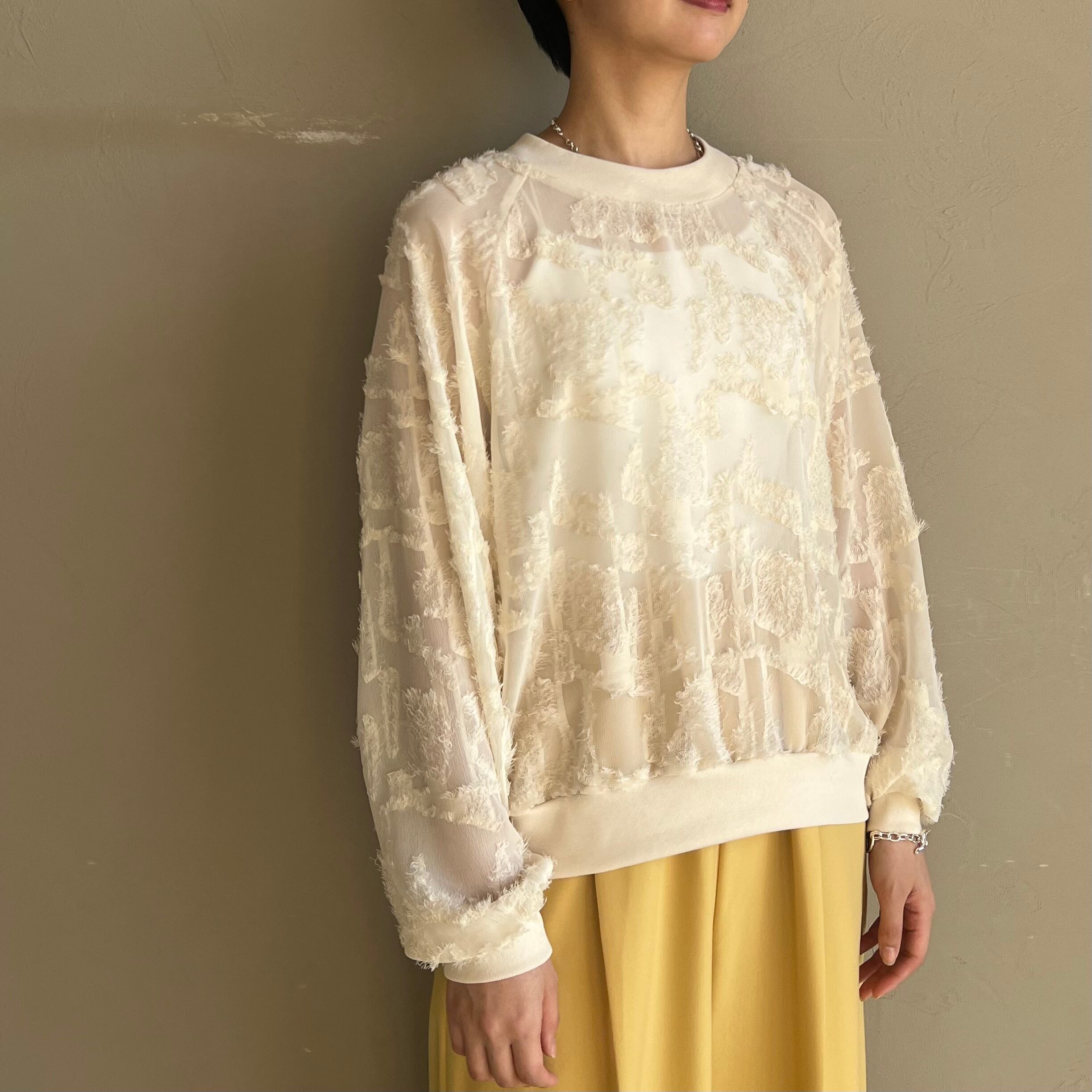 浮き立つジャガードと透け感のあるシアー素材でインパクトのあるプルオーバー。